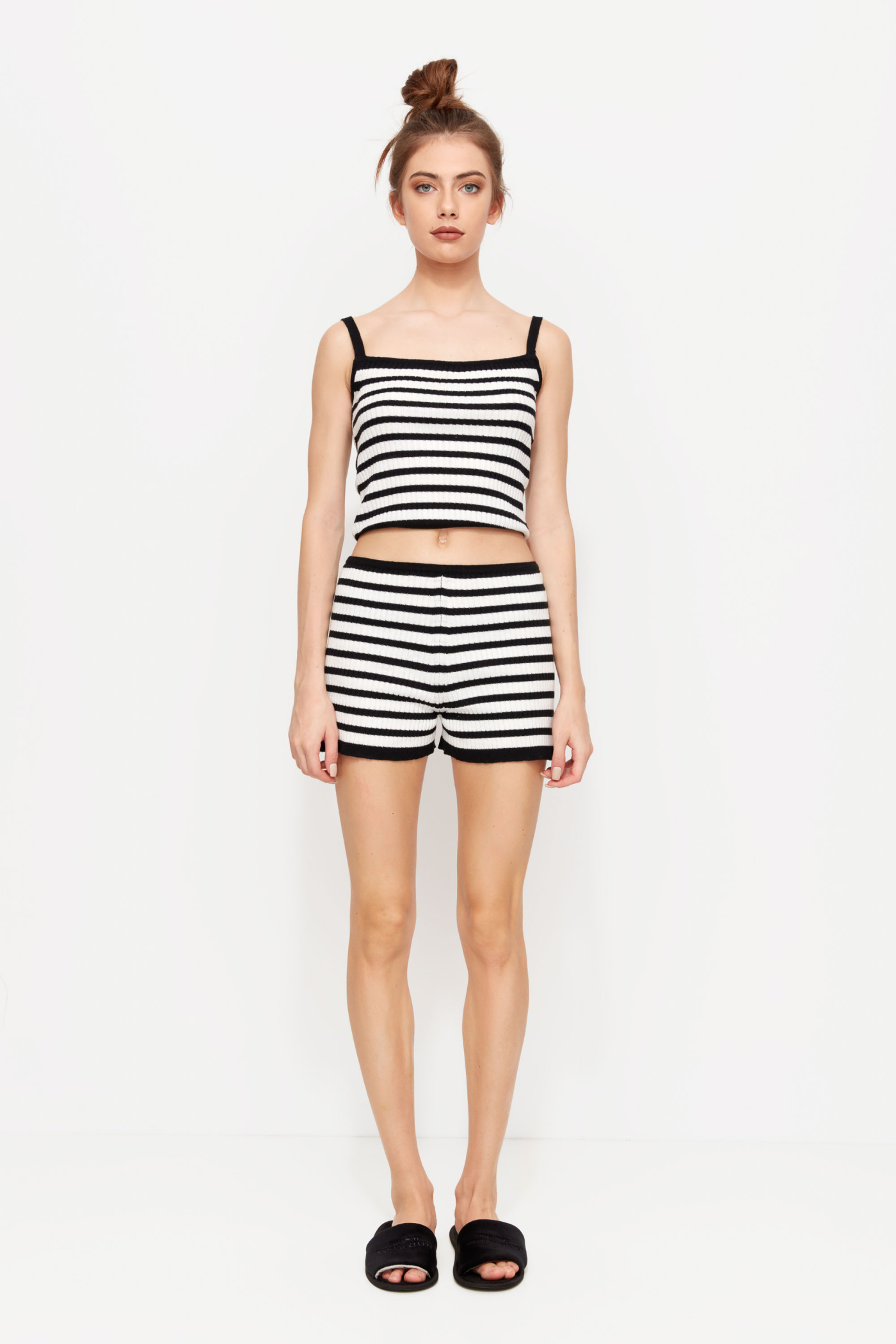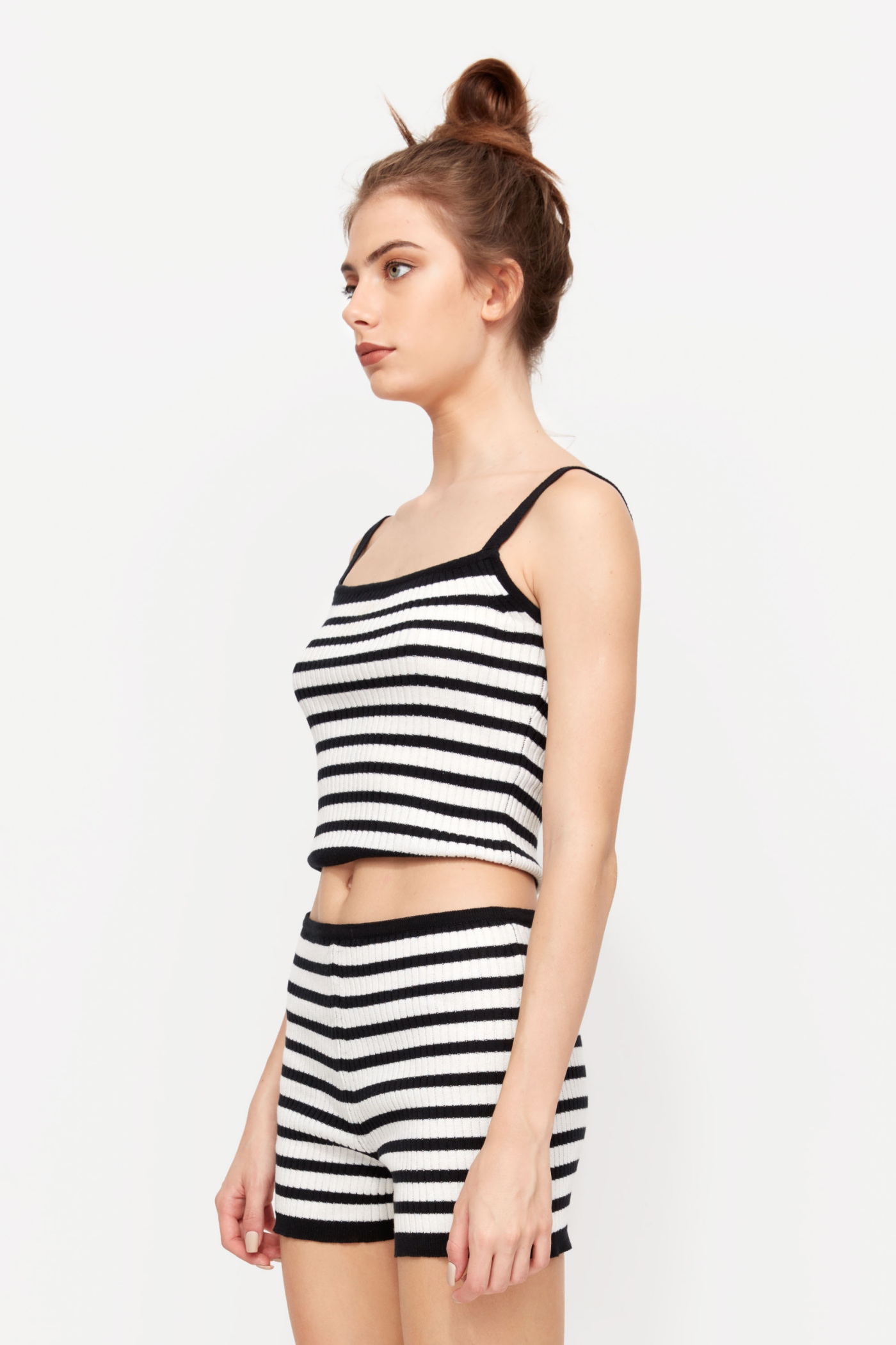 Вязаный топ на бретелях прилегающего силуэта, укороченной длины. Базовая модель, которую можно носить как с жакетами, так и с рубашками и кардиганами.