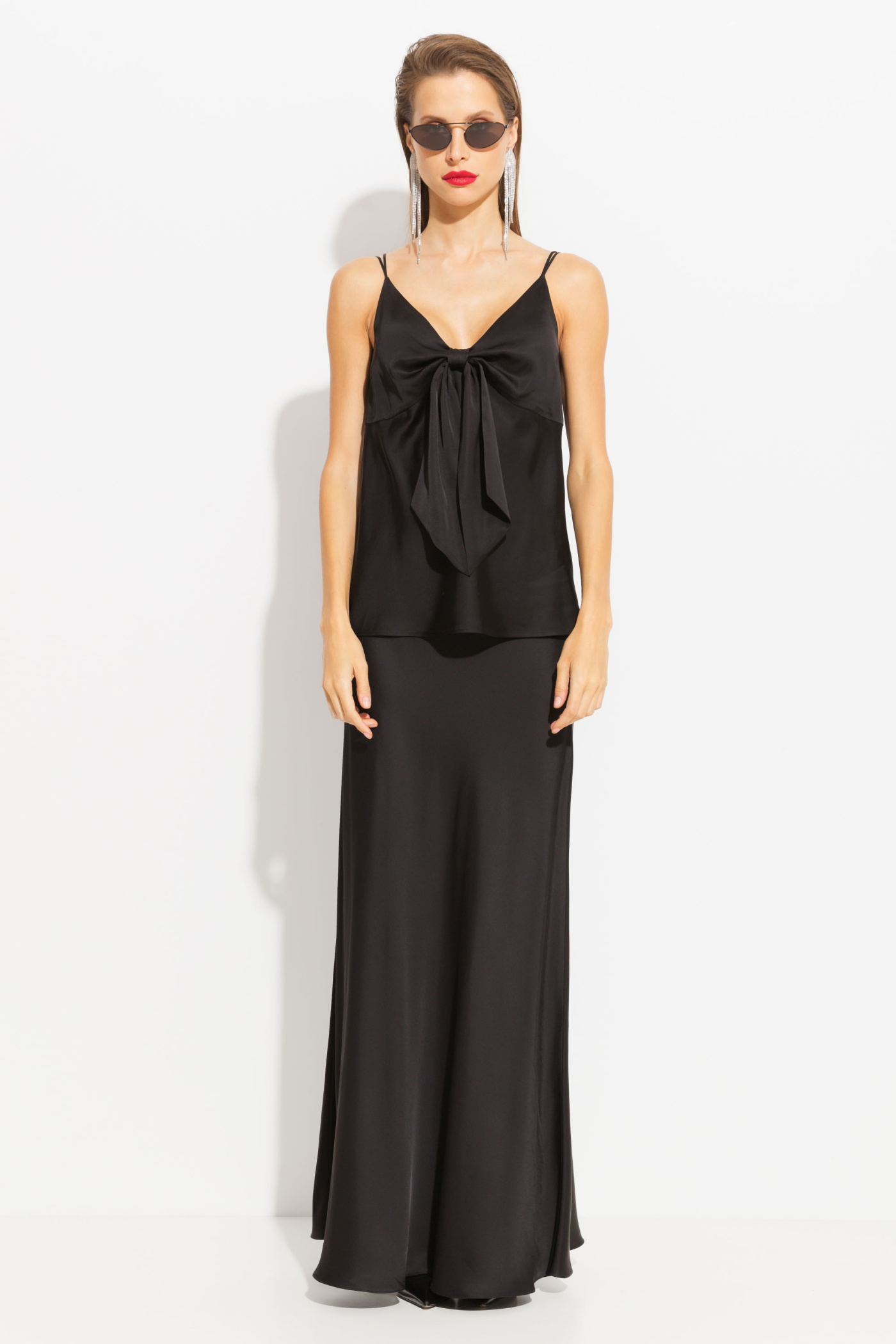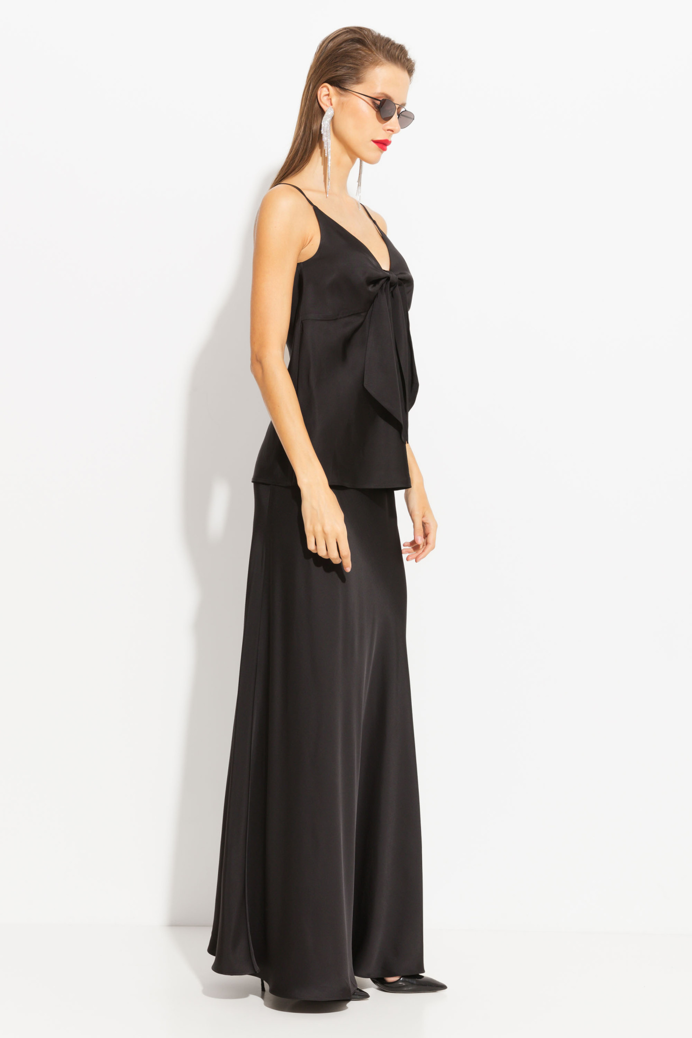 Блуза полуприлегающего силуэта, на бретелях. Перед изделия декорирован бантом. V-образный вырез горловины. Универсальная модель, которая сочетается с любым низом и типом обуви.