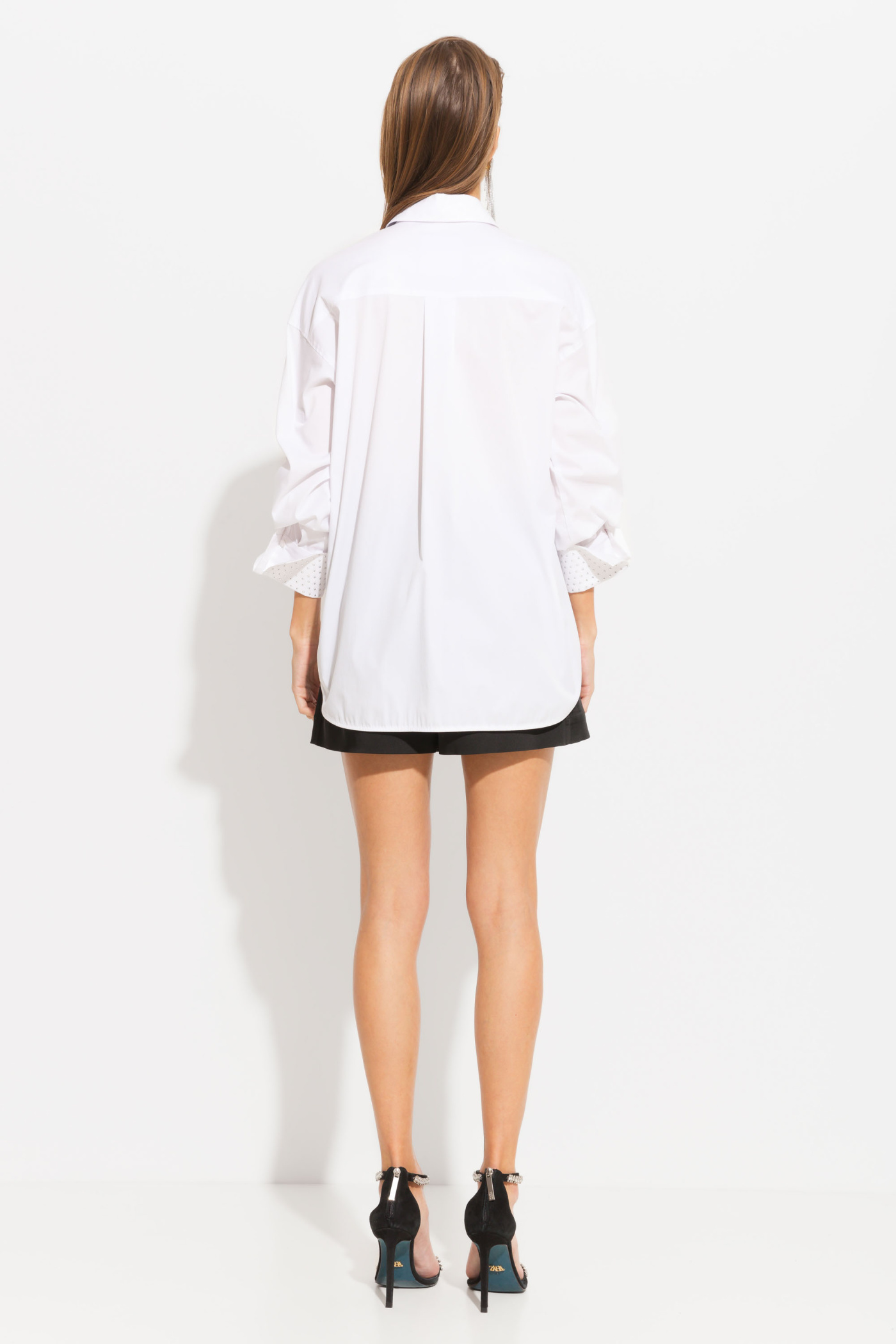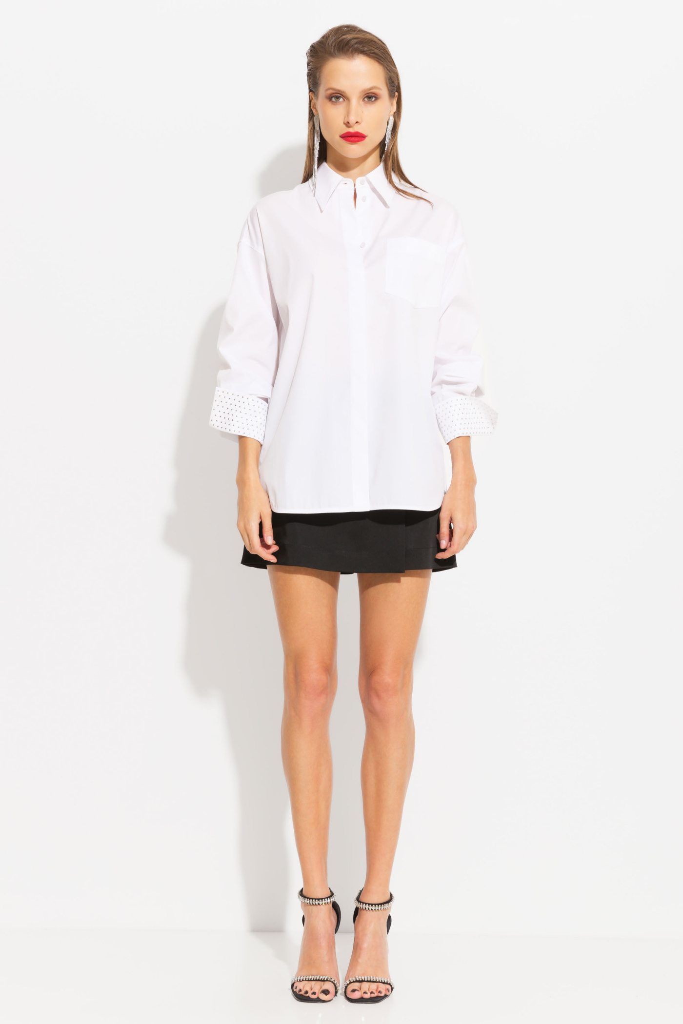 Блуза прямого кроя, длиной ниже линии бедер. Воротник стояче-отложной. На груди накладной карман. Манжеты рукавов широкие, декорированные металлическими стразами. Классическая, незаурядная модель для создания образов в любом стиле.