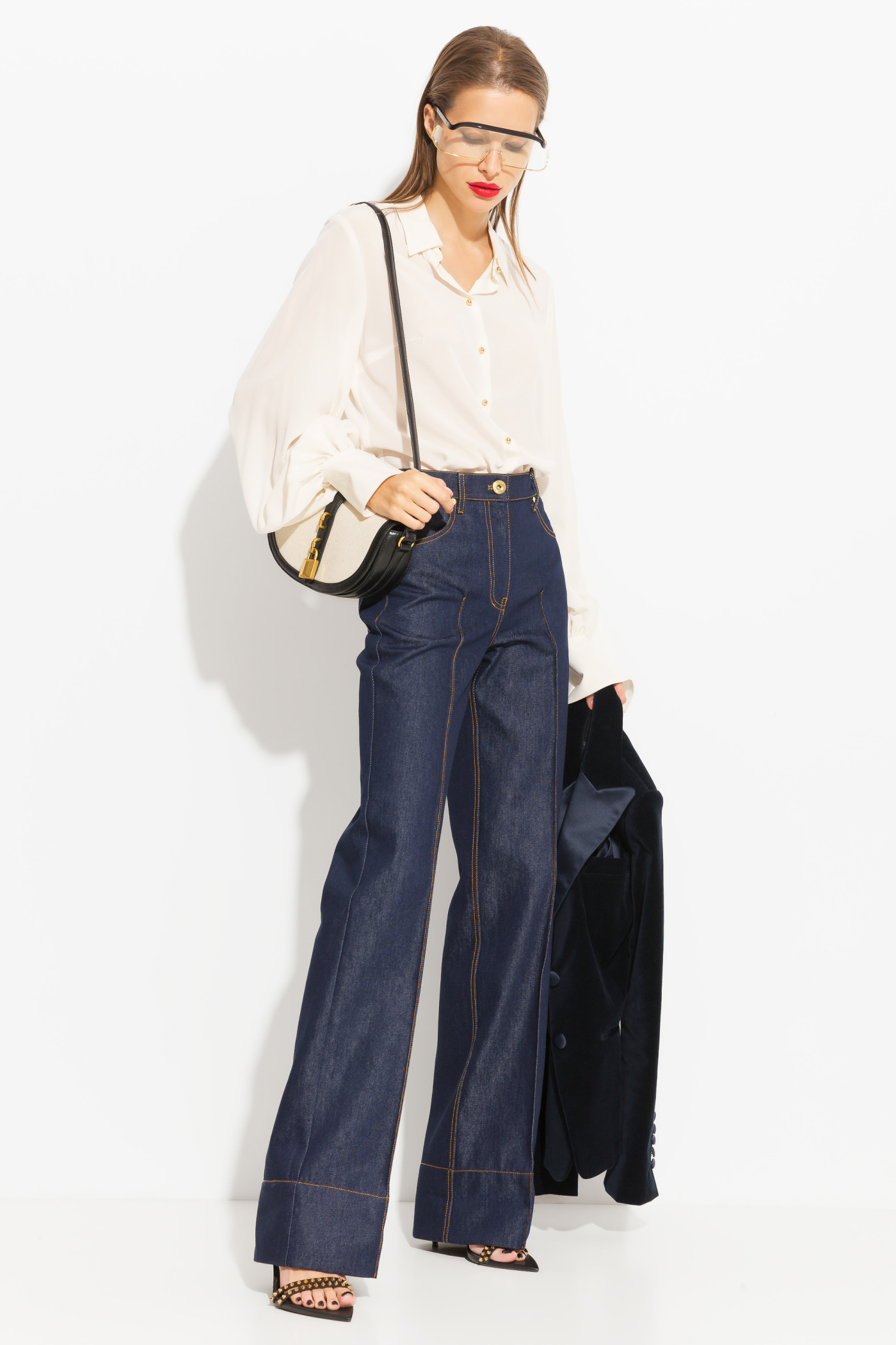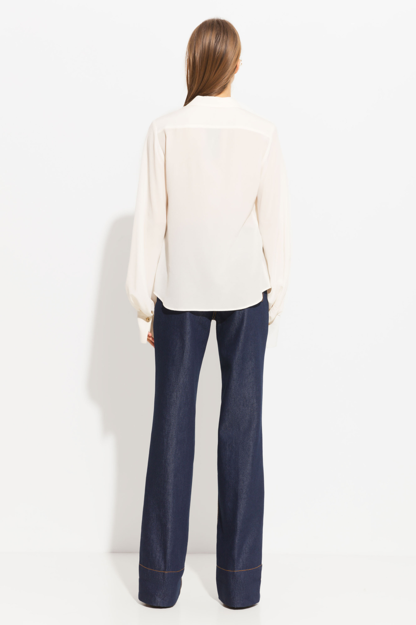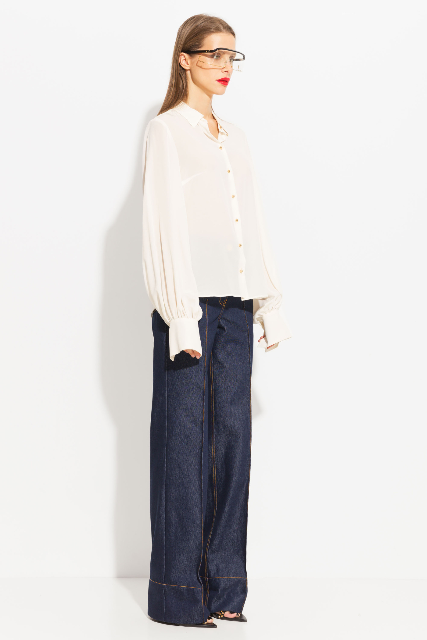 Блуза прямого кроя, длиной выше линии бедер. Воротник отложной. Объемные рукава с широкими манжетами. Застегивается на пуговицы контрастного цвета. Эффектная, классическая модель, которая подойдет к любому типу гардероба и по любому случаю.