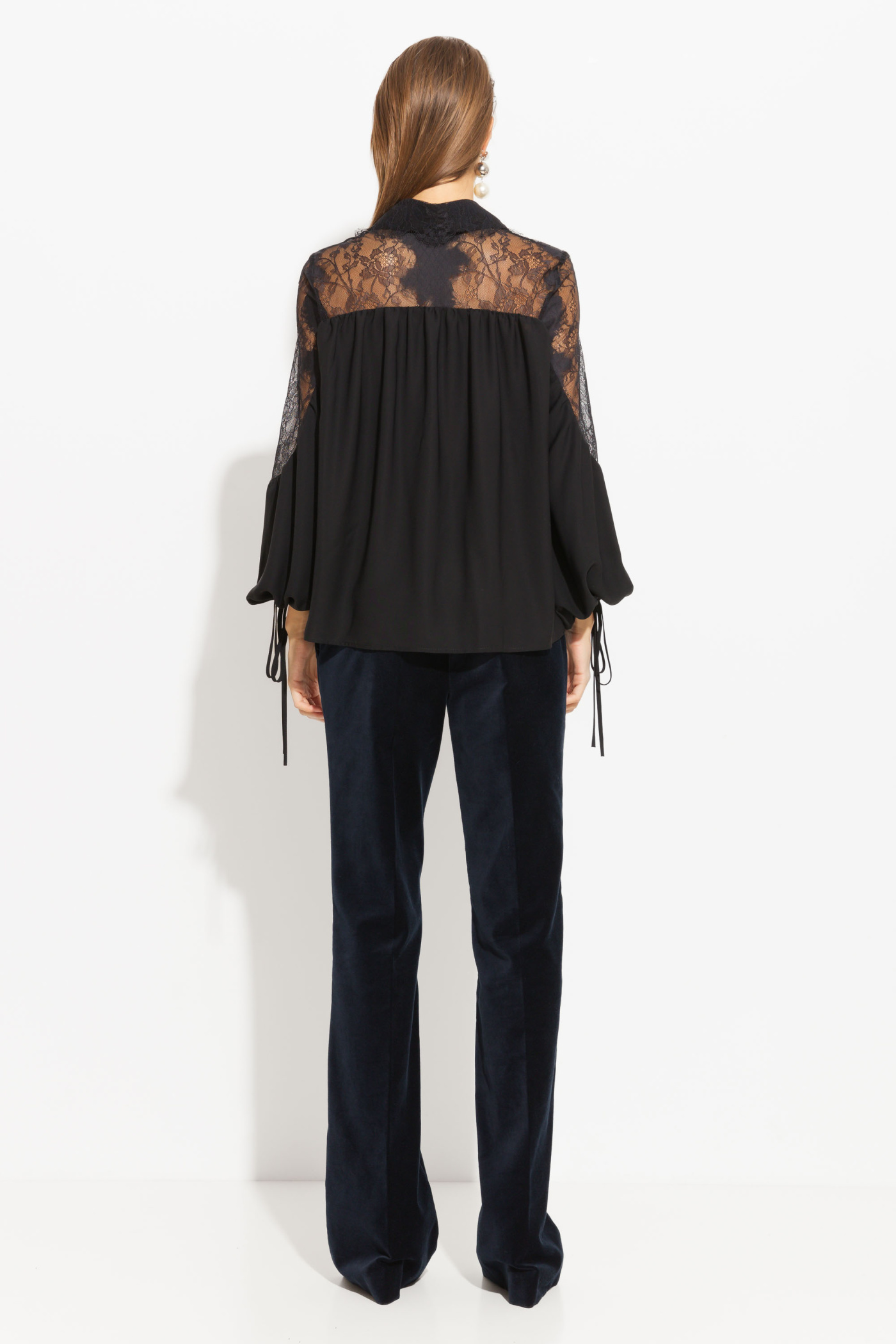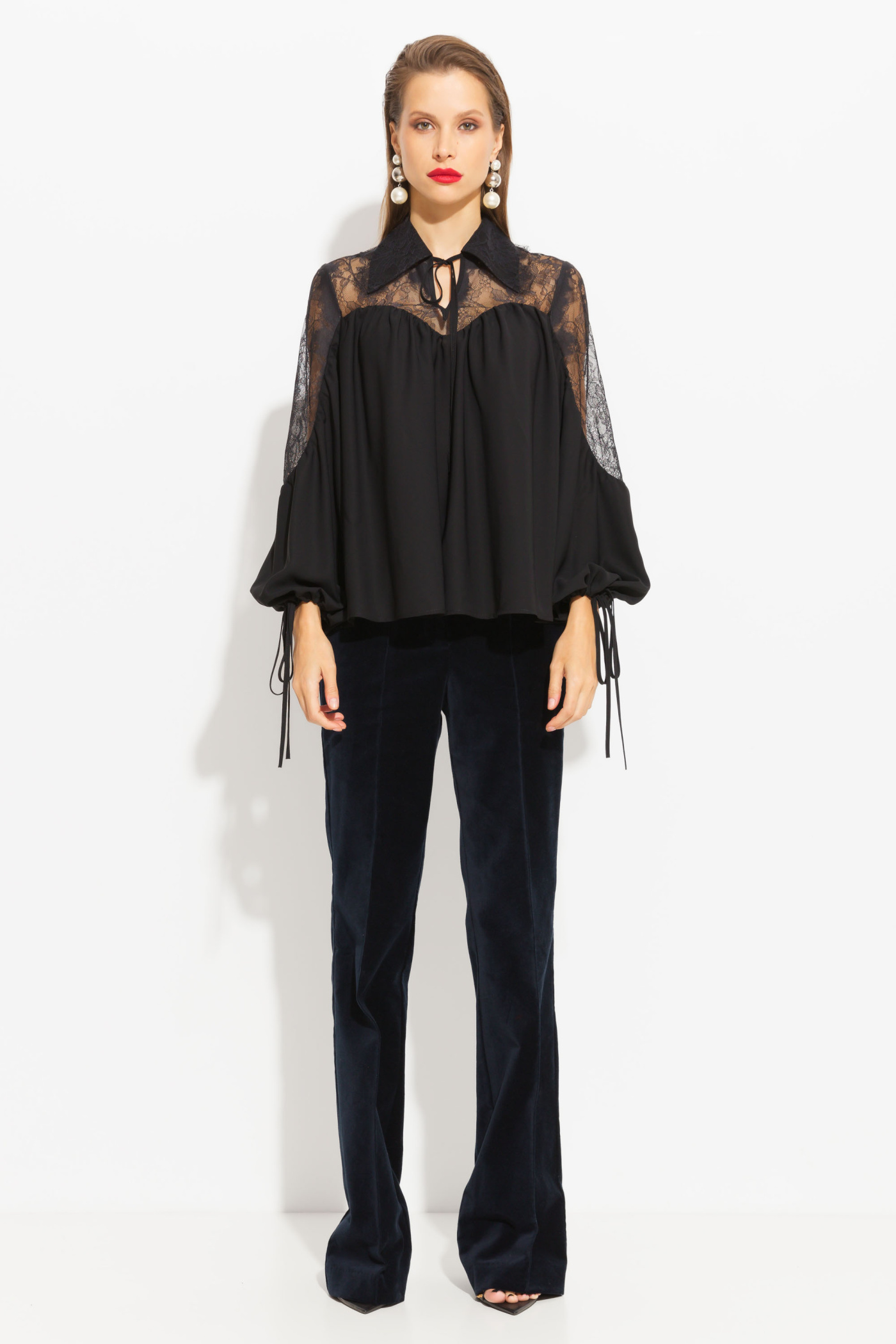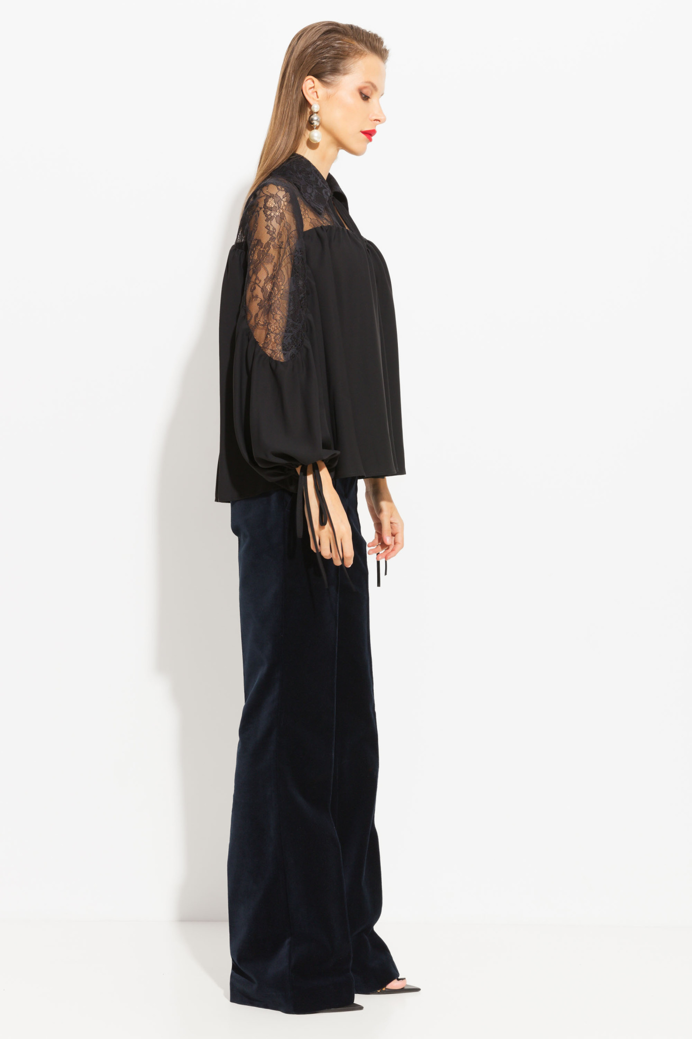Блузка прямого кроя, длиной до середины линии бедер. Воротник отложной, декорированный кружевом. Рукава с кружевными вставками, объем которых регулируется при помощи протянутой тесьмы. Верх изделия выполнен из полупрозрачной кружевной ткани. Классическая модель, которая идеально сочетается как с брюками, так и с юбками. Идеальный вариант для неофициальных встреч и мероприятий.