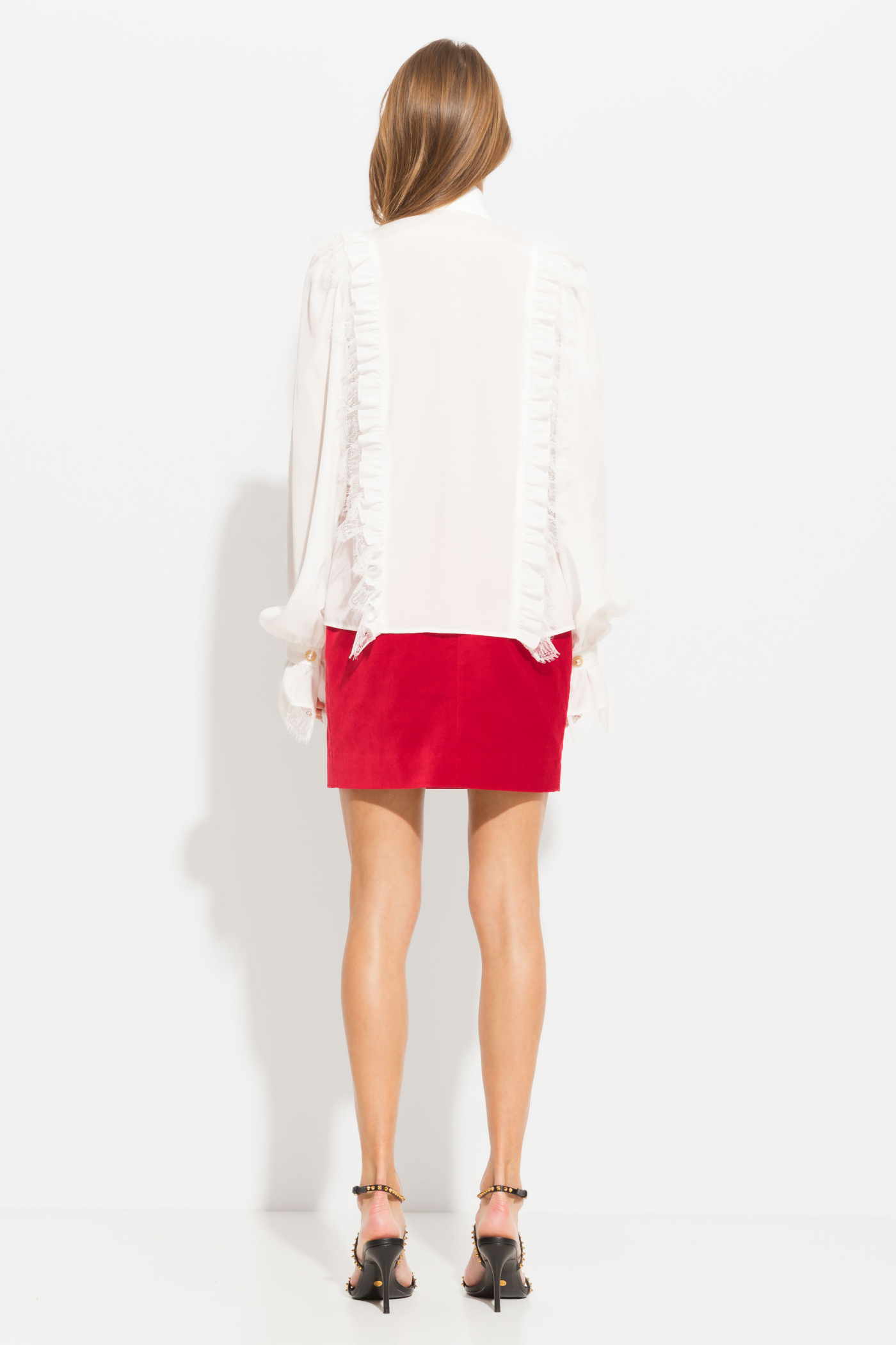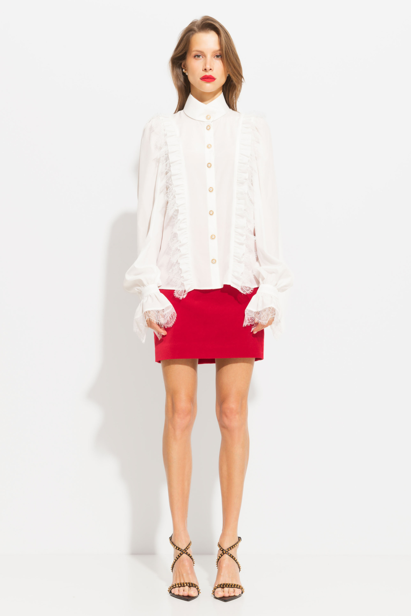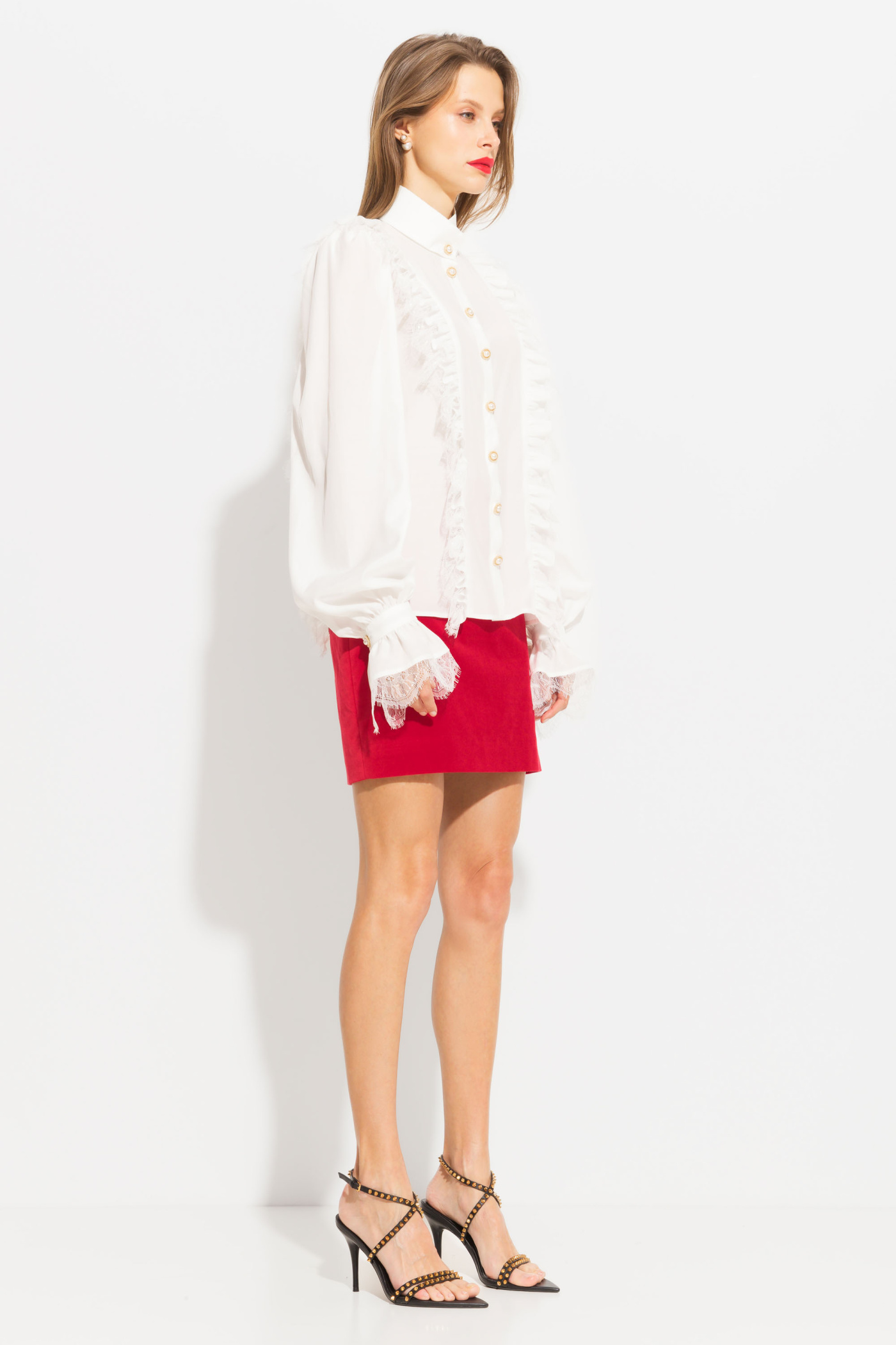 Блузка из струящейся ткани, длиной до середины линии бедер. Воротник-стойка. Пышные рукава с широкими манжетами, декорированными кружевом. Перед блузы дополнен воланами и кружевом из аналогичной ткани. Застегивается на акцентные жемчужные пуговицы контрастного цвета. Эффектная, классическая модель.