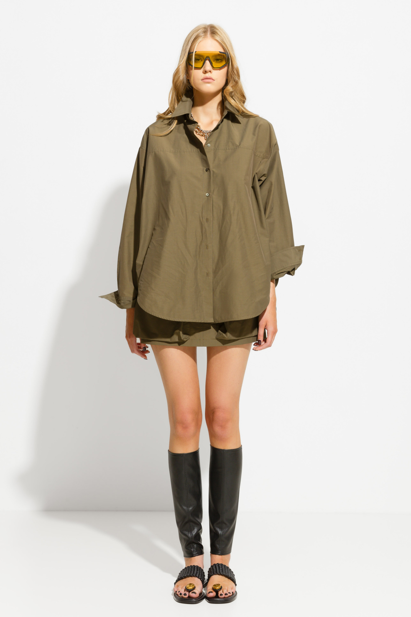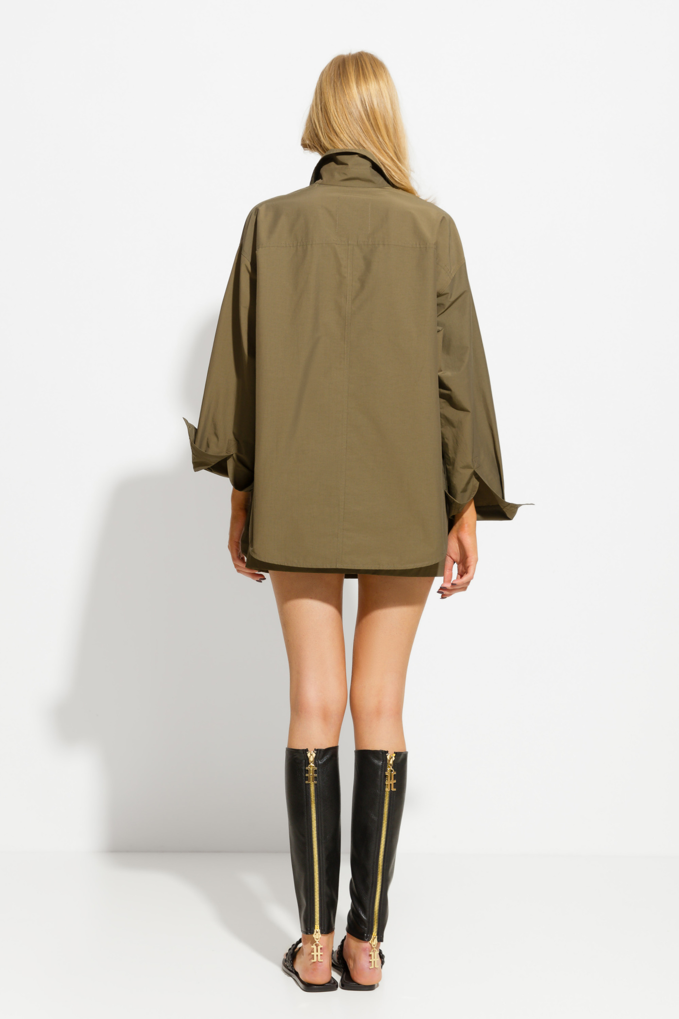 Блуза прямого кроя, длиной ниже линии бедер. Воротник стояче-отложной. Линия плеча спущена. Рукава на широких манжетах. Свободный крой не сковывает движений. Плотная, дышащая ткань позволяет носить блузу как самостоятельный элемент гардероба, так и в качестве верхней одежды теплыми летними вечерами.