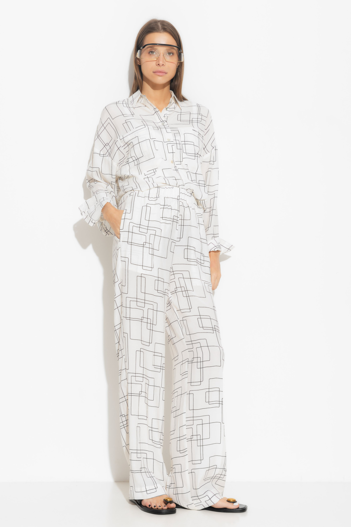 Блуза в геометричный принт. Прямой крой и разновеликая длина позволяют сочетать ее с различными брюками и шортами. Отложной воротник. Линия плеч спущена. На груди накладные карманы, левый карман декорирован принтом. Базовый крой и яркие цвета позволяют создавать образы для любых случаев.