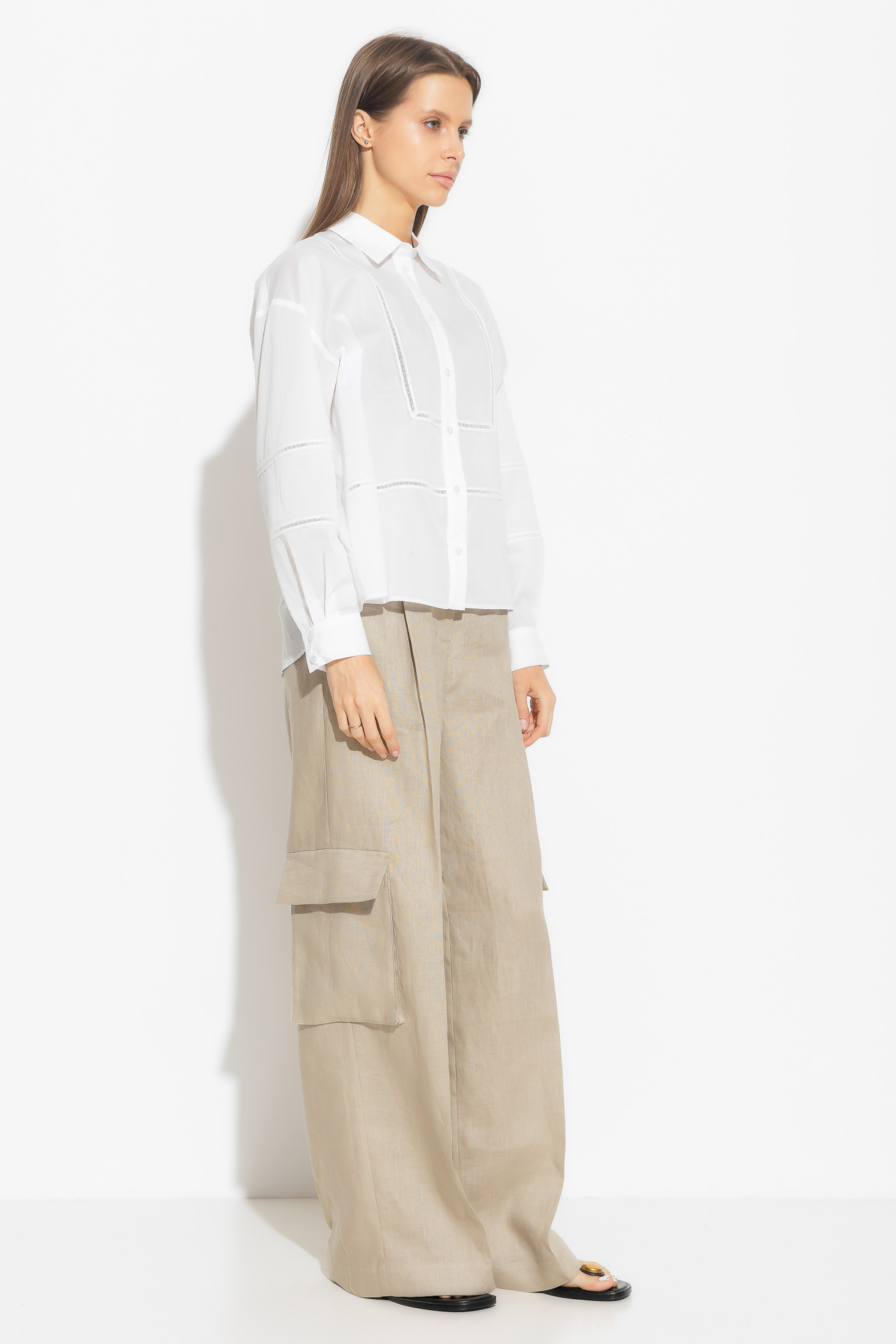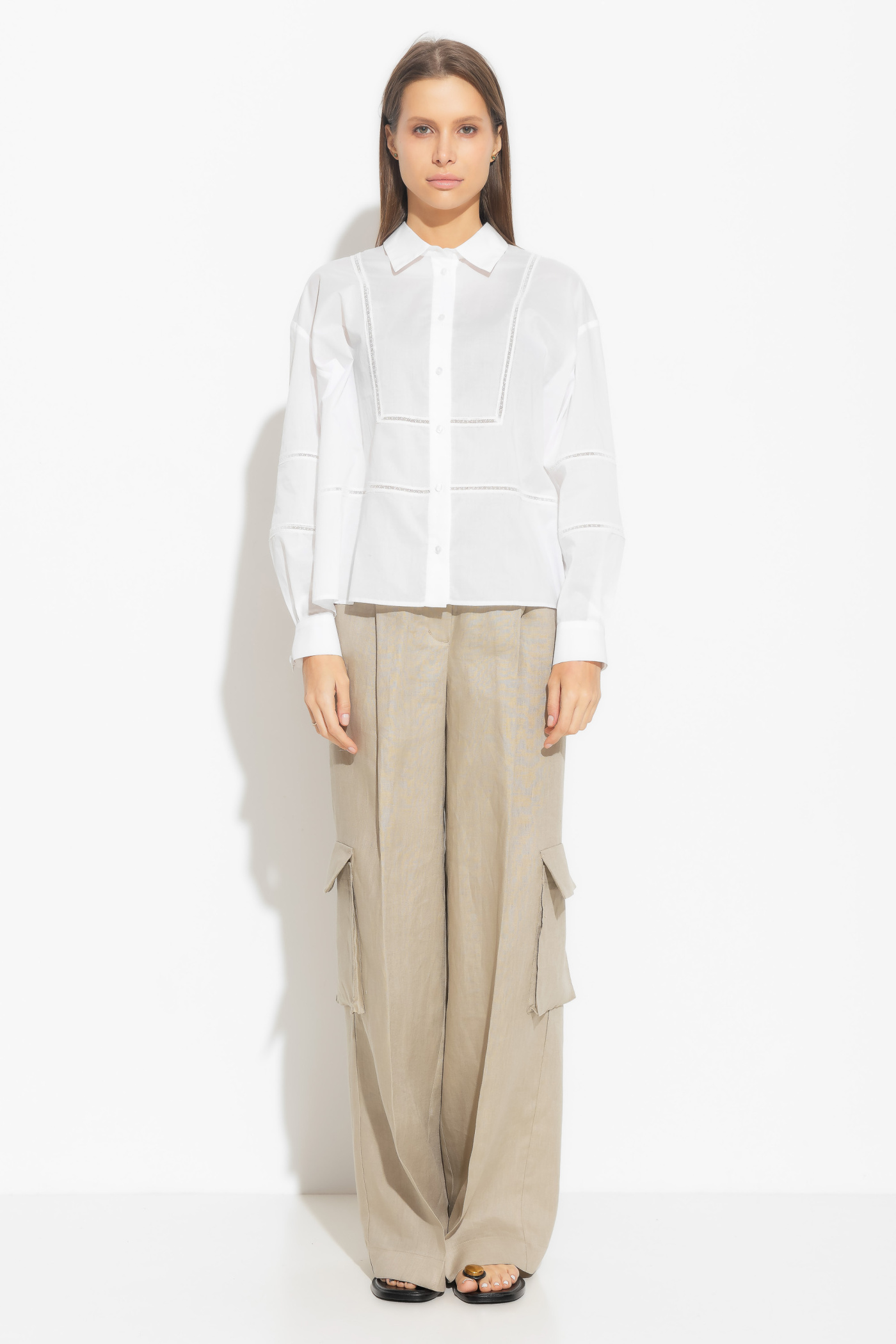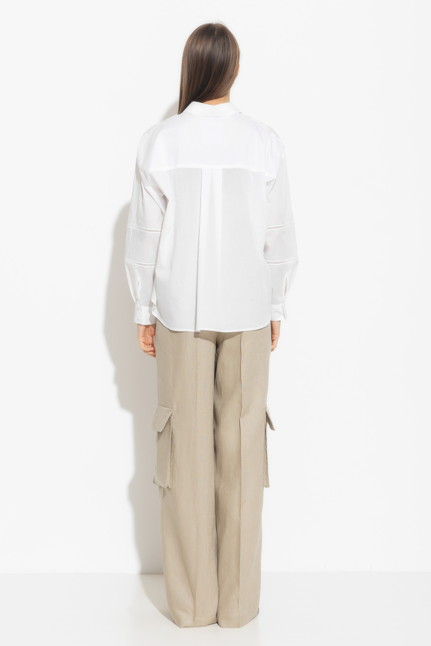 Блузка прямого силуэта представляет собой стильное и изысканное изделие. Блузка удлиненная, с центральным бортовым заходом, застегивается на шесть петель и шесть пуговиц, что придает ей элегантный вид. Воротник стояче-отложной, с отрезными стойками, застегивающимися на петлю и пуговицу, добавляет утонченности. Рукава блузки втачные, одношовные, с тремя частями. Кружевные детали по нижнему срезу верхней и средней частей рукава придают блузке изысканный вид. Манжеты рукавов притачные, застегивающиеся на петлю и пуговицу, что добавляет функциональность. Эта блузка станет отличным выбором для создания элегантного и стильного образа, подчеркивая вашу женственность и хороший вкус.
