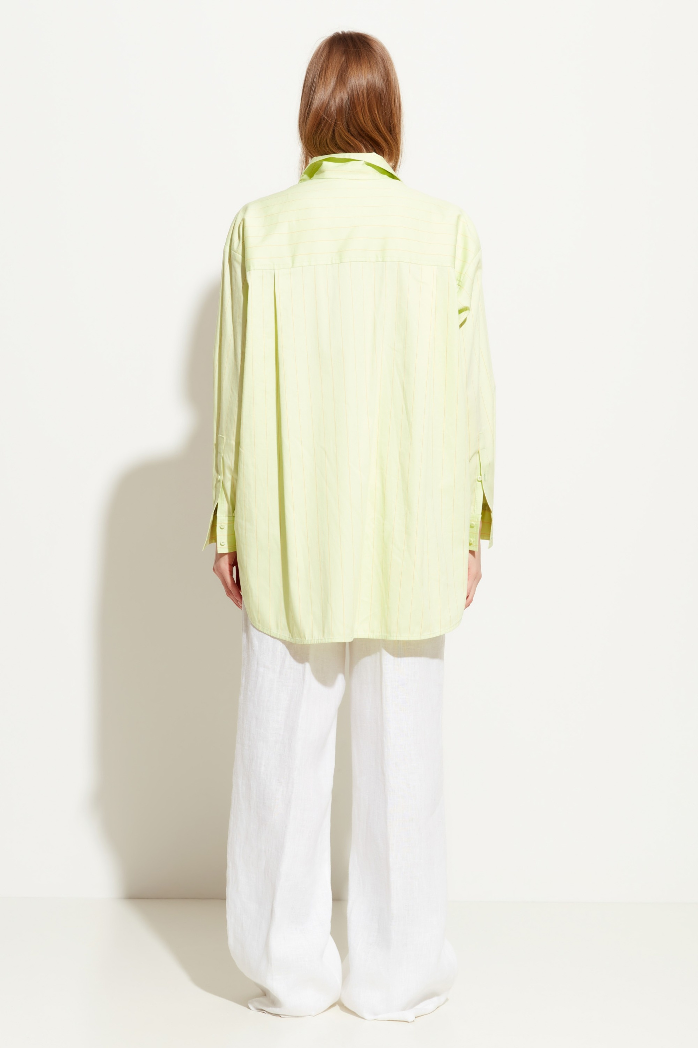 Блуза свободного кроя, длиной ниже линии бедер. Воротник стояче-отложной. Линия плеч спущена. На груди накладной карман. Классическая расцветка в тонкую полоску позволяет сочетать блузу с любым типом низа и создавать образы в различных стилях.