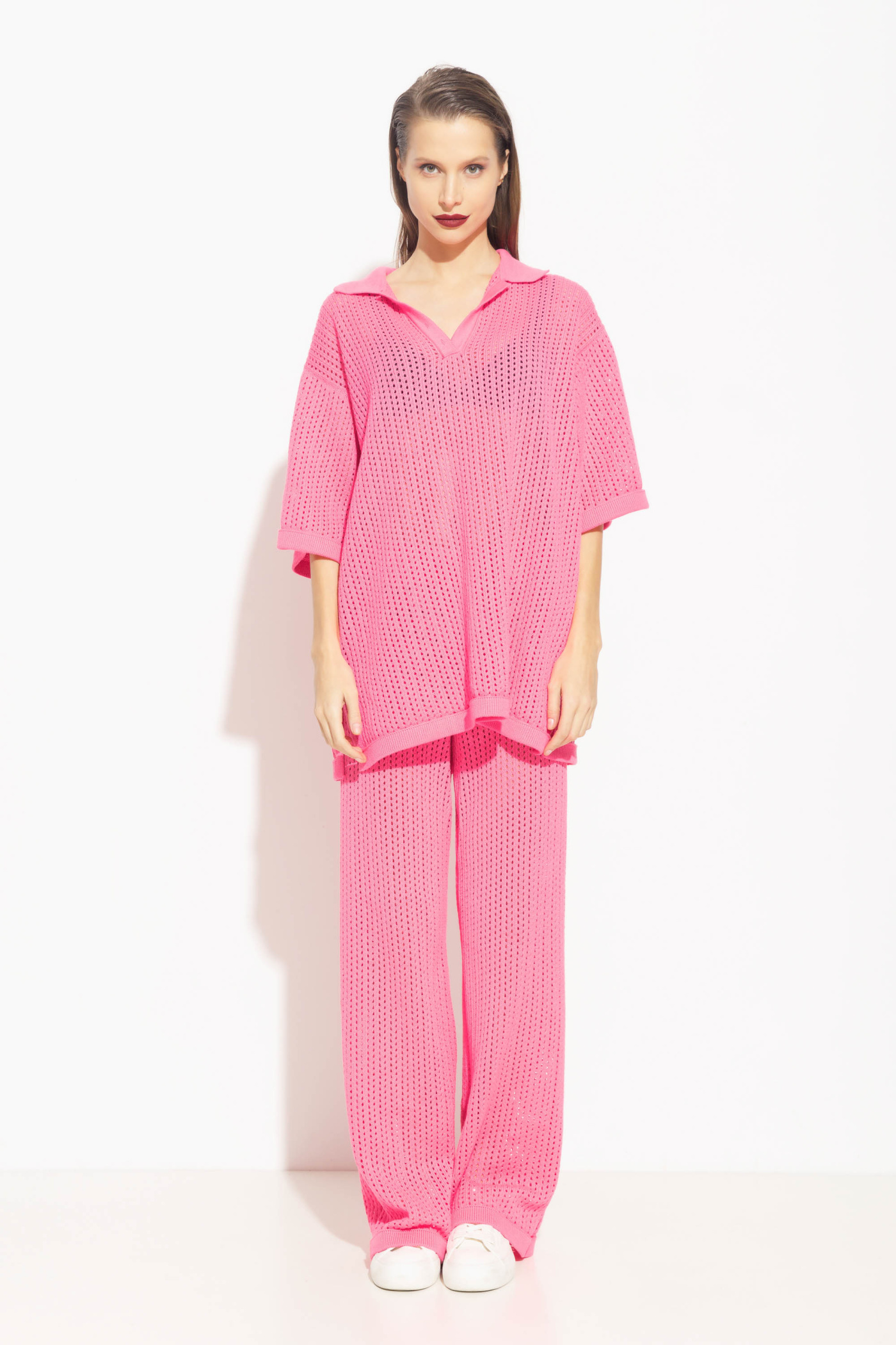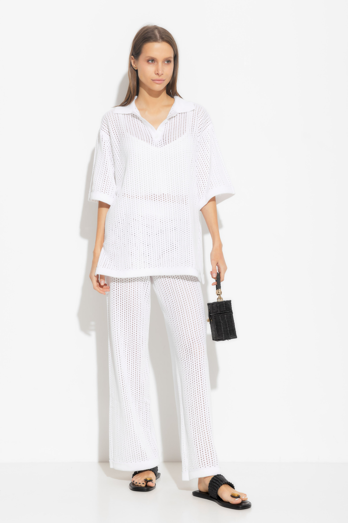 Брюки вязаные полуприлегающего силуэта, расширенные от линии колен к низу. Посадка изделия средняя. Пояс на мягкой резинке, что дает чувство комфорта на весь период носки изделия. Трендовая вязка в сетку дарит чувство комфорта и легкости. Идеальная модель для создания стильных весенне-летних образов.