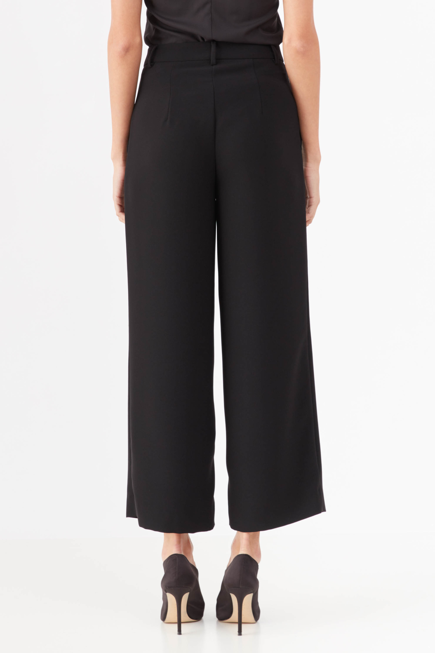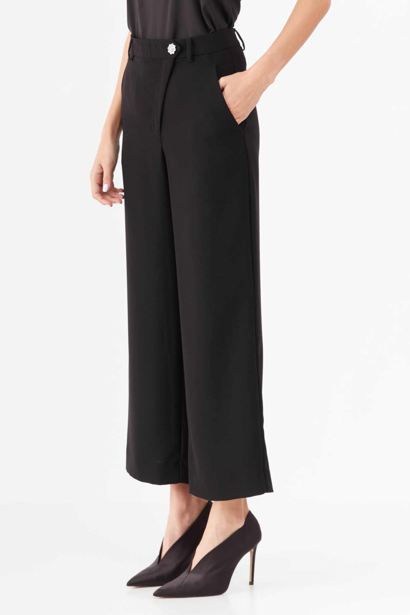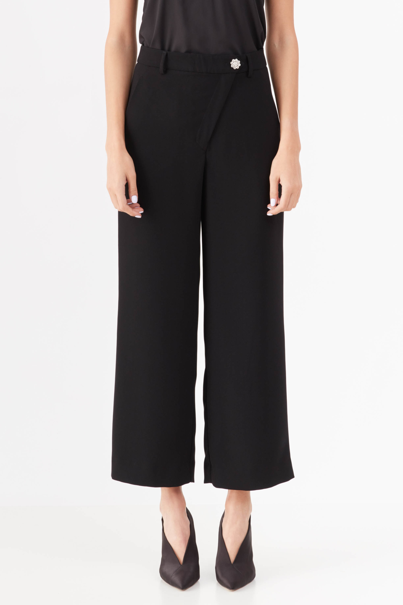 Укороченные брюки из костюмной ткани, прямые от линии бедра, с косой застежкой.