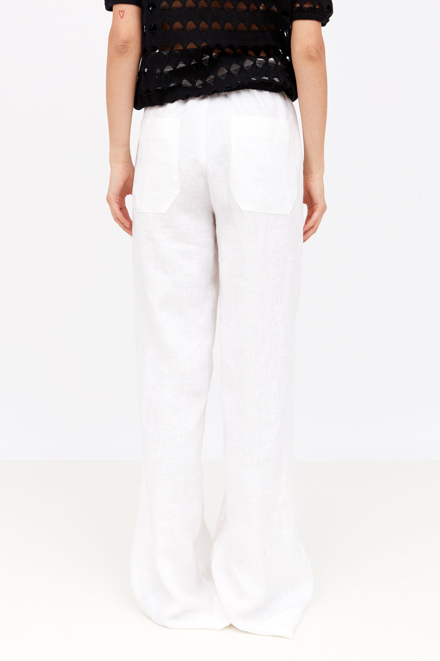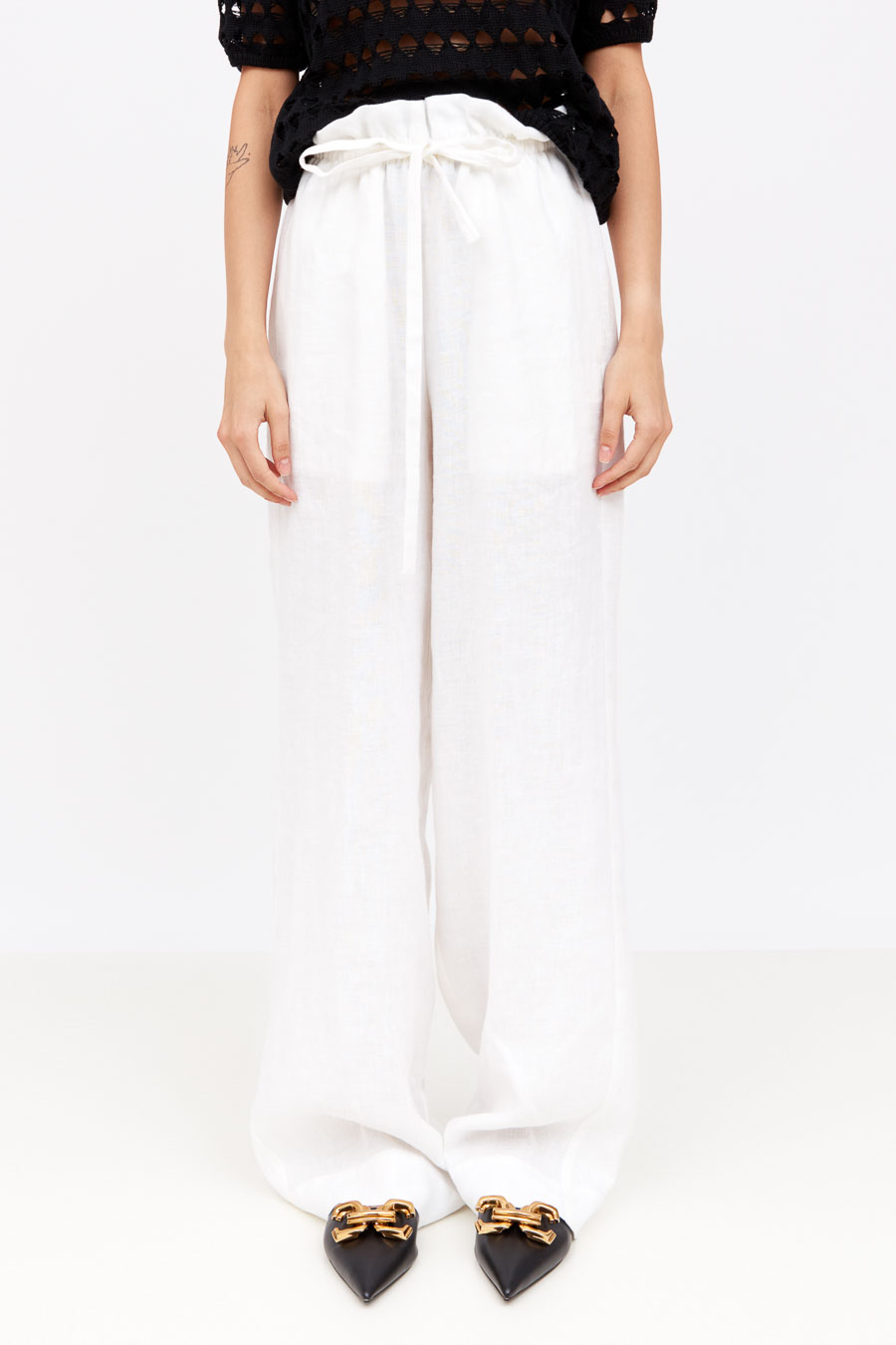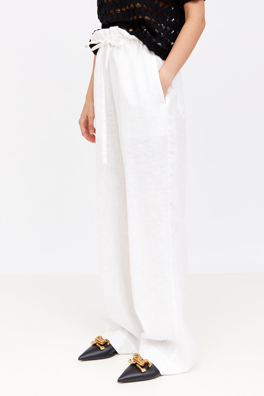 Брюки из льняной ткани свободного кроя. Высокая посадка, регулируемый пояс на шнурке. Спереди изделия два отрезных боковых кармана.