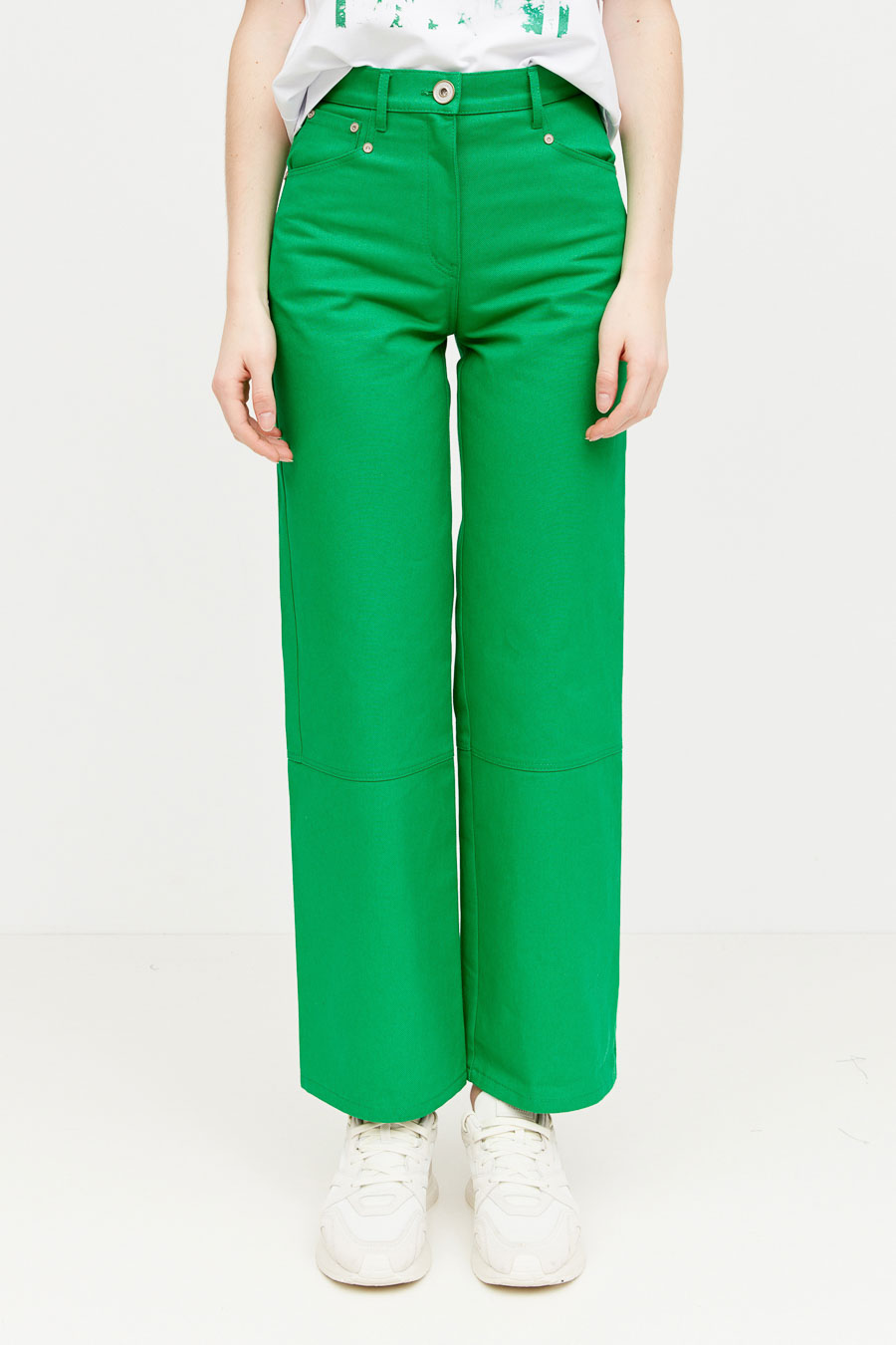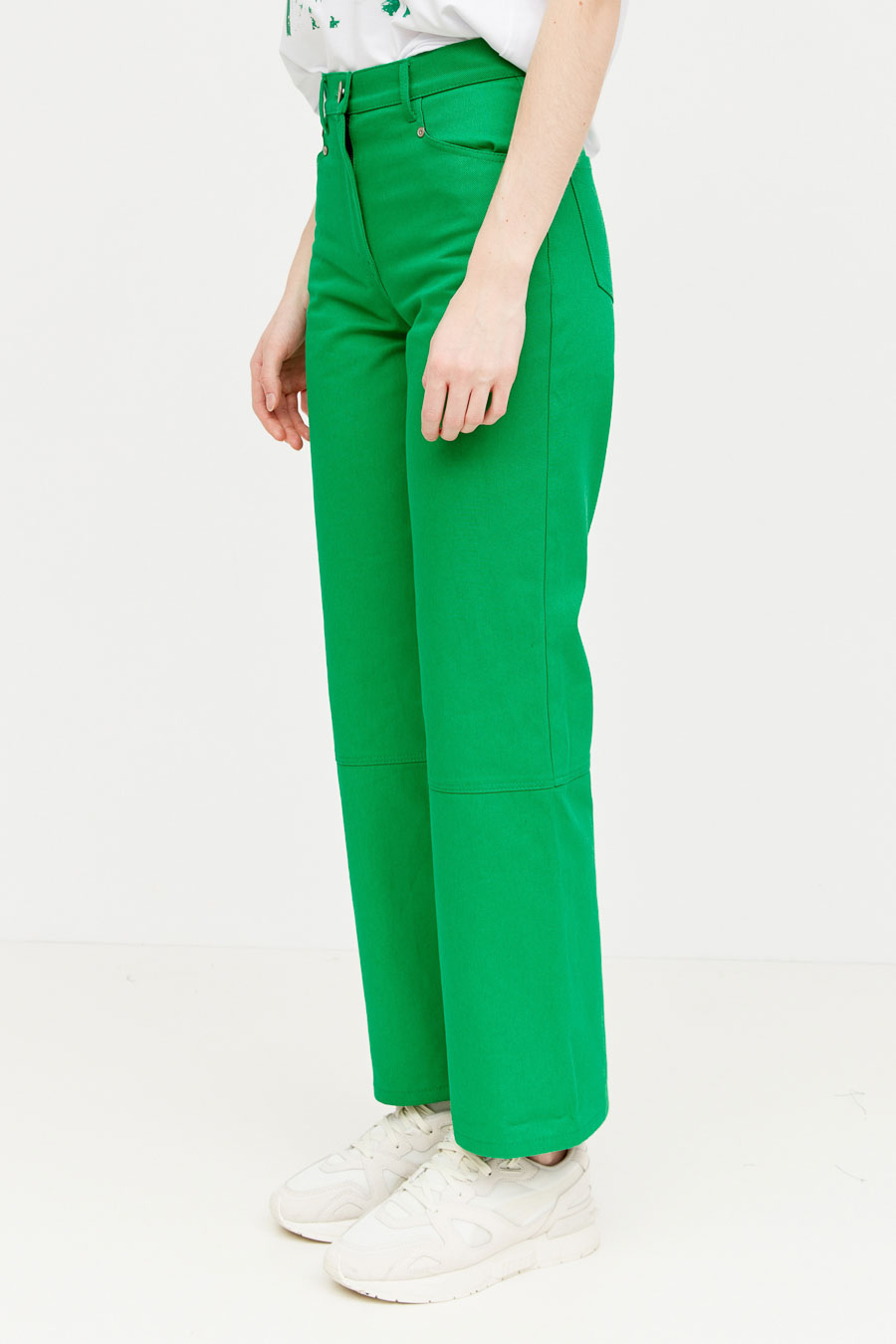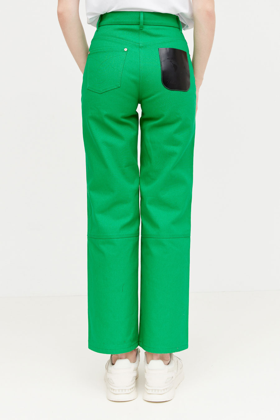 Брюки из джинсовой ткани, прямые от линии бедер к низу. Спереди два кармана. Задние части брюк с накладными карманами. Правый накладной карман выполнен из кожи.