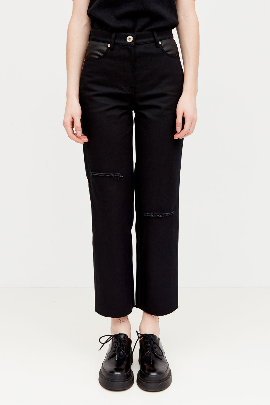 Брюки прямого кроя из джинсовой ткани, укороченной длинны. Пояс, шлевки, боковые части передних боковых карманов выполнены из искусственной кожи. Перед декорирован горизонтальными разрезами с необработанными карманами. Низ брюк не обработан.
