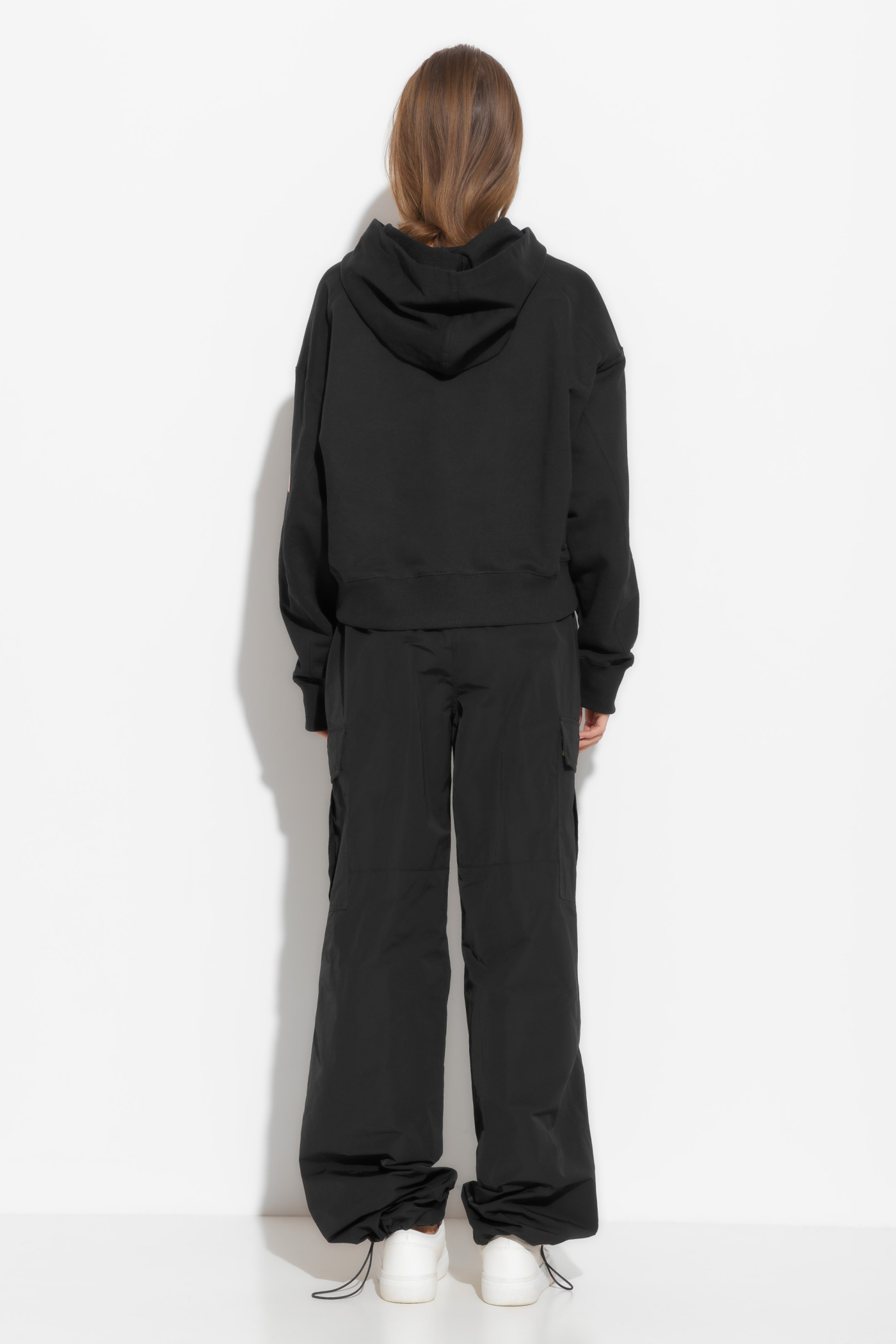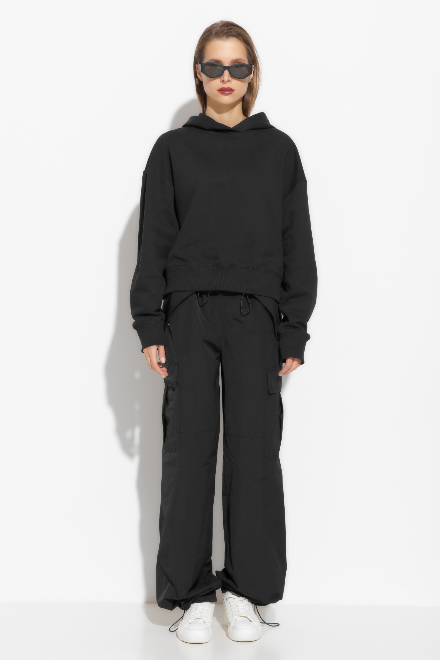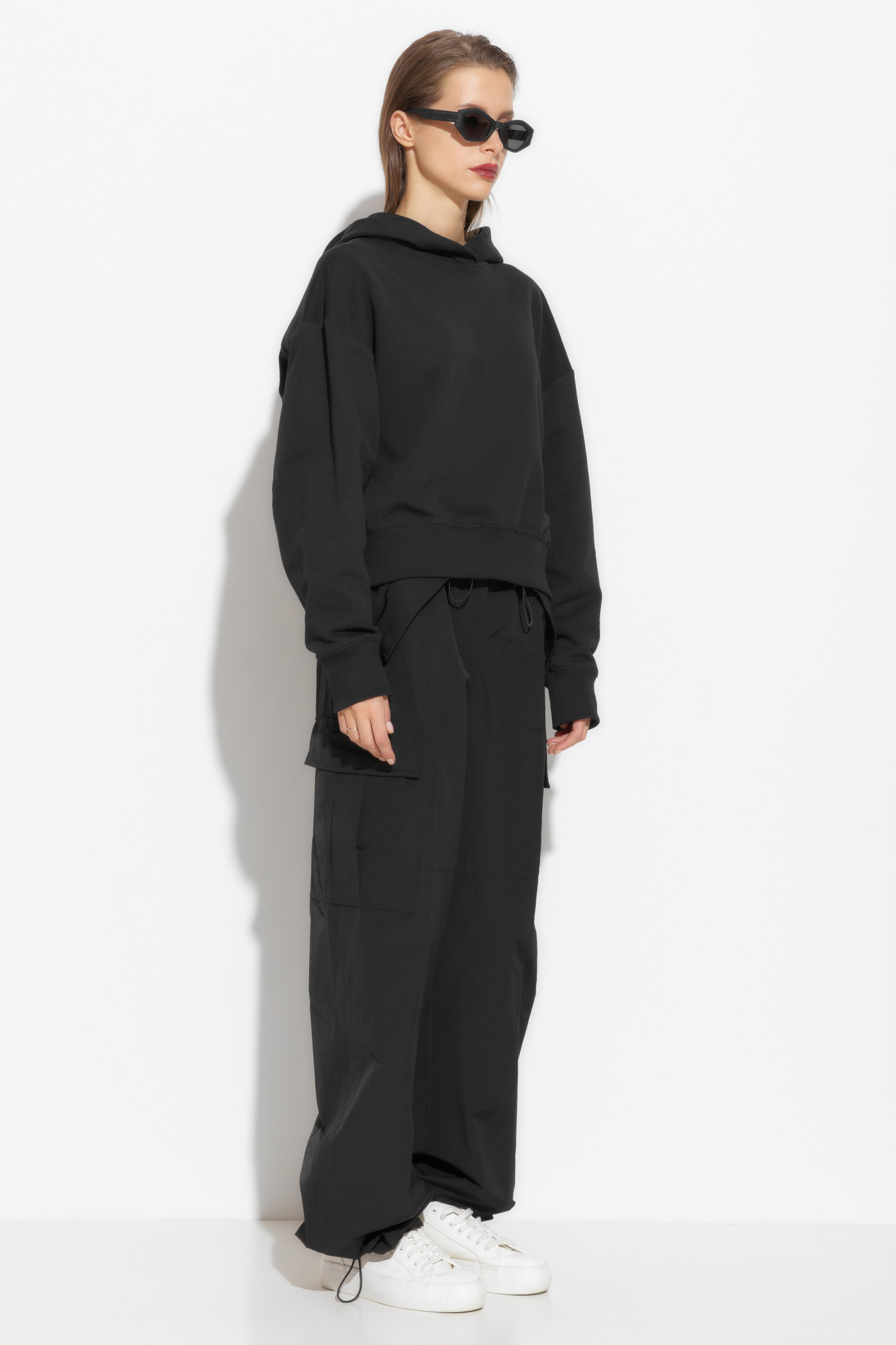Брюки карго в длине макси. Посадка изделия средняя. Пояс на эластичной резинке, которая обеспечивает комфортную посадку изделия. По бокам накладные карманы с клапанами. Трендовая модель, которая любой образ сделает эффектным и незаурядным.