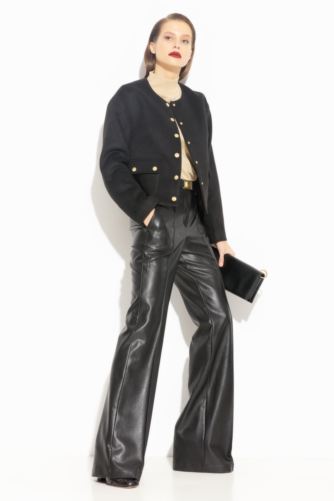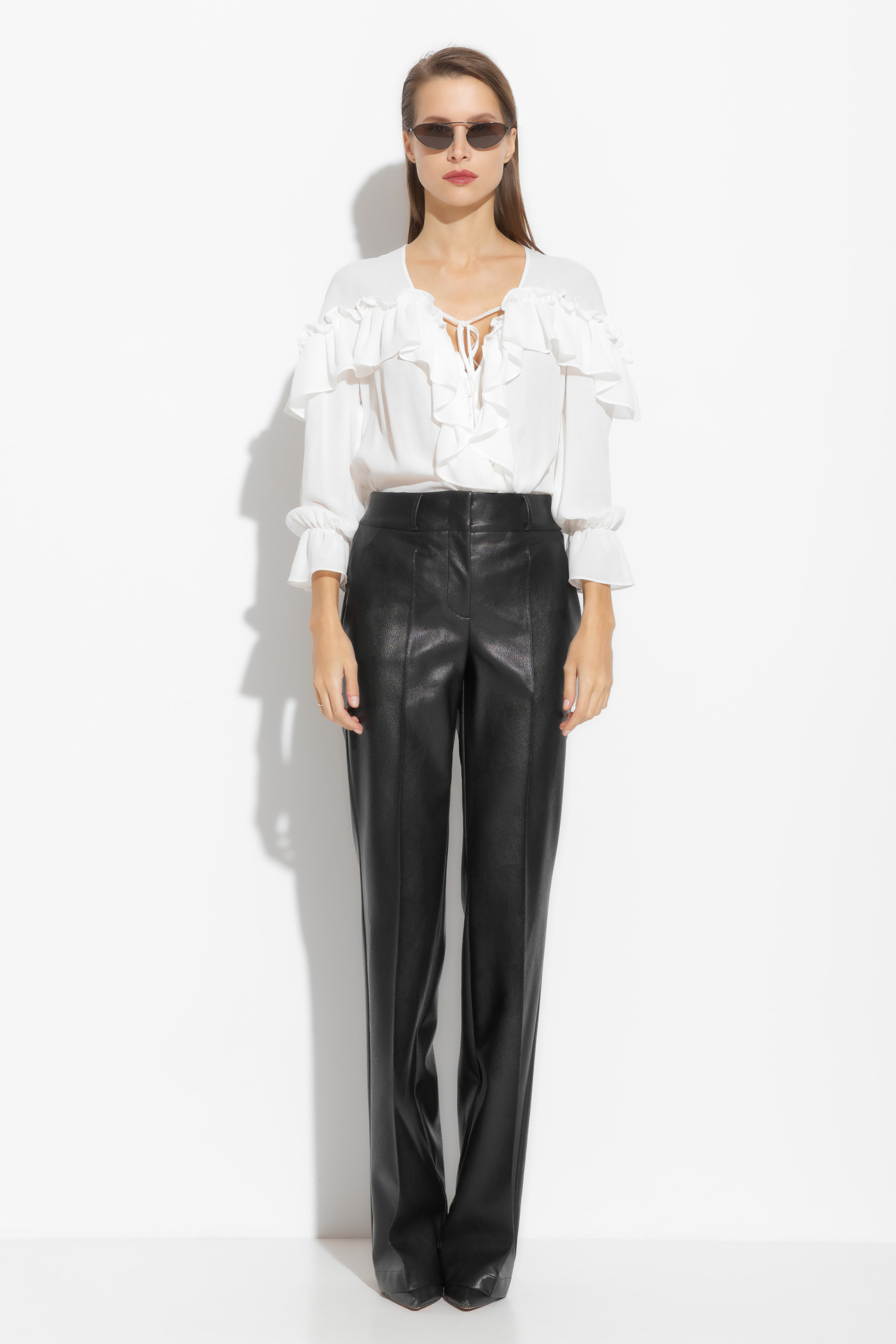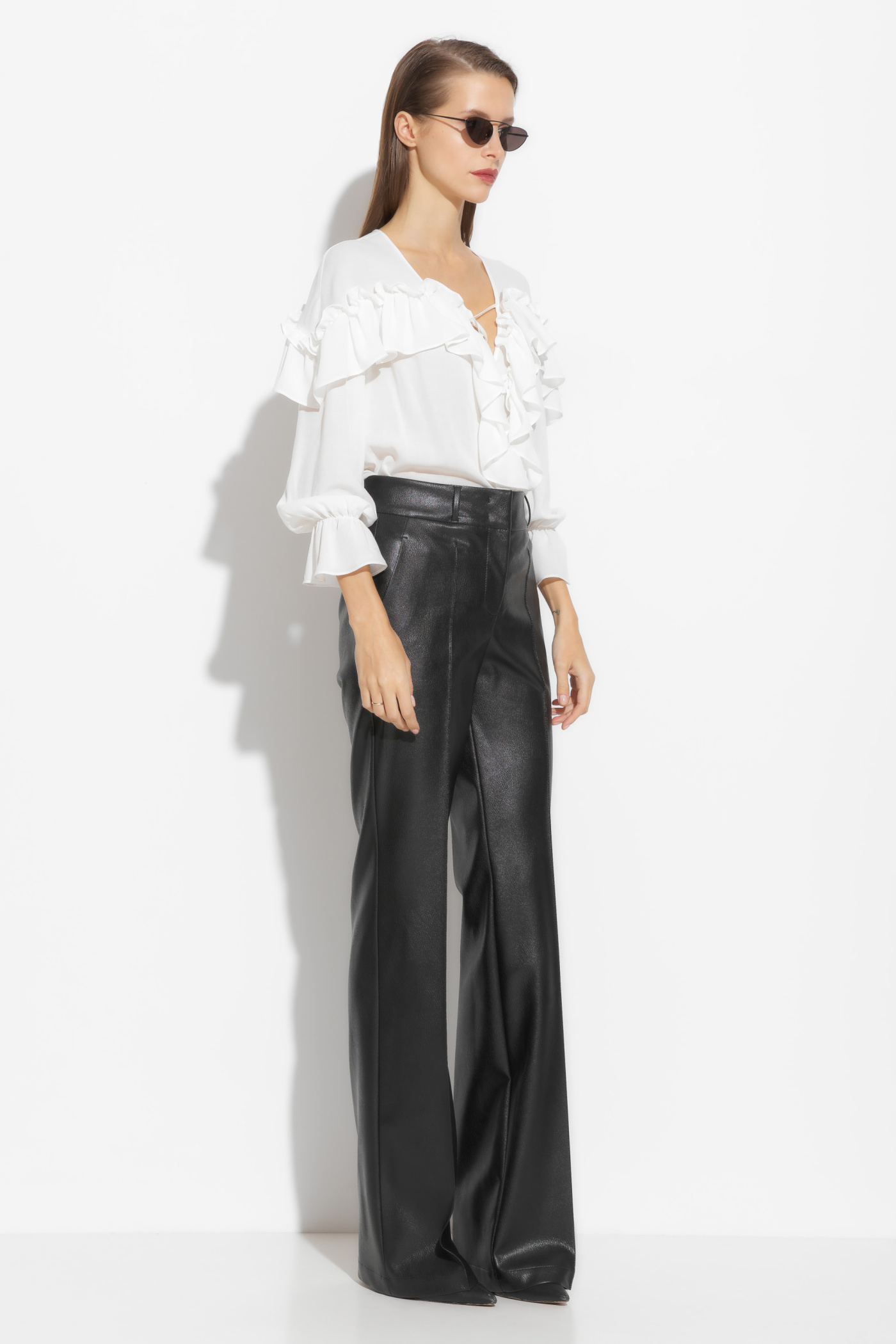 Брюки из эко-кожи, полуприлегающего силуэта, расширенные от линии колен к низу. Посадка изделия средняя. По бокам отрезные карманы. Перед изделия с вертикальными строчками «стрелками», которые визуально удлиняют силуэт. Классическая модель, которая подойдет к любому типу гардероба и по любому случаю.