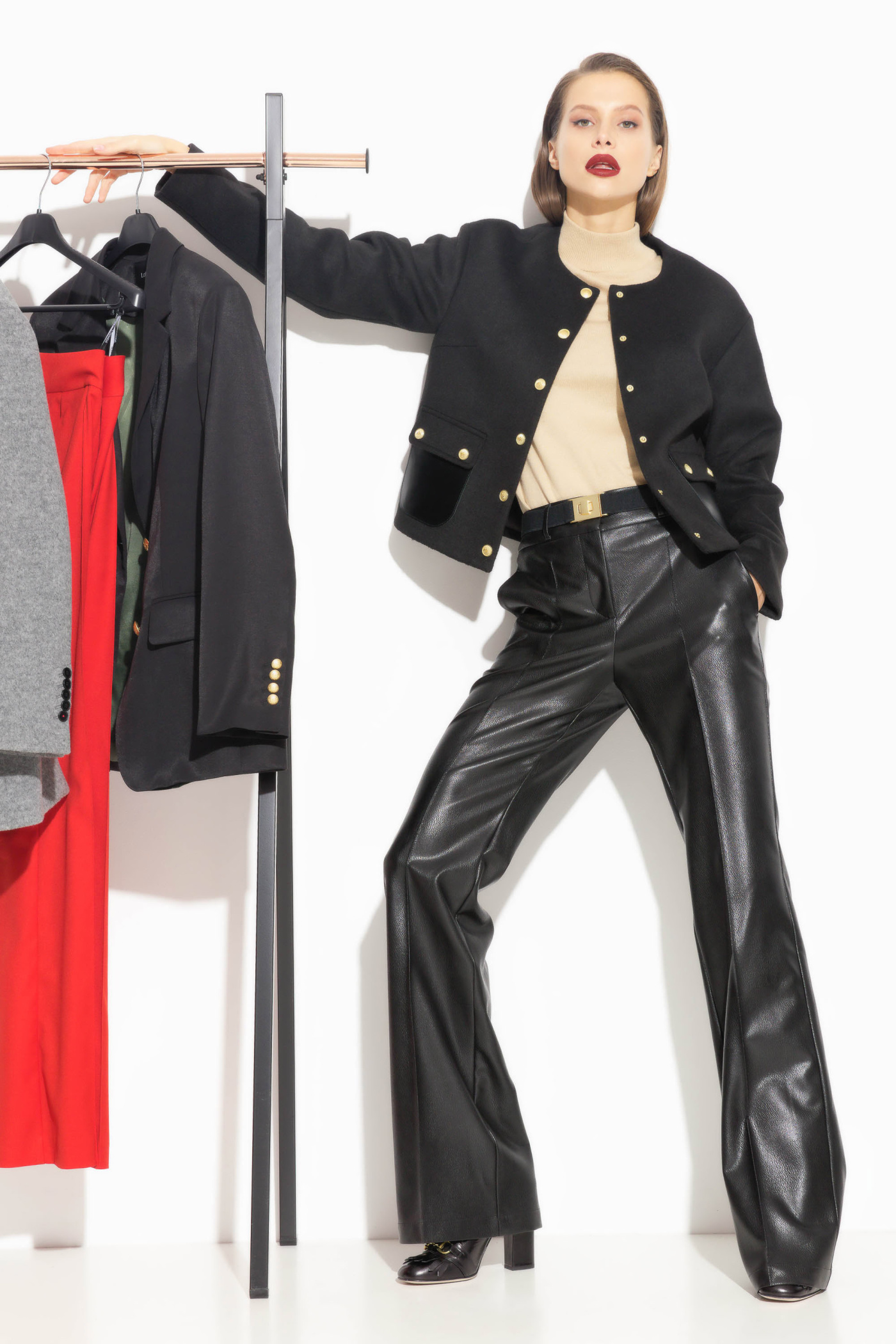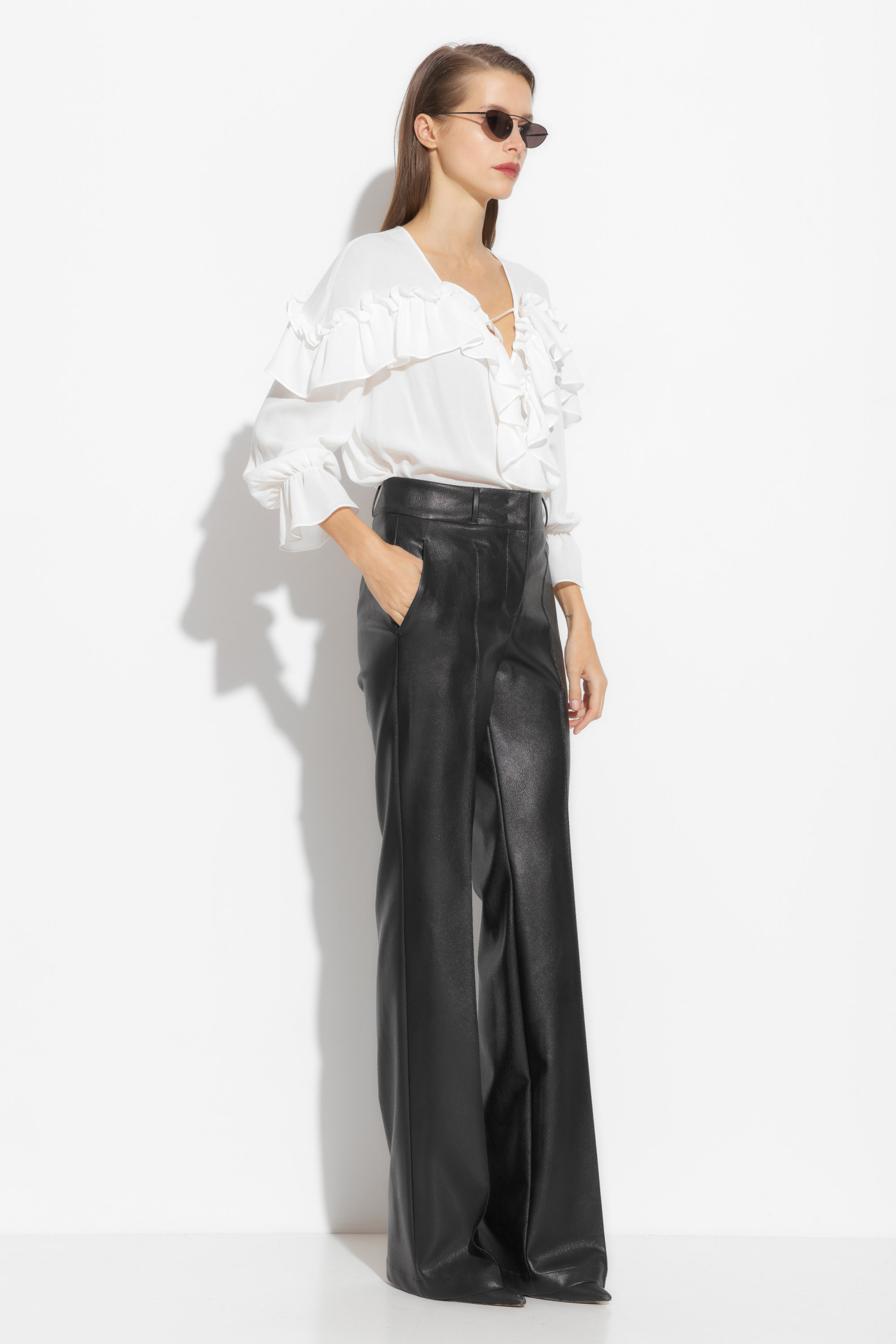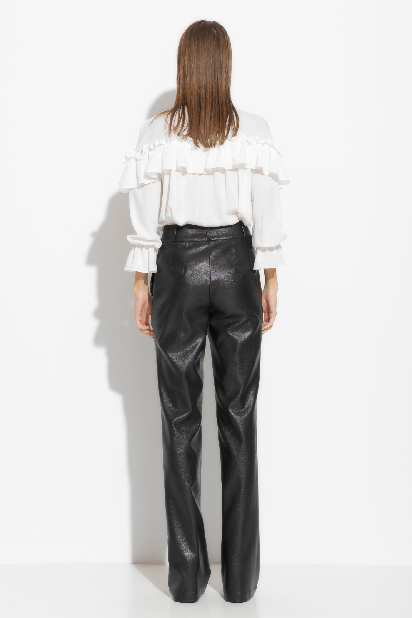 Брюки из эко-кожи, полуприлегающего силуэта, расширенные от линии колен к низу. Посадка изделия средняя. По бокам отрезные карманы. Перед изделия с вертикальными строчками «стрелками», которые визуально удлиняют силуэт. Классическая модель, которая подойдет к любому типу гардероба и по любому случаю.