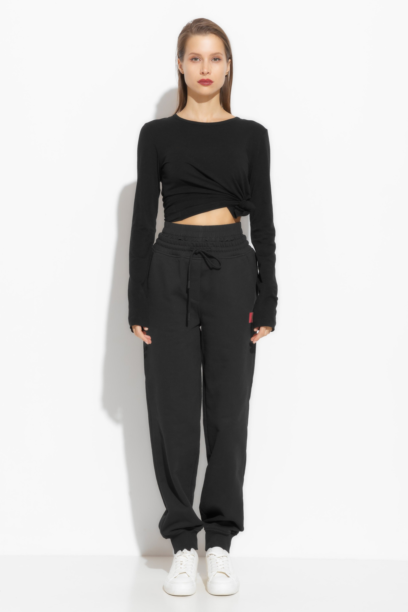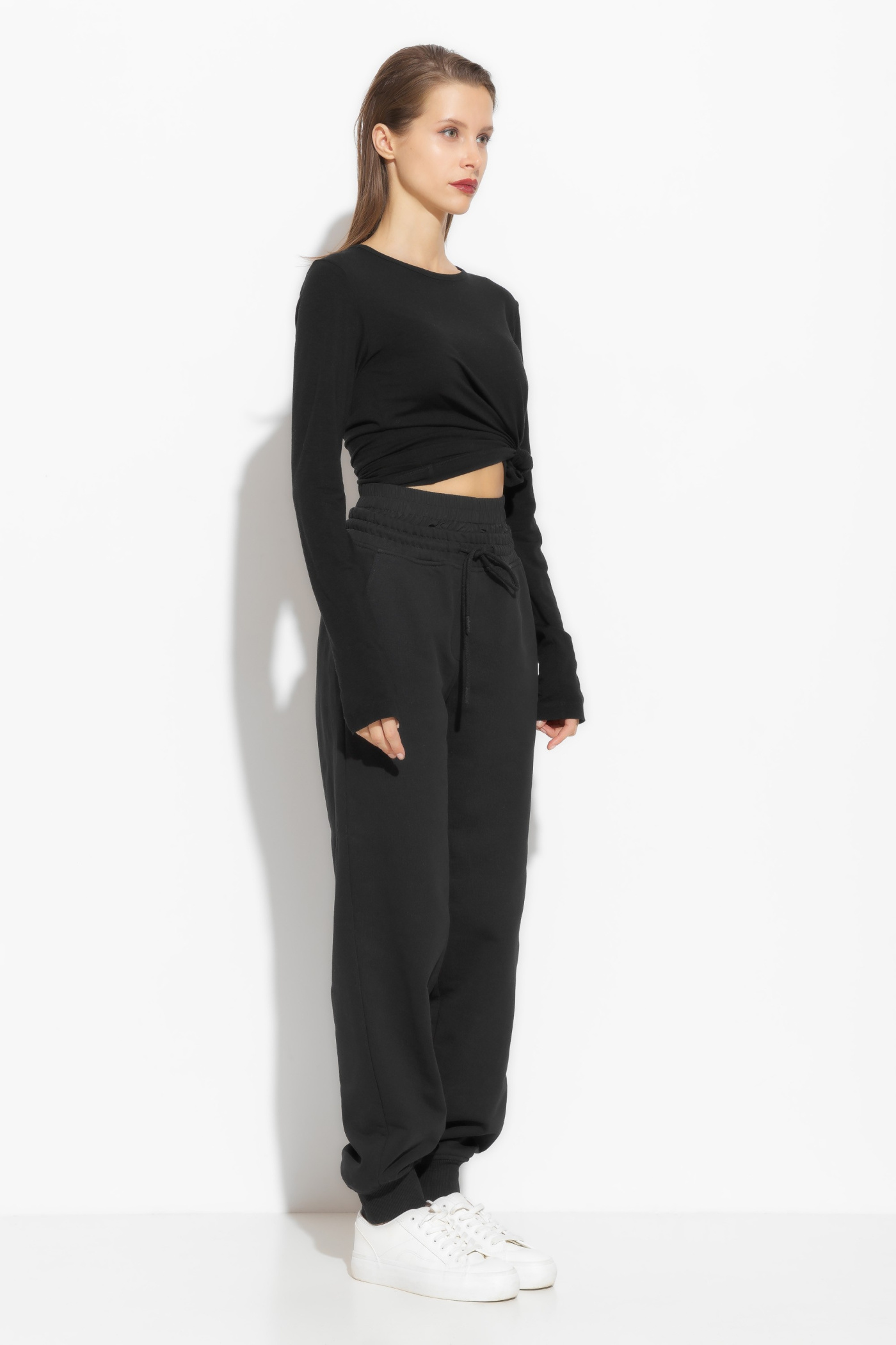 Брюки из трикотажной ткани, зауженные от линии бедер. Низ изделия с манжетами. Пояс на эластичной резинке с протянутым шнуром, который гарантирует комфортную посадку. По бокам обрезные карманы. Базовая модель для активного отдыха и погулок по городу.