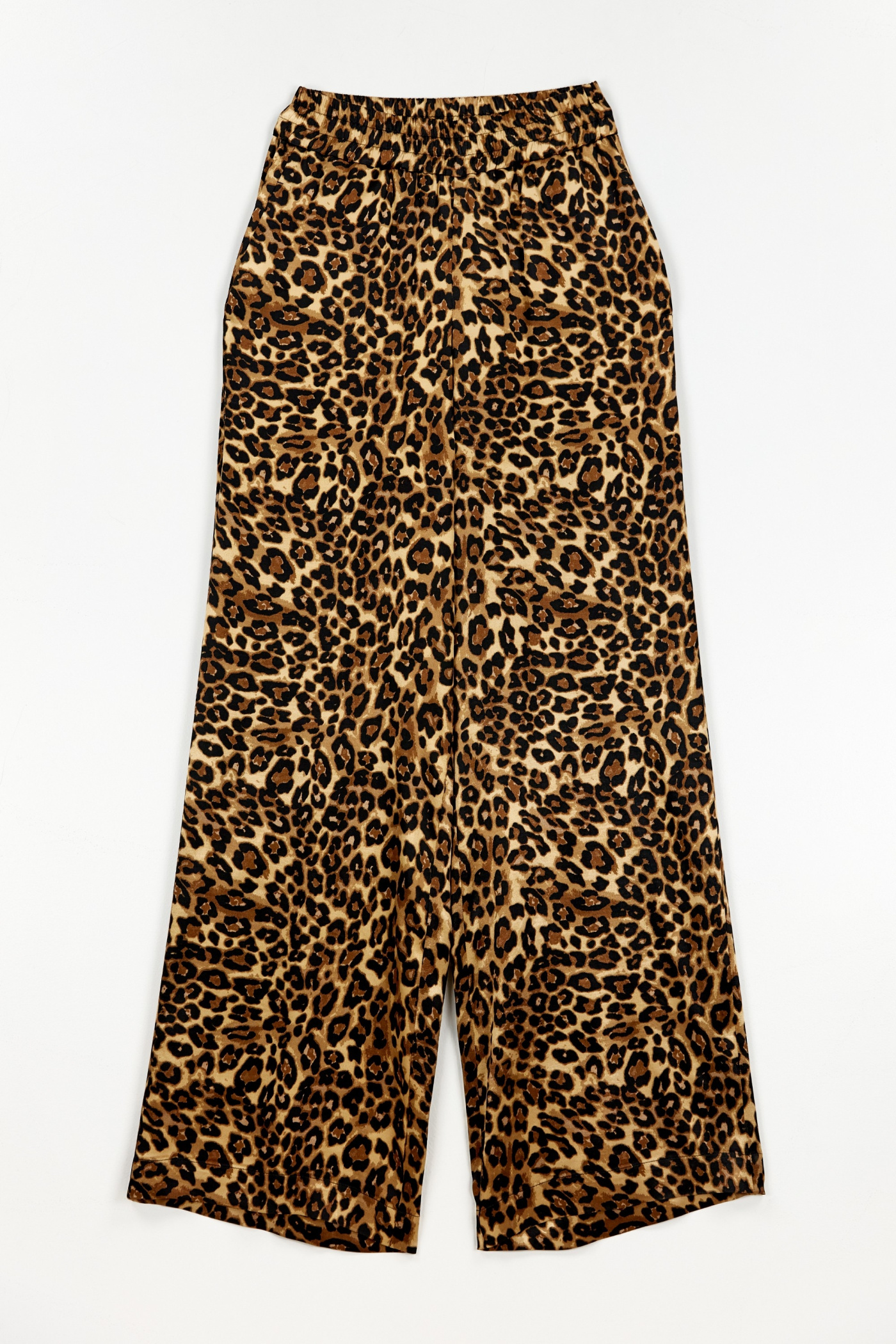 Брюки прямого кроя, расширенные от линии бедер к низу. Пояс на эластичной резинке, что обеспечивает комфортную посадка брюк. По бокам прорезные карманы. Классический крой и трендовый принт позволяют создавать образы по любому случаю, от вечернего до повседневного.