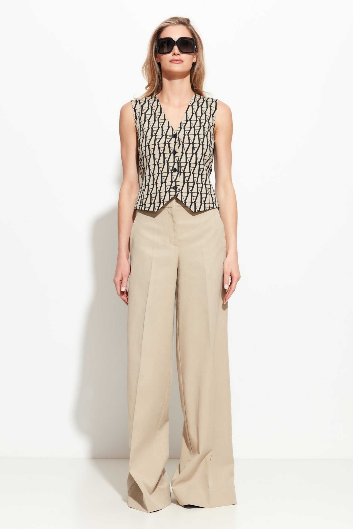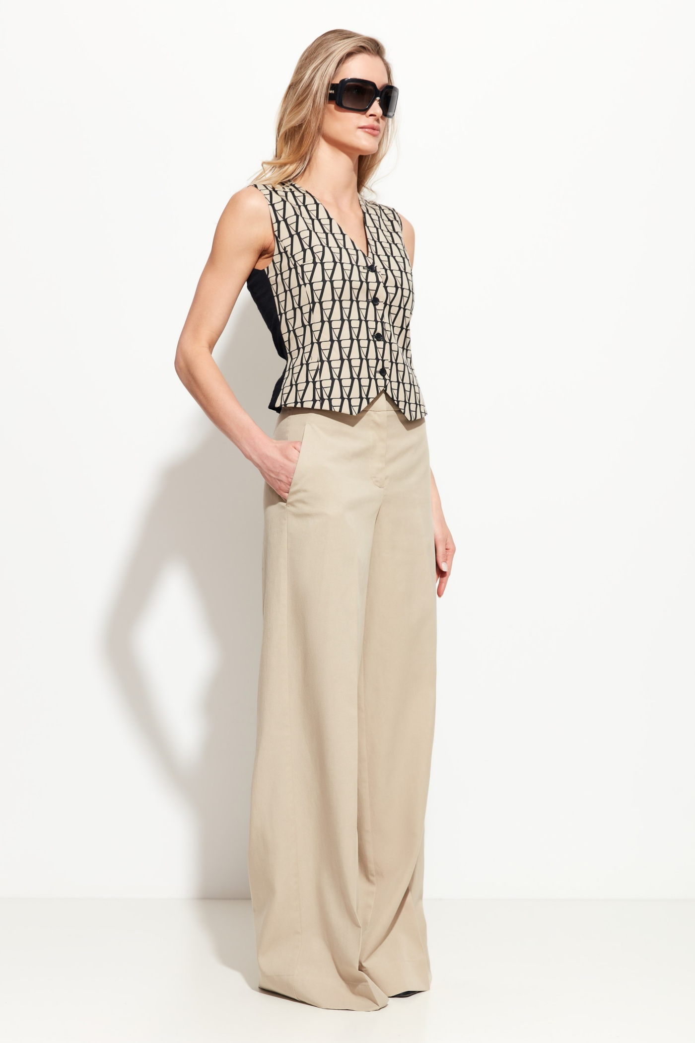 Брюки полуприлегающего силуэта, расширенные от линии бедер к низу. Посадка изделия средняя. По бокам обрезные карманы. Классическая модель, которая подойдет к любому типу гардероба и станет незаменимым помощником в создании стильных городских аутфитов.