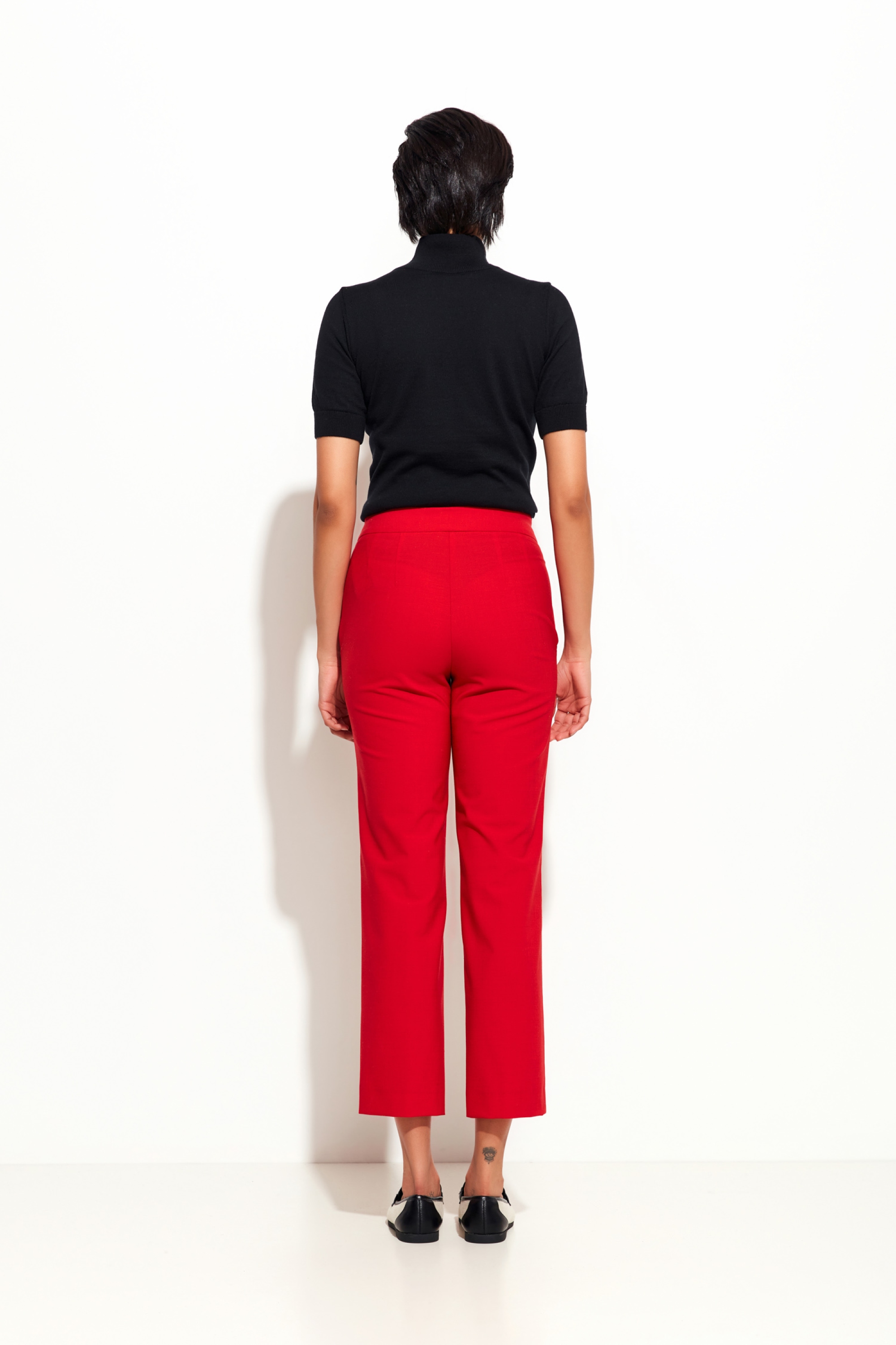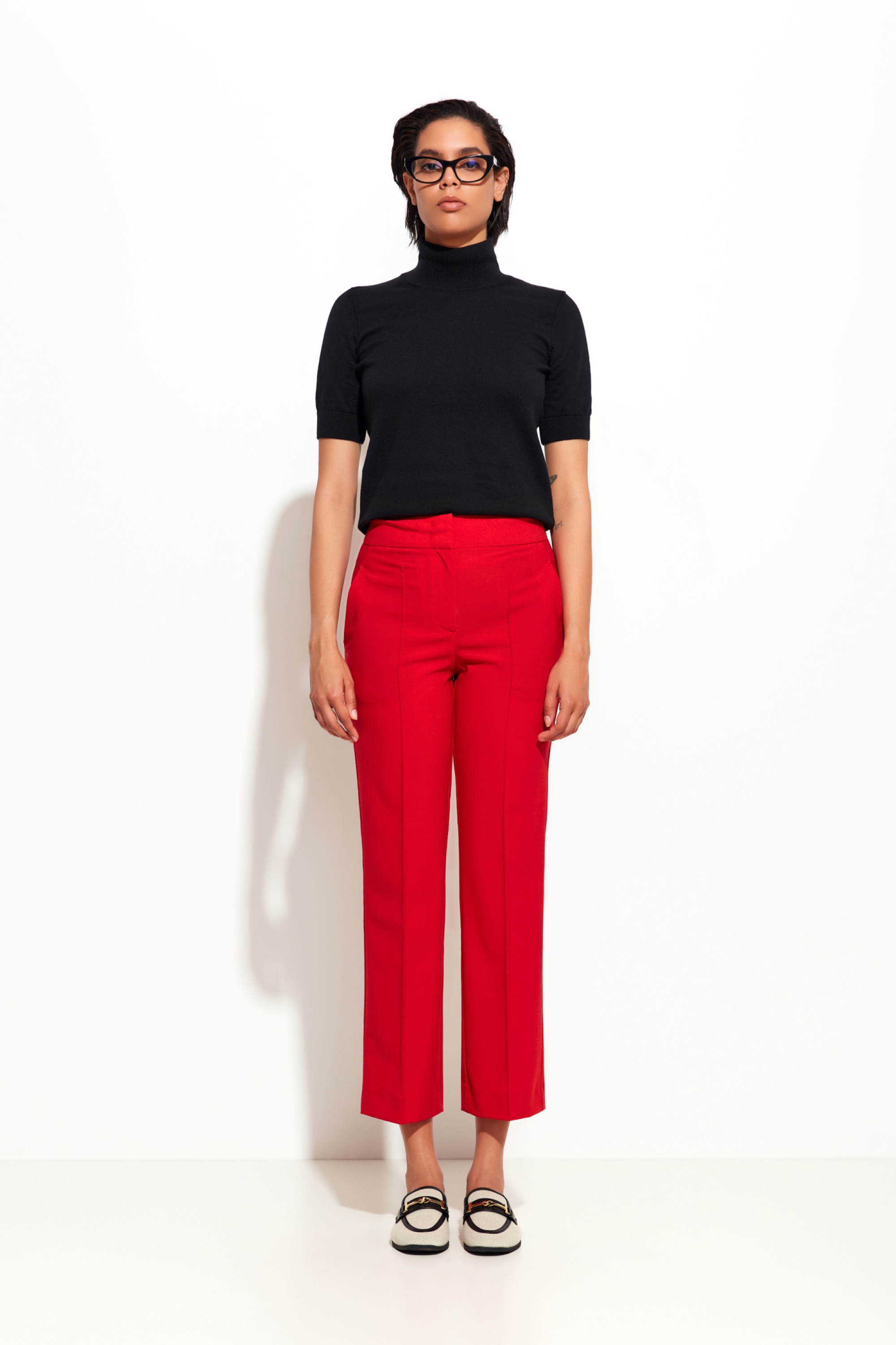 Материал: шерстяная костюмная ткань с добавлением полиэстера и акрила — тёплая, мягкая, износостойкая.Крой: прямой силуэт — визуально вытягивает ноги, подчёркивает строгость образа.Посадка: средняя — универсальный и комфортный вариант на каждый день.Цвет: насыщенный красный — для ярких, уверенных образов в холодный сезон.
