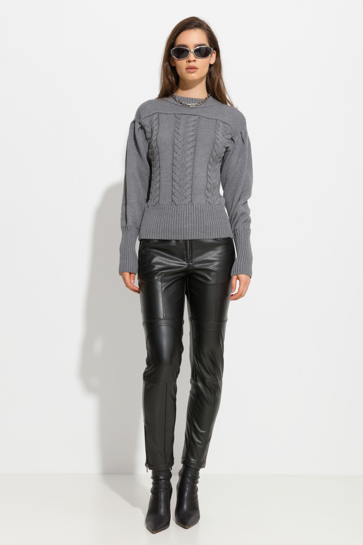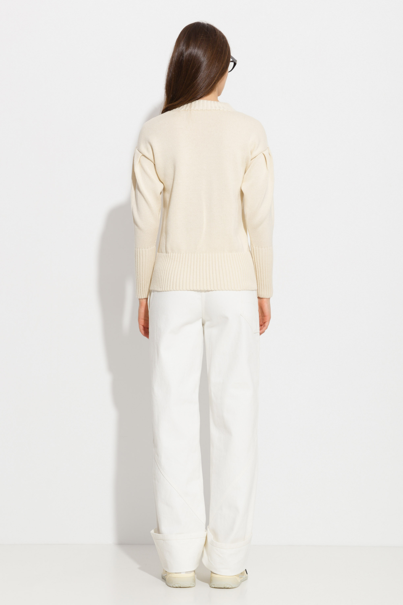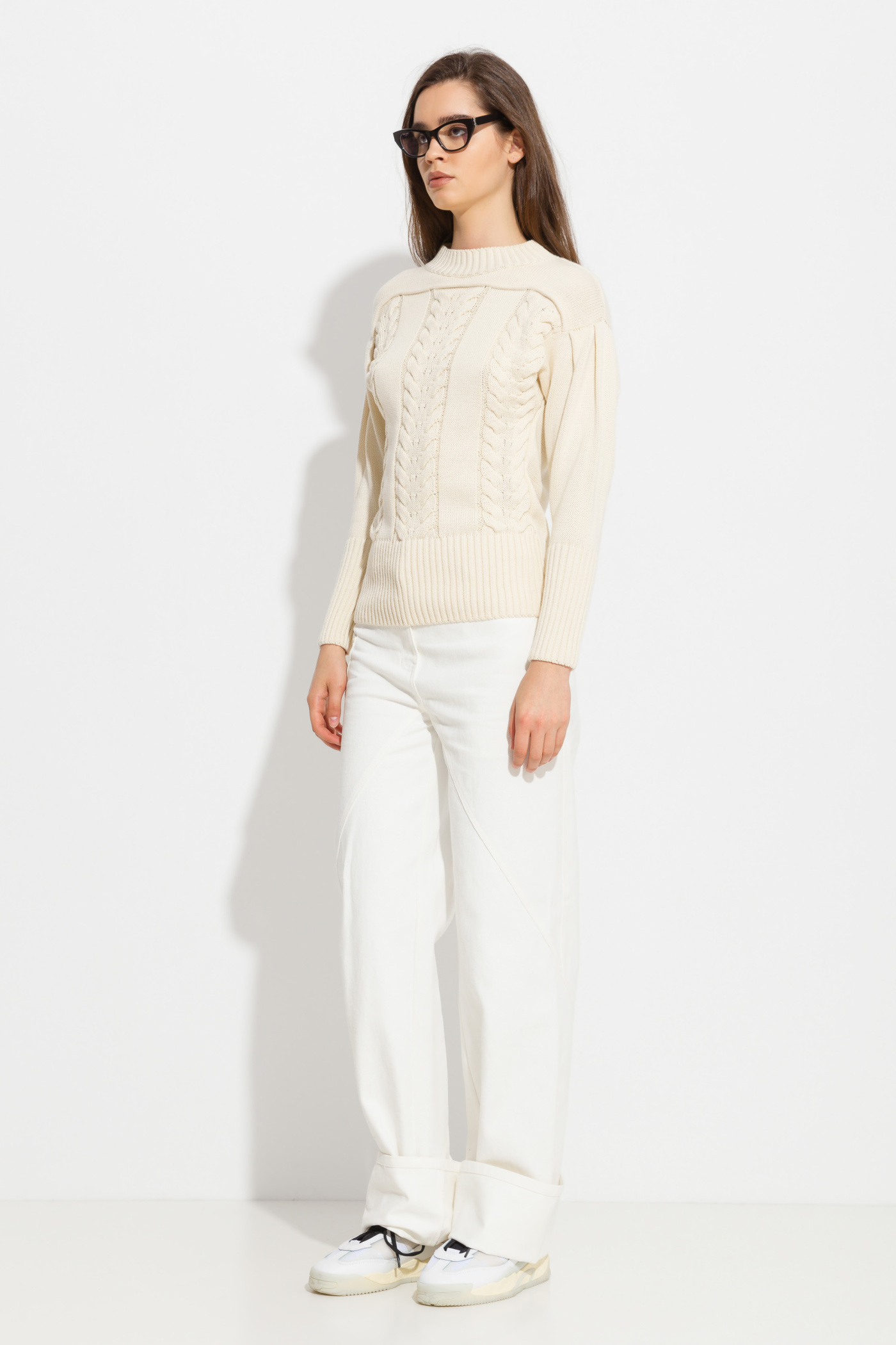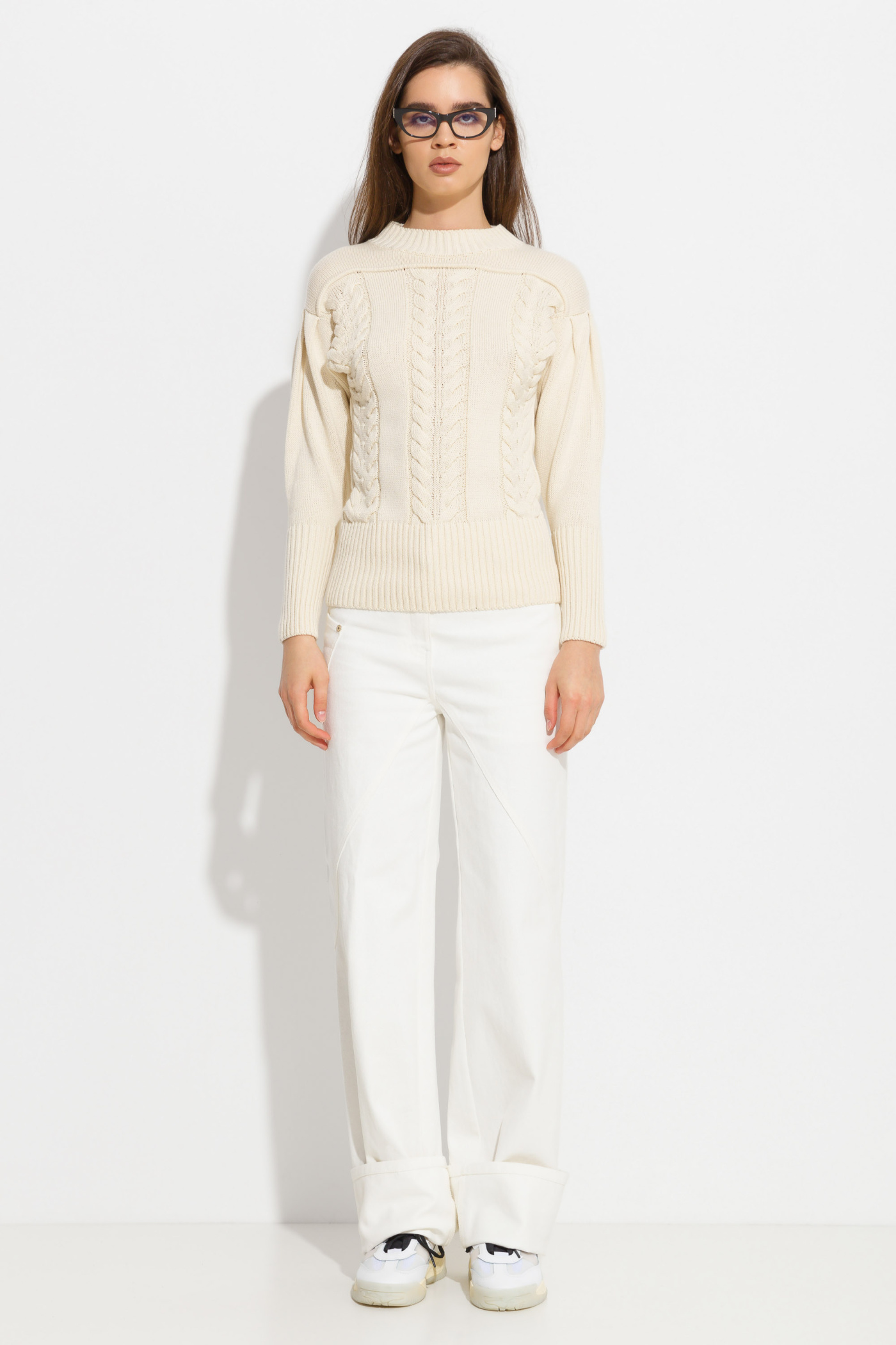 Свитер вязаный полуприлегающего силуэта, длиной выше линии бедер. Круглый вырез горловины. Линия плеч спущена. Объемные рукава на широких манжетах. Комфортная, теплая модель для ежедневных образов.