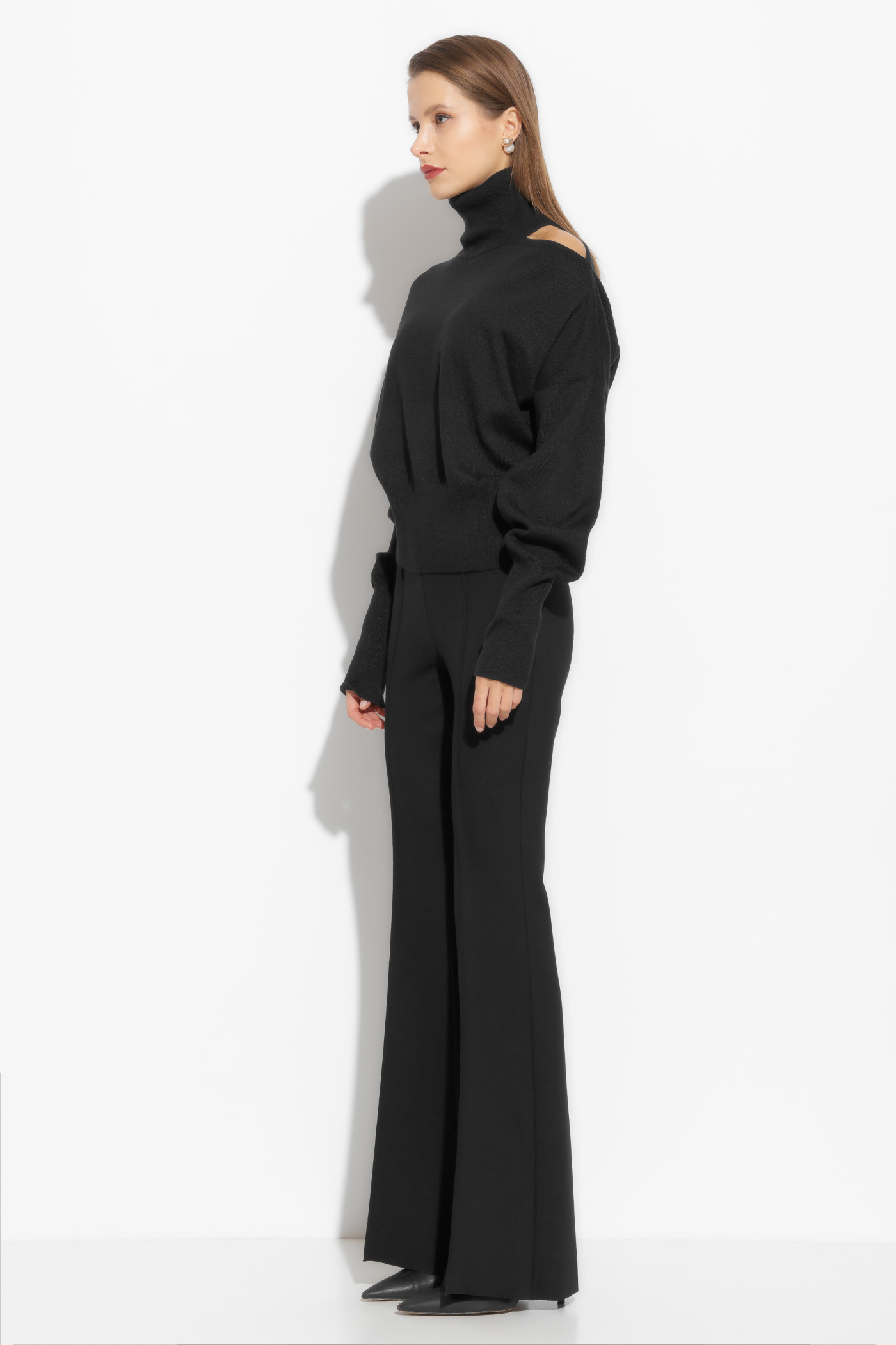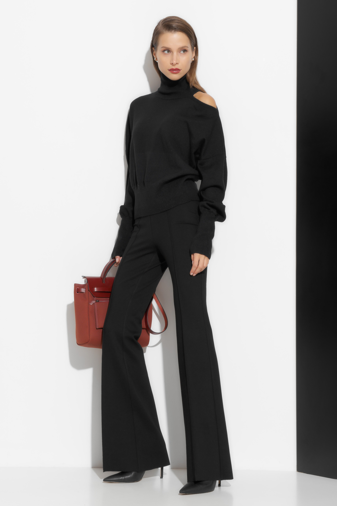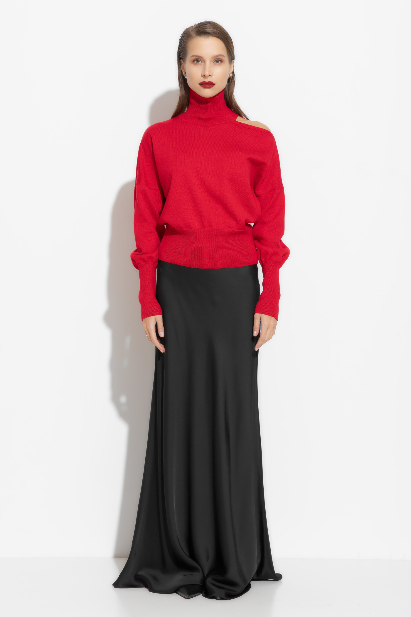 Джемпер вязаный полуприлегающего силуэта. Рукава и низ изделия на эластичных манжетах. Горловина высокая. Открытое плечо добавляет образу эффектности и романтичности. Стильная модель для создания эффектных образов.