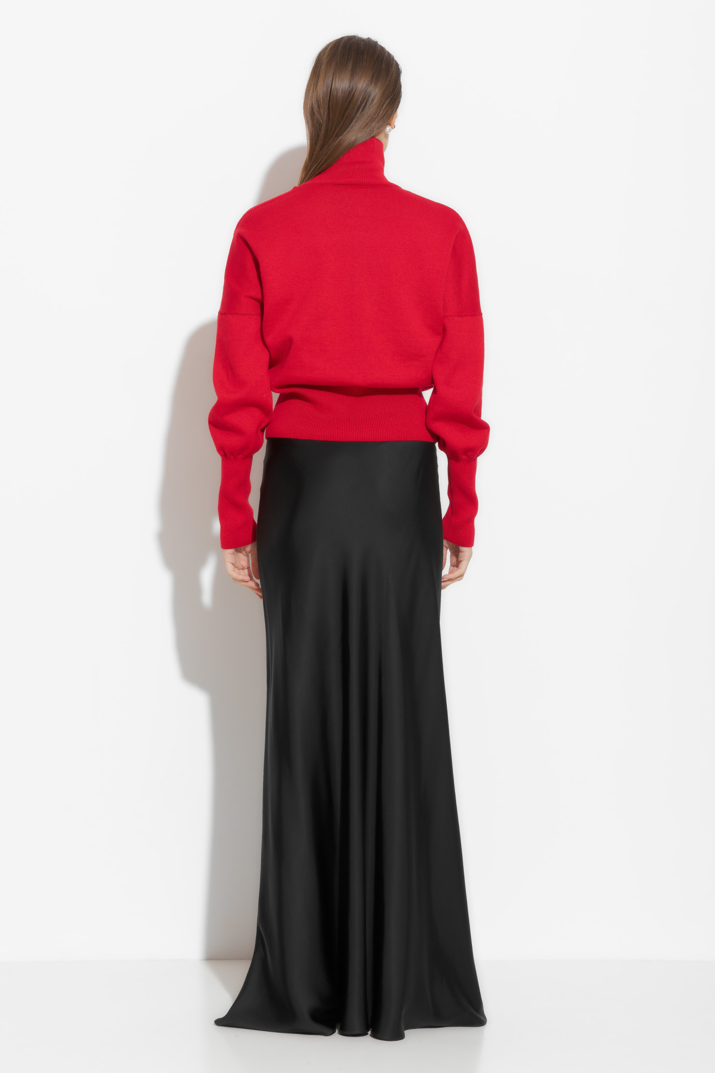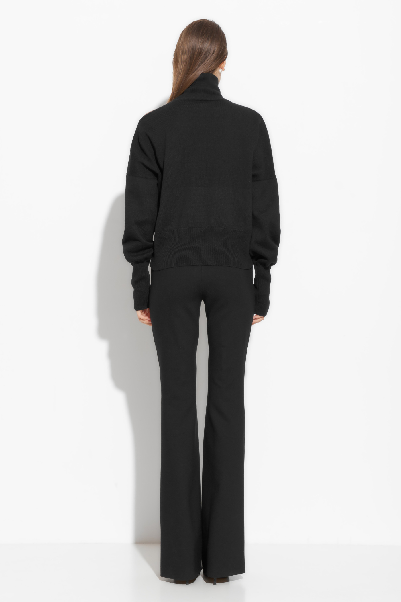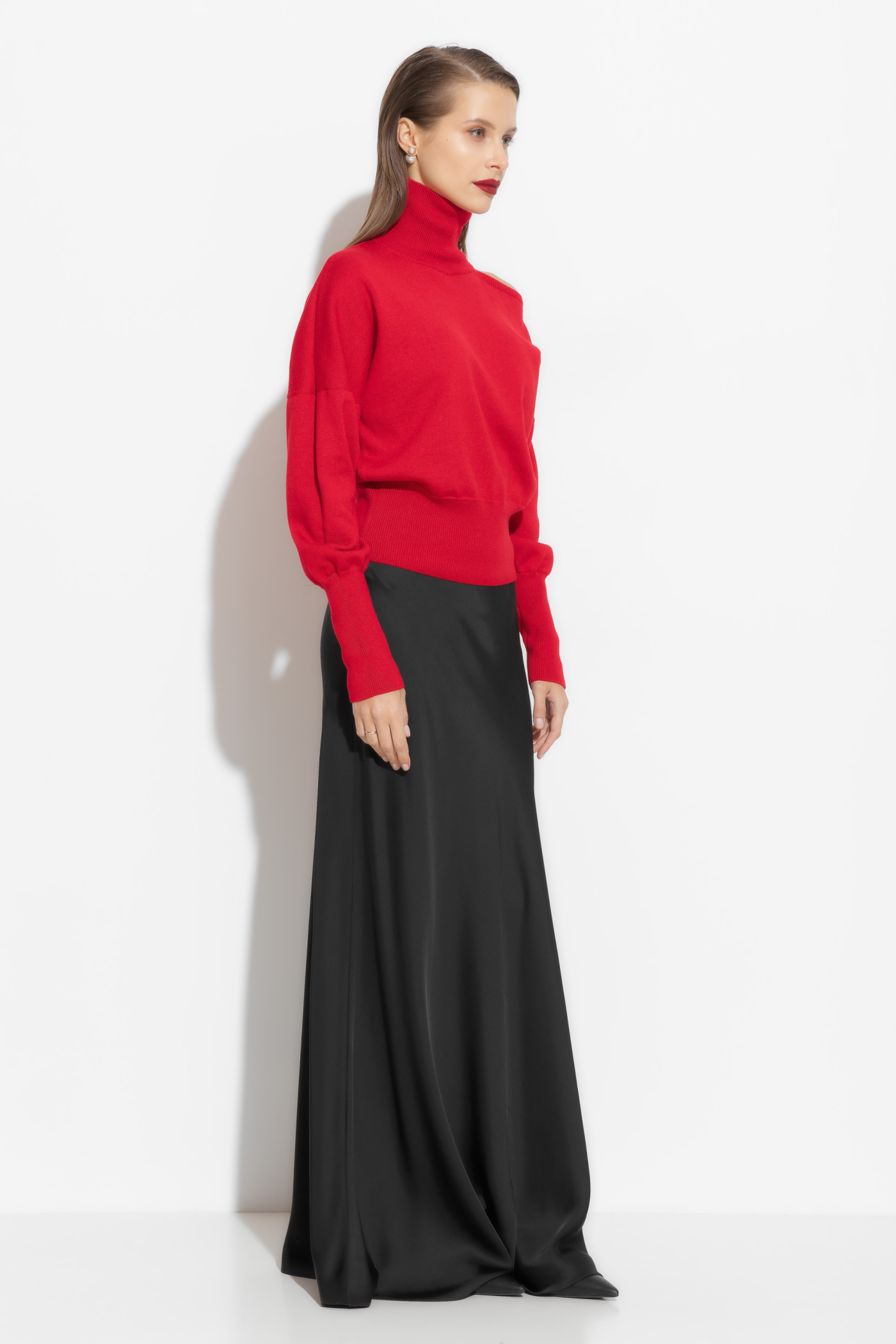 Джемпер вязаный полуприлегающего силуэта. Рукава и низ изделия на эластичных манжетах. Горловина высокая. Открытое плечо добавляет образу эффектности и романтичности. Стильная модель для создания эффектных образов.