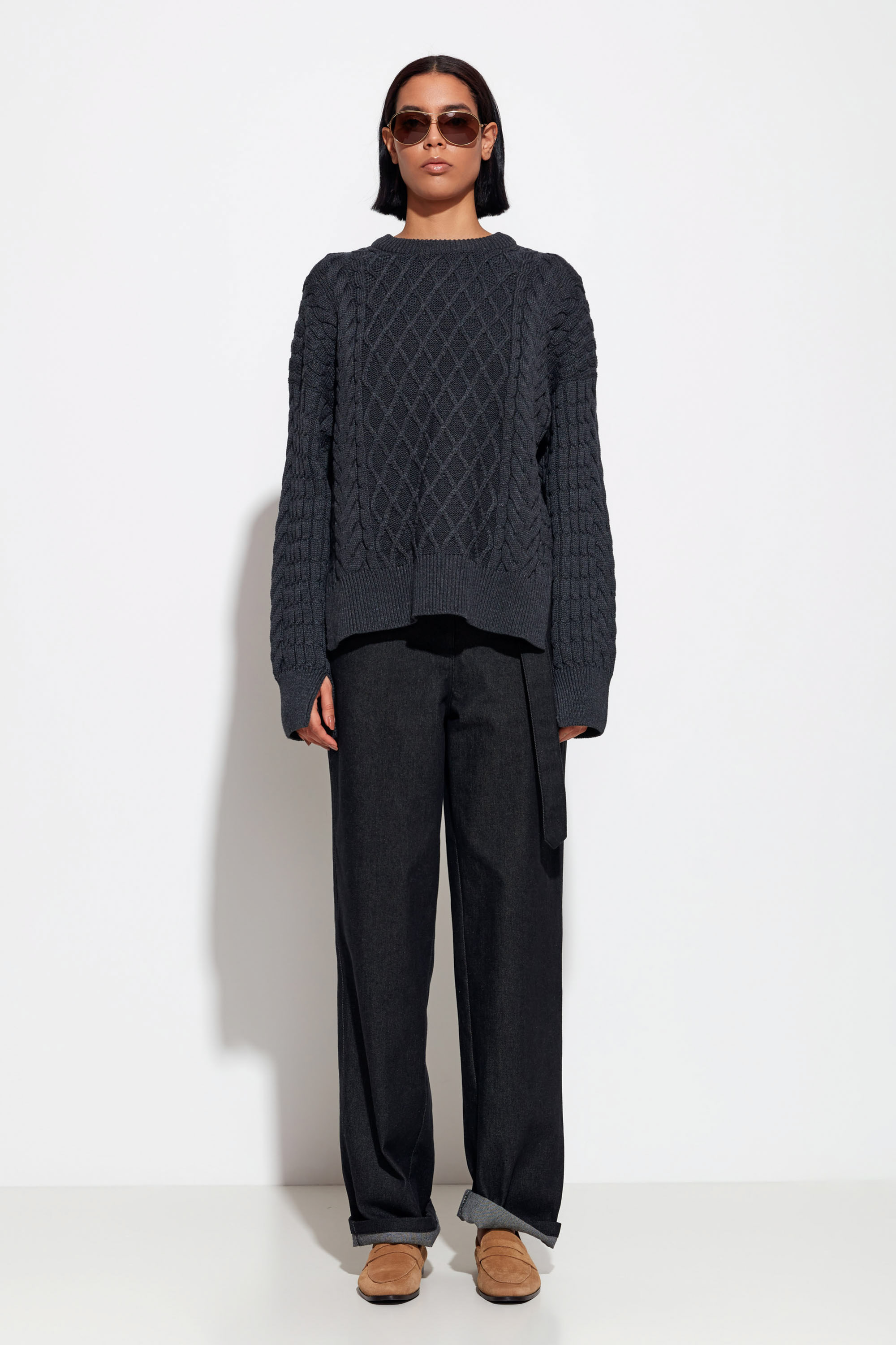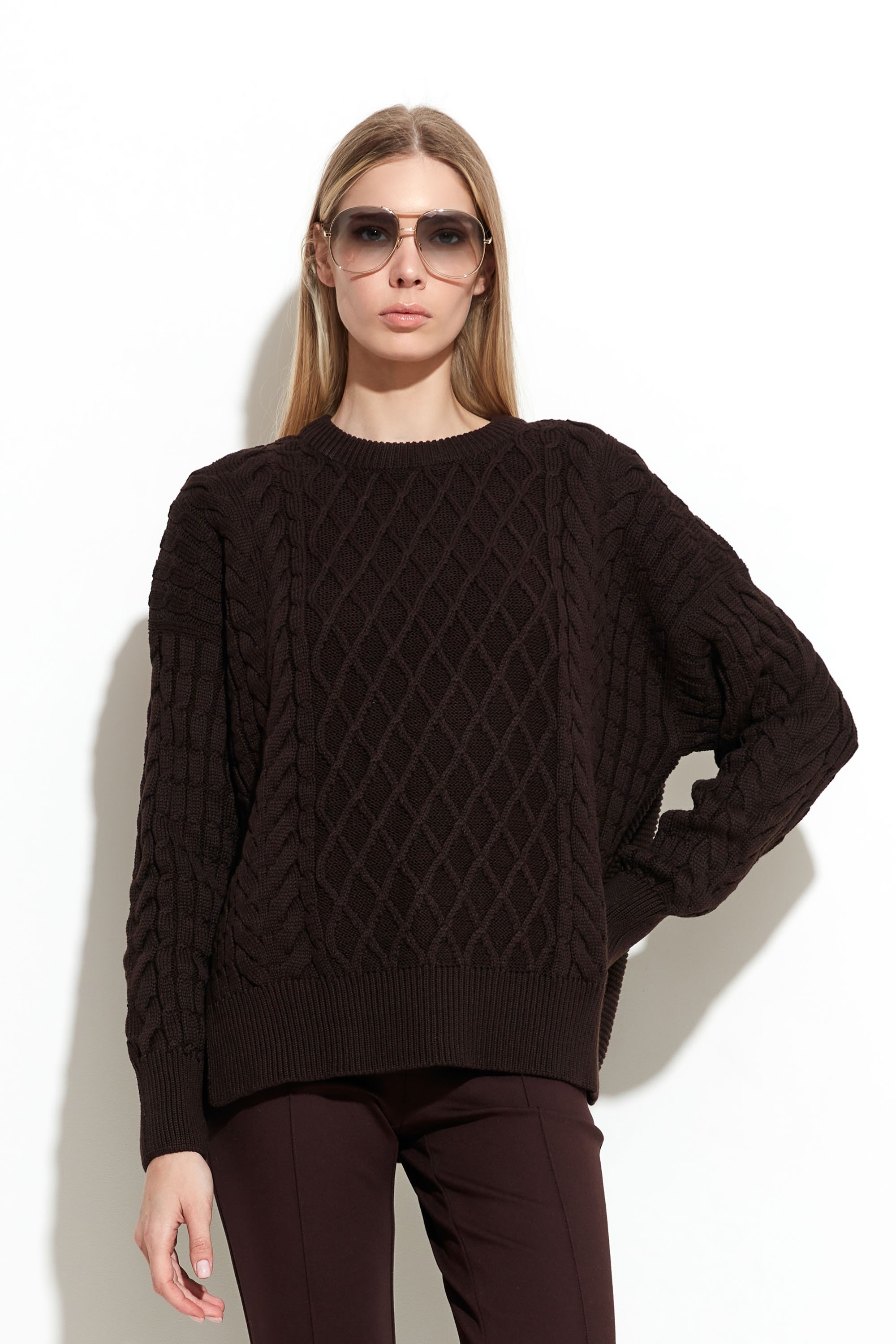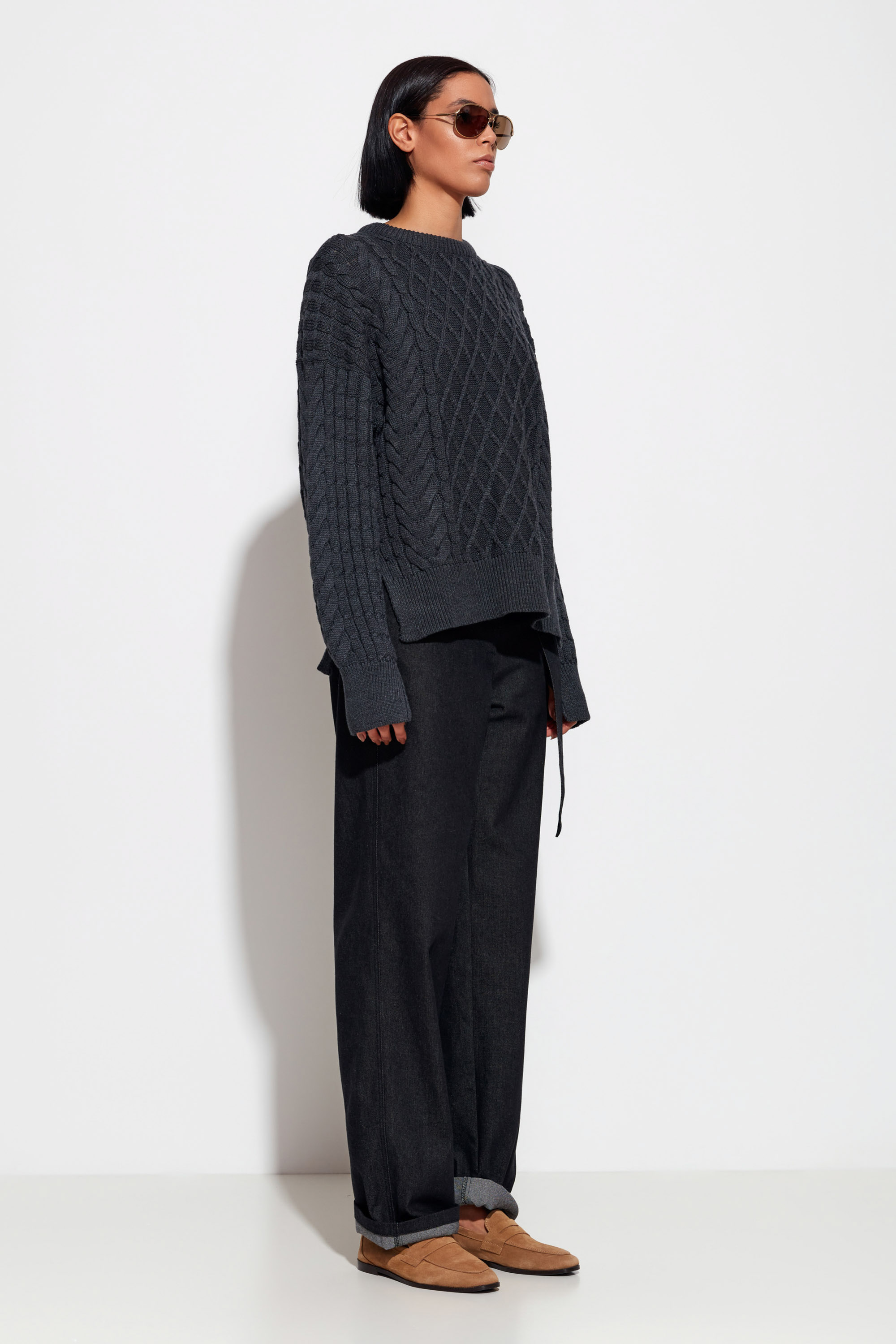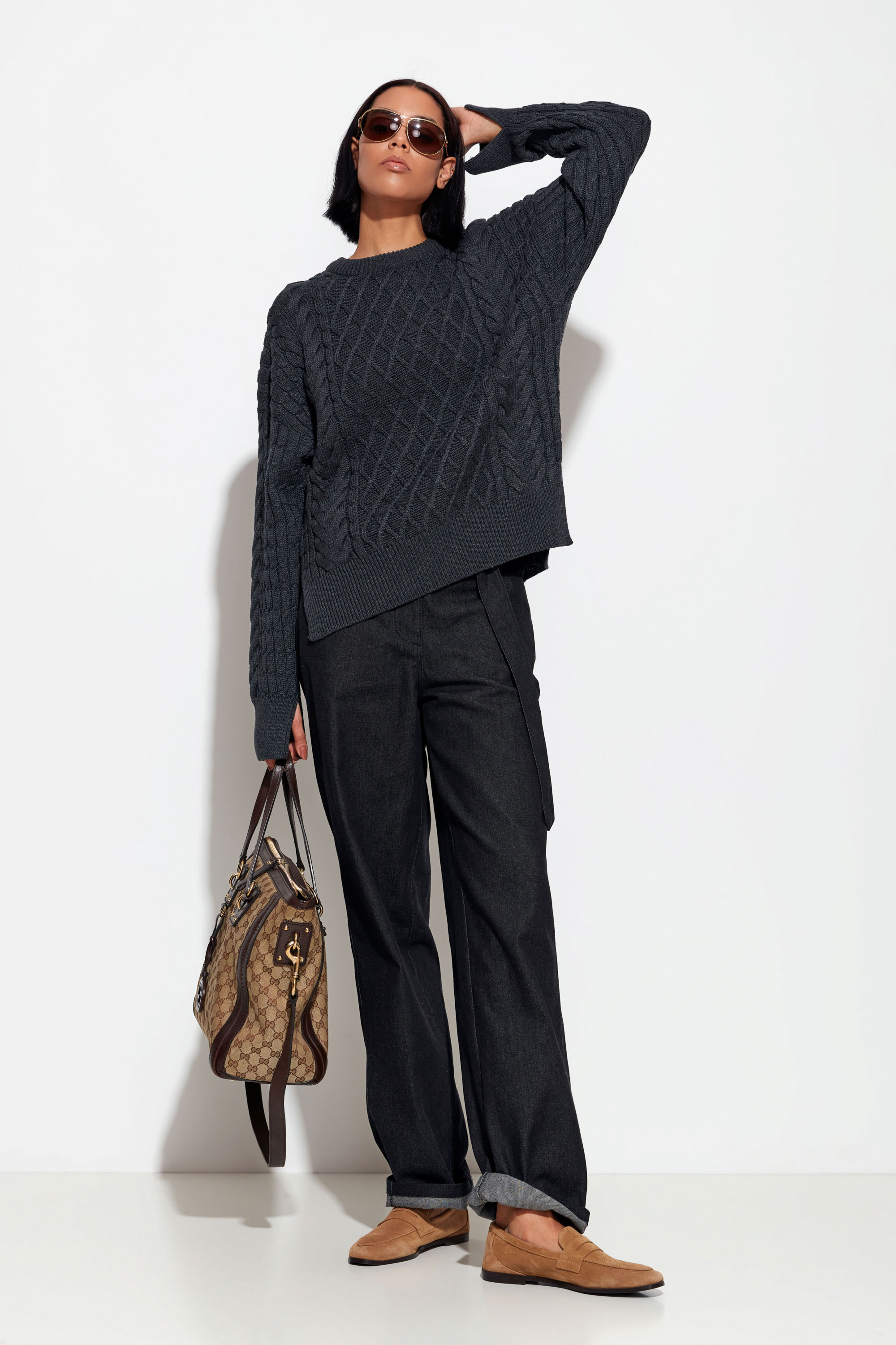 Джемпер свободного кроя Lakbi из коллекции осень-зима 2025/26 — это образец повседневной универсальности, переосмысленной в духе актуального минимализма. Модель выполнена из мягкой пряжи с составом 50% хлопок и 50% полиакрил (ПАН), что обеспечивает баланс между природным комфортом и долговечностью. Джемпер имеет свободный силуэт, спущенную линию плеч и широкую резинку по низу — эти детали создают расслабленный, но собранный образ.