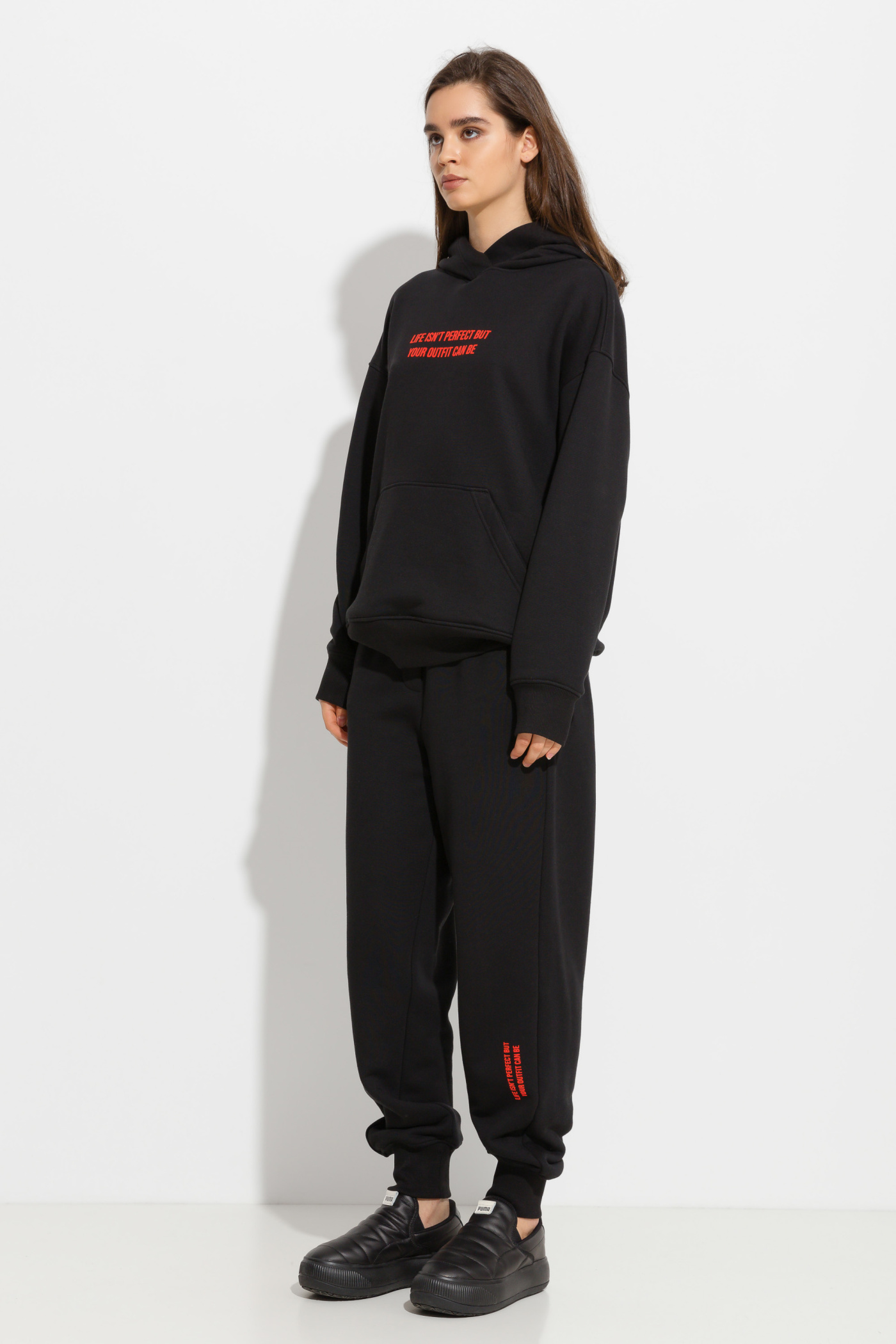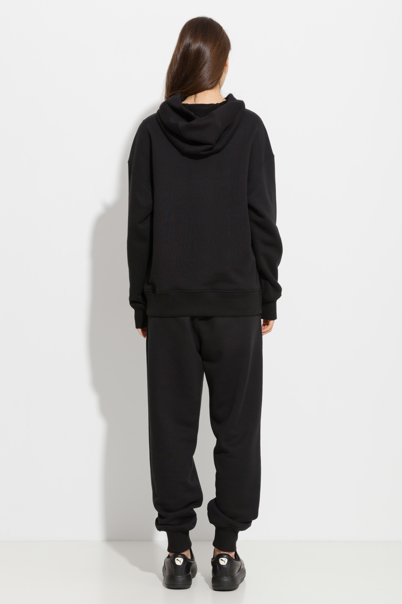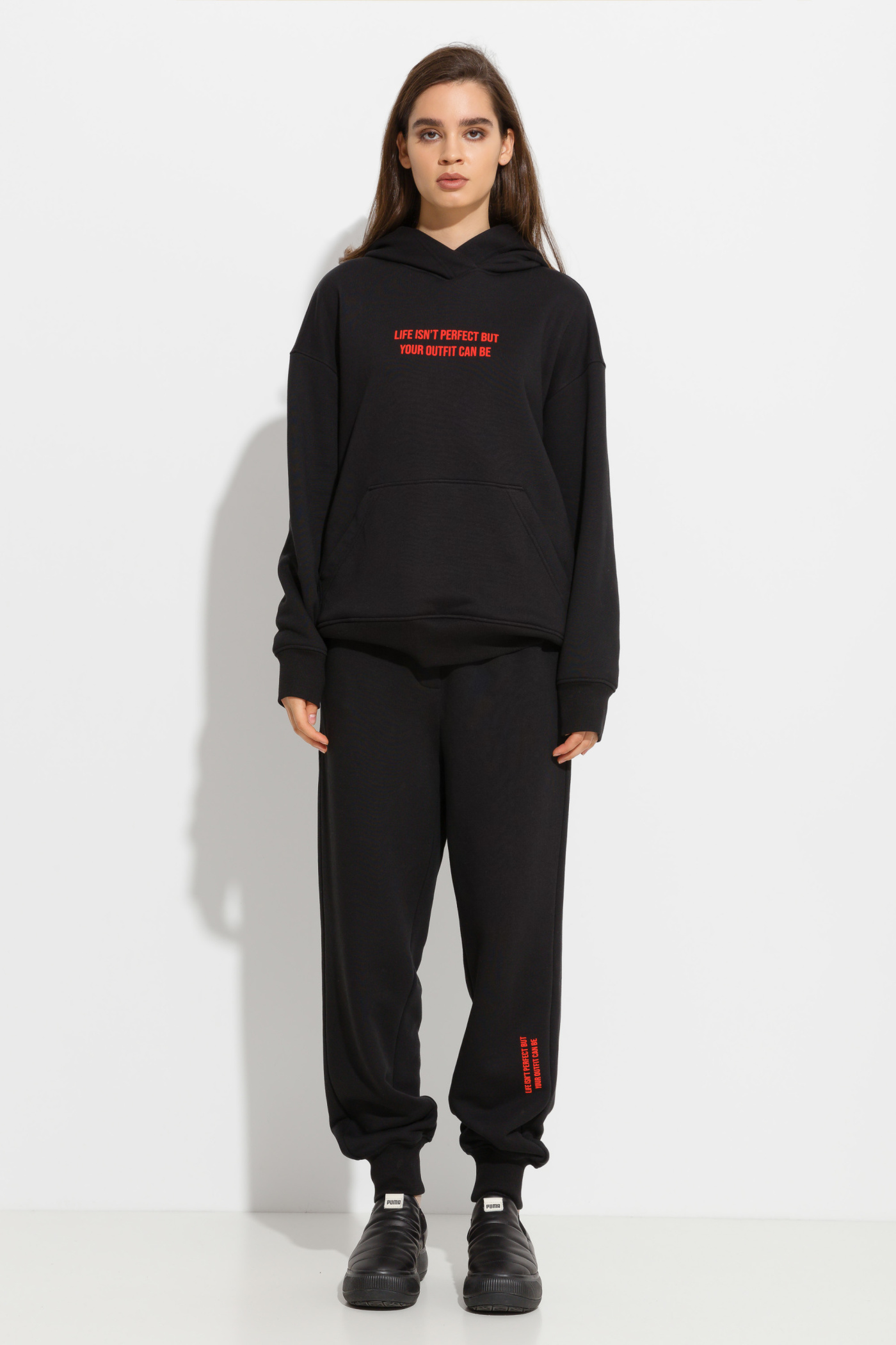 Свитшот свободного кроя, длиной до середины линии бедер. Изделие с капюшоном. Линия плеч спущена. Спереди накладной карман-кенгуру. Рукава и низ свитшота на широких эластичных манжетах. Спереди на уровне груди декор в виде принта. Комфортная, базовая модель для ежедневных дел.