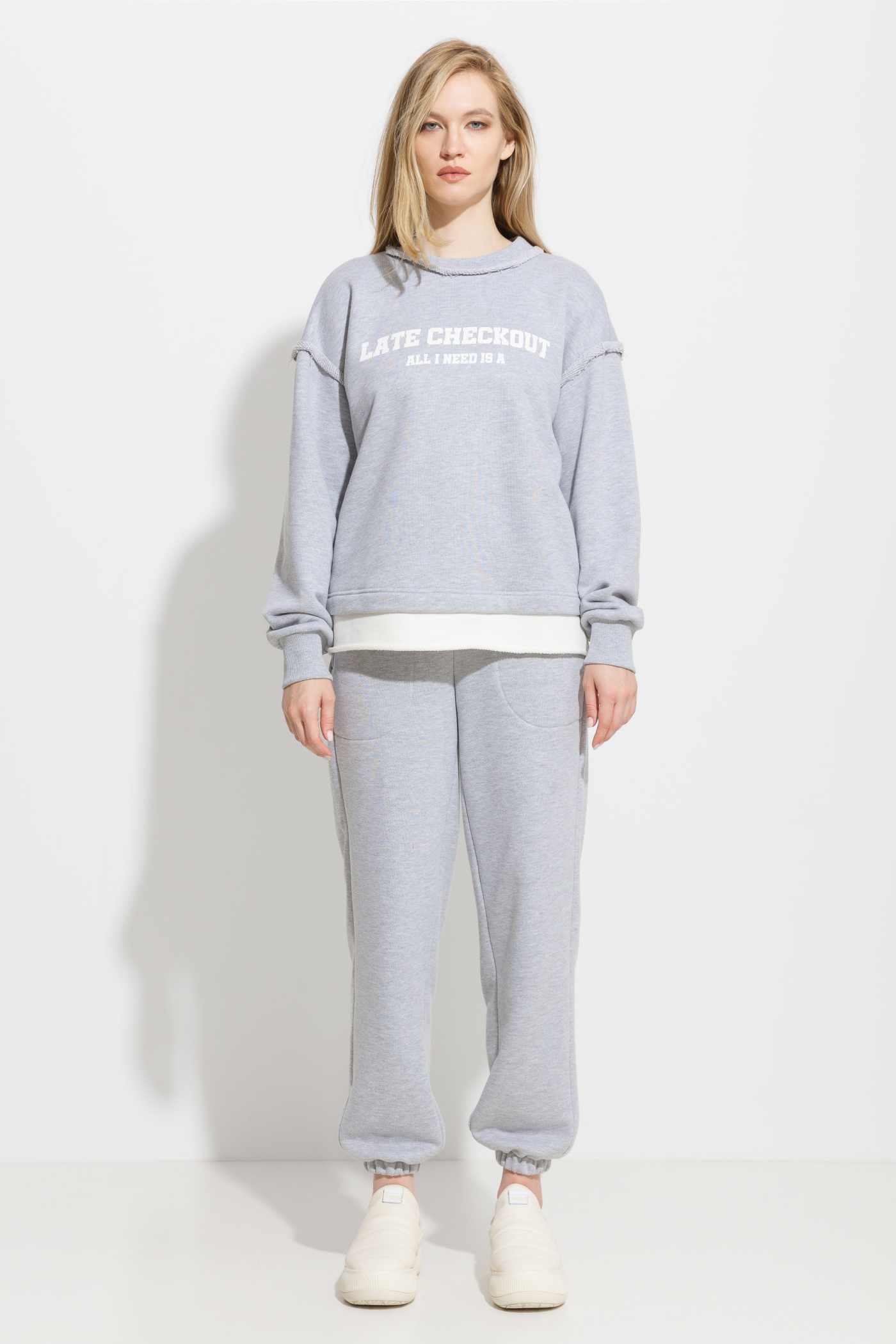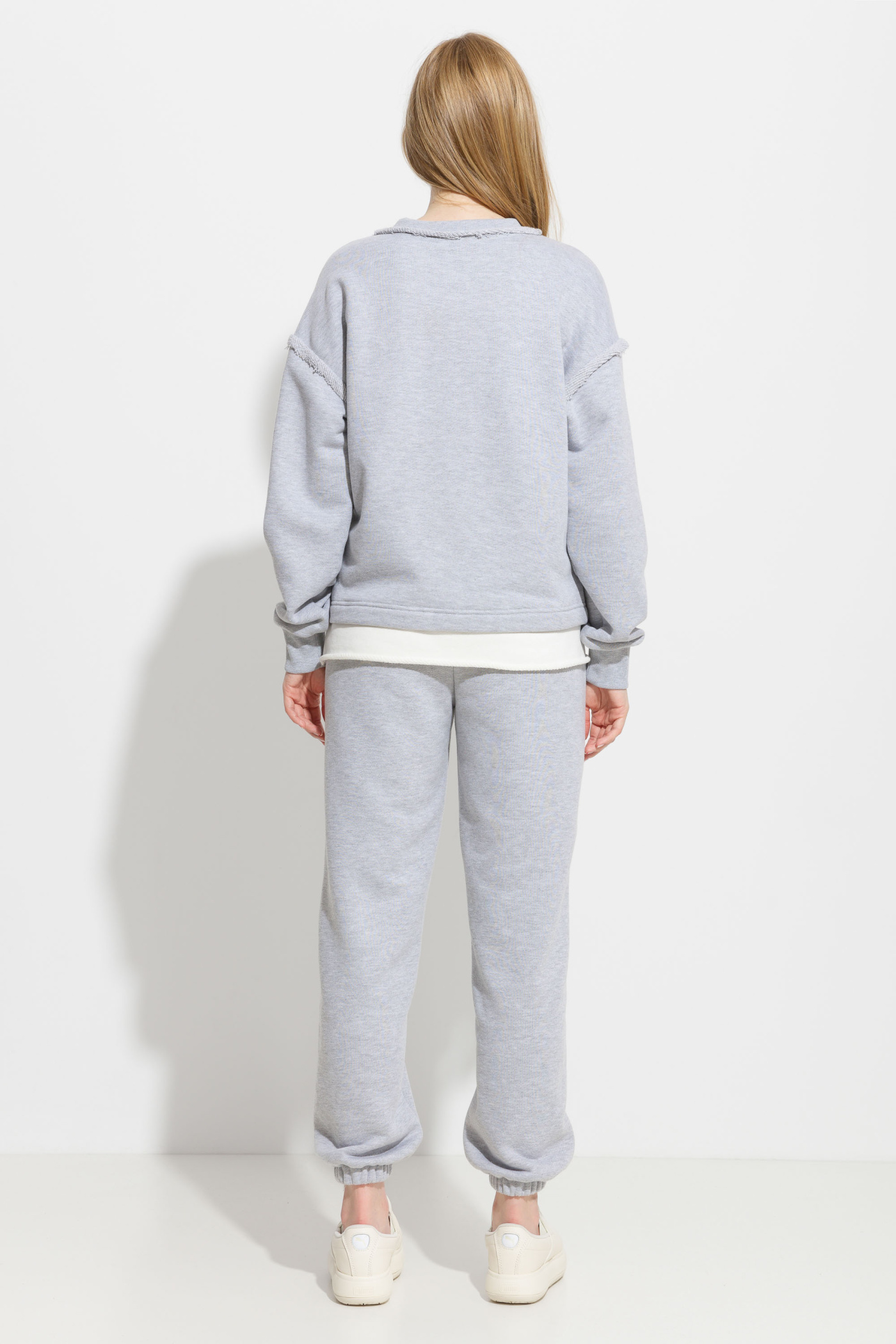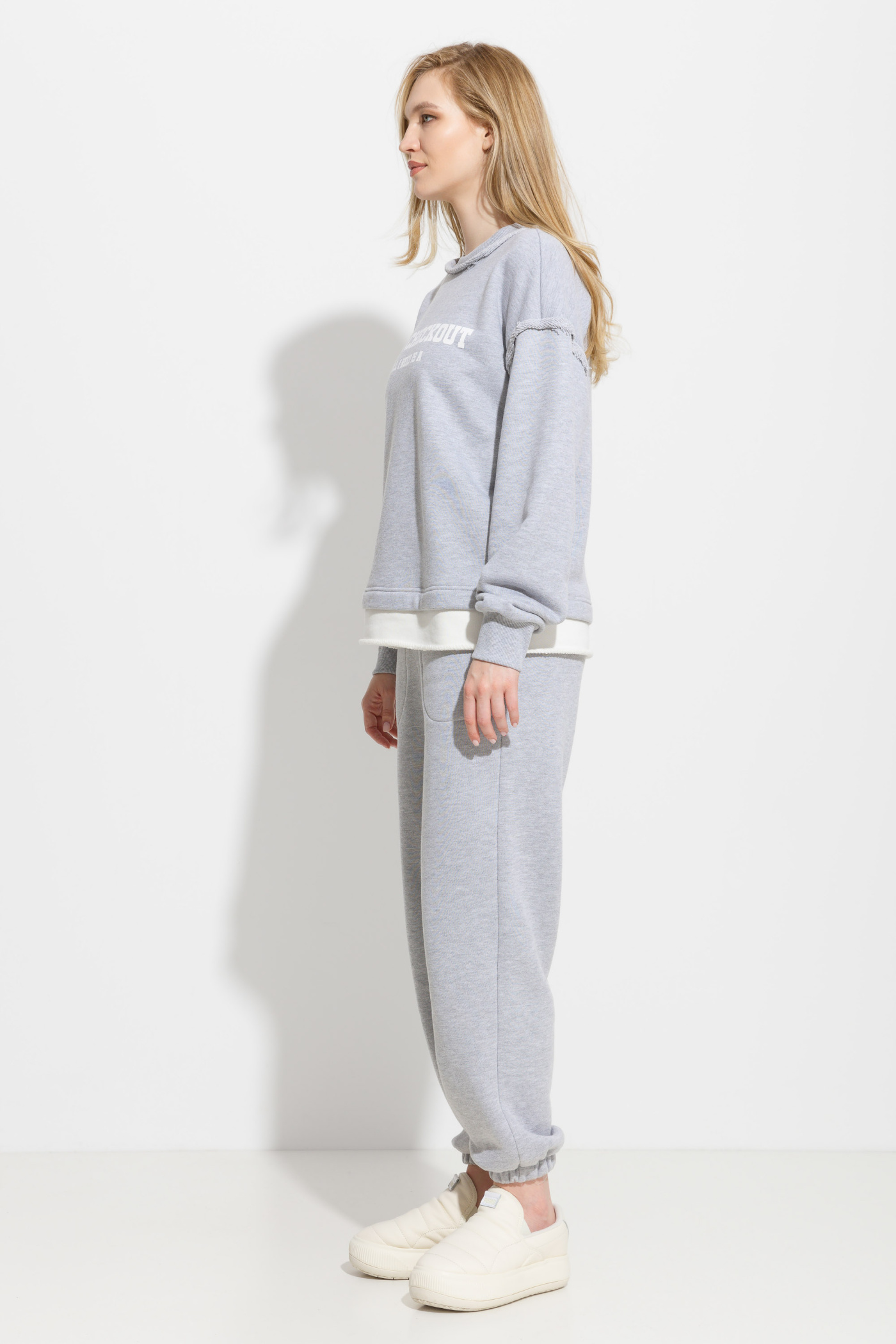 Свитшот прямого кроя, длиной до середины линии бедер. Круглый вырез горловины. Линия плеч спущена. Рукава на широких манжетах. Перед изделия декорирован печатью. По низу изделия вставка из аналогичной ткани контрастного цвета. Комфортная, универсальная модель для активного отдыха и прогулок по городу.