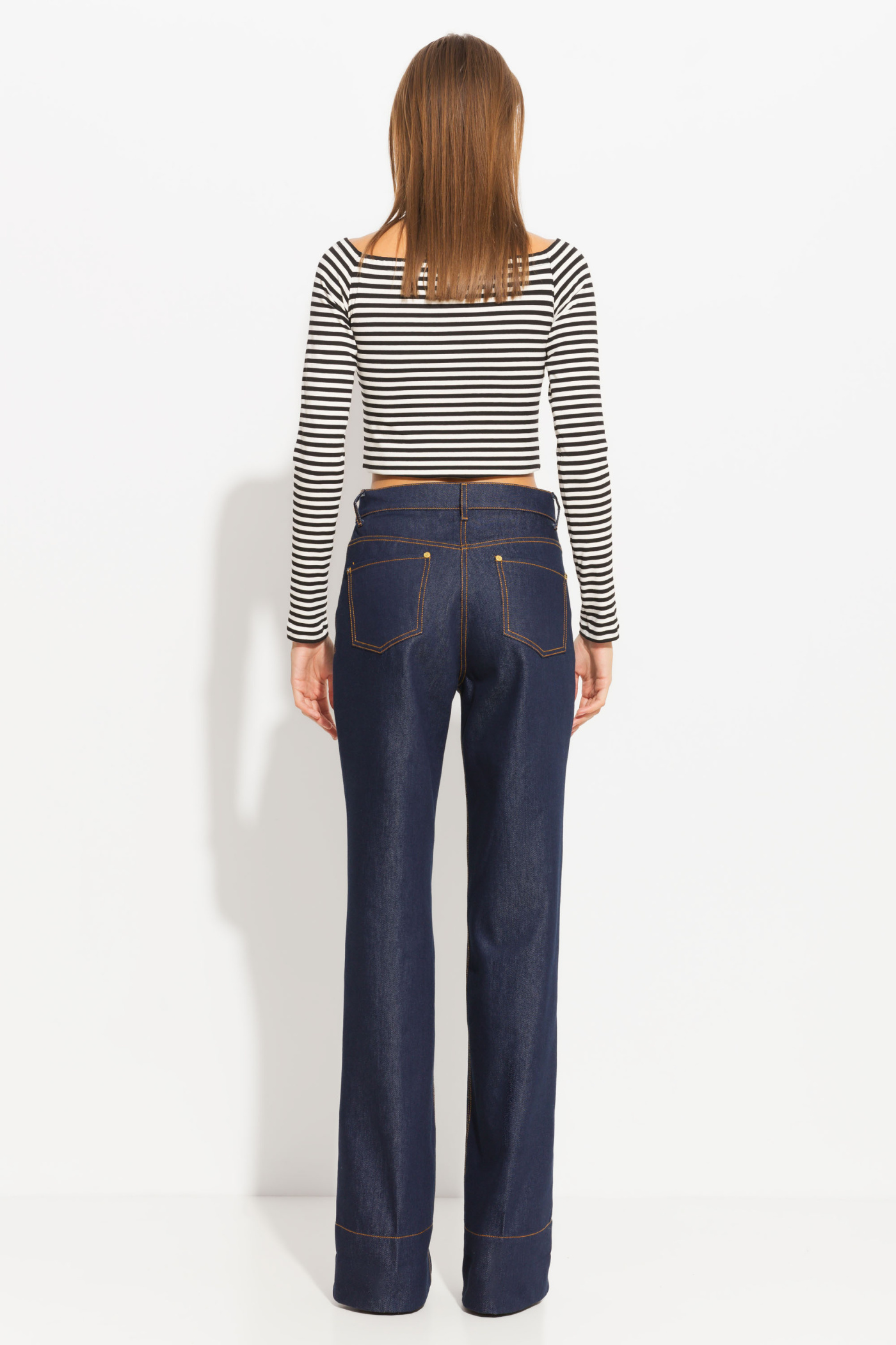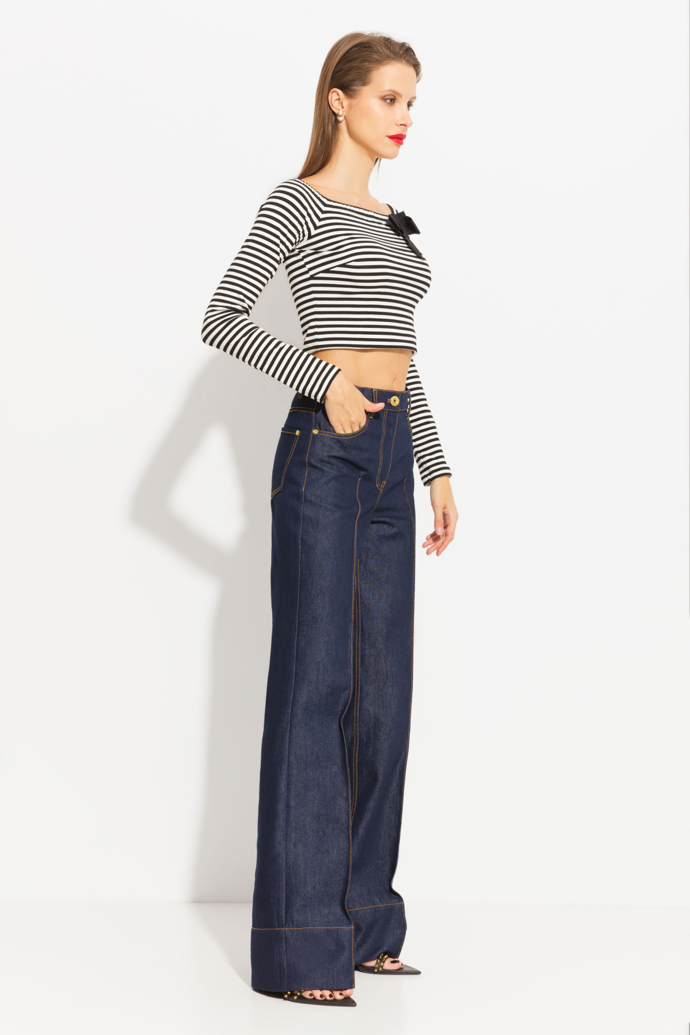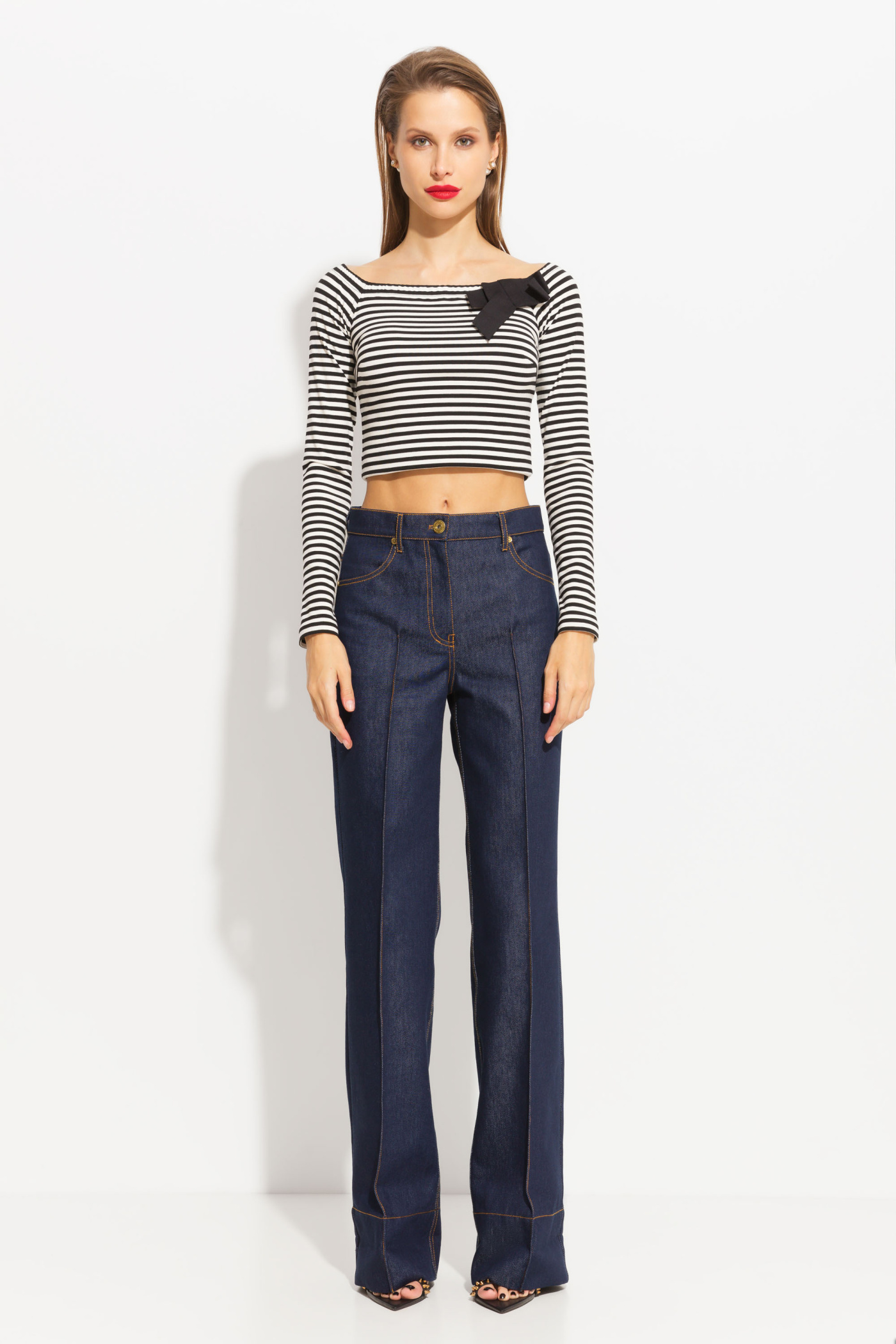 Джемпер в полоску прилегающего силуэта, укороченной длины. Вырез горловины – лодочка. На груди декор в виде объемных нашивок. Рукав длинный. Стильная, базовая модель и расцветка позволяют сочетать джемпер с любым типом гардероба.