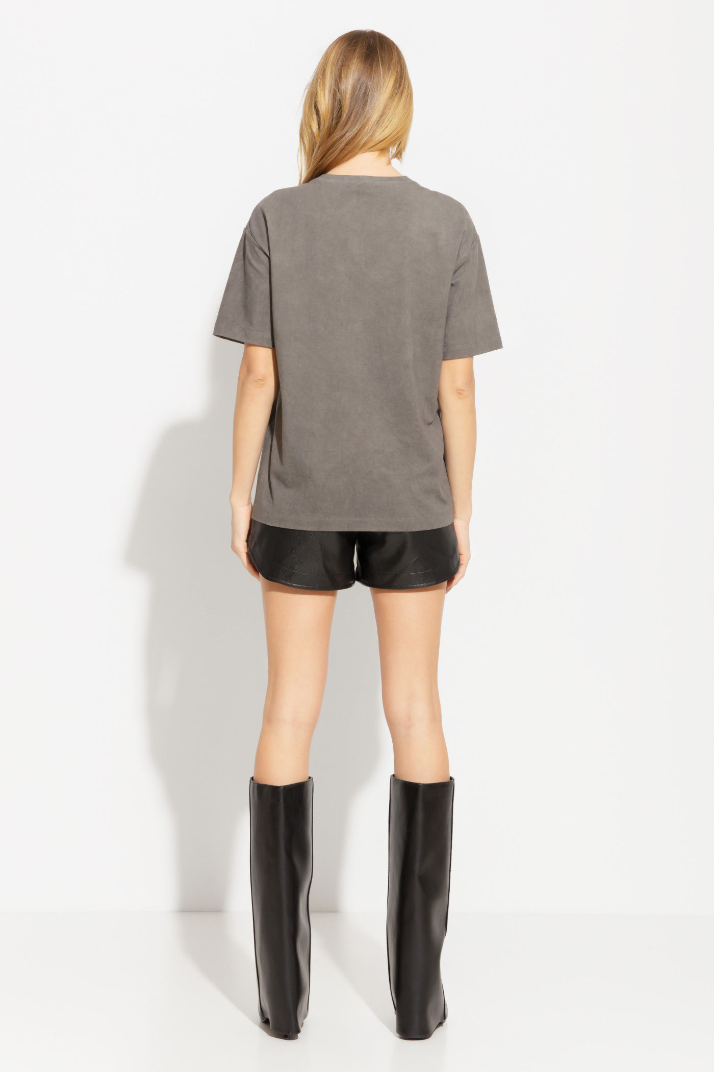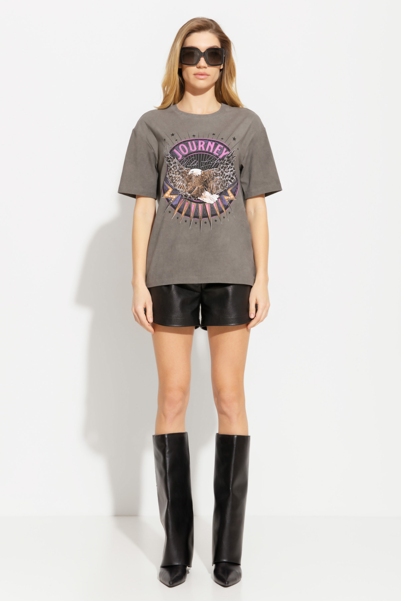 Футболка прямого кроя, длиной до середины линии бедер. Перед изделия декорирован трендовым принтом. Округлый вырез горловины. Линия плеч спущена. Базовая модель, которая подойдет к любому типу гардероба.