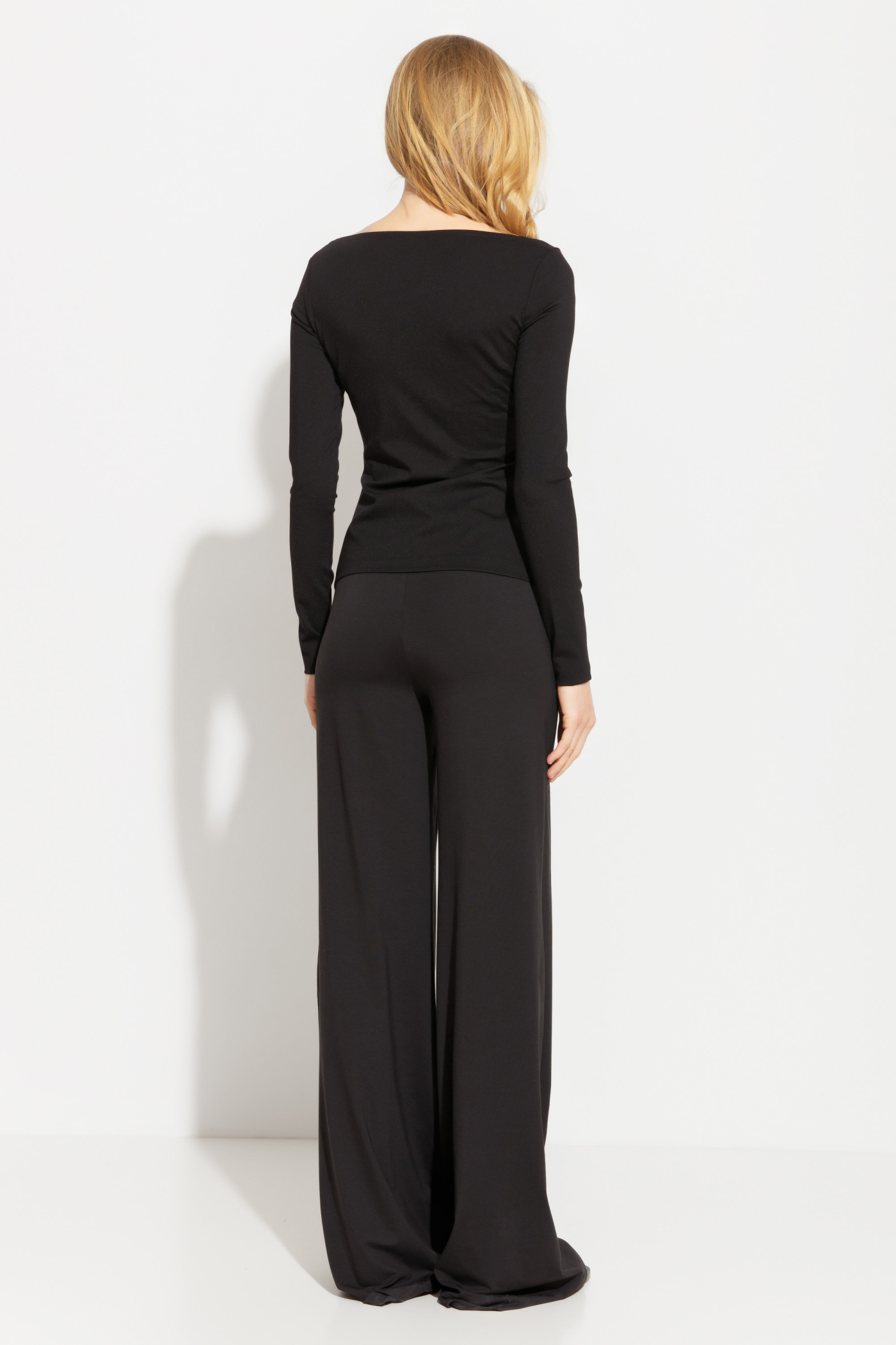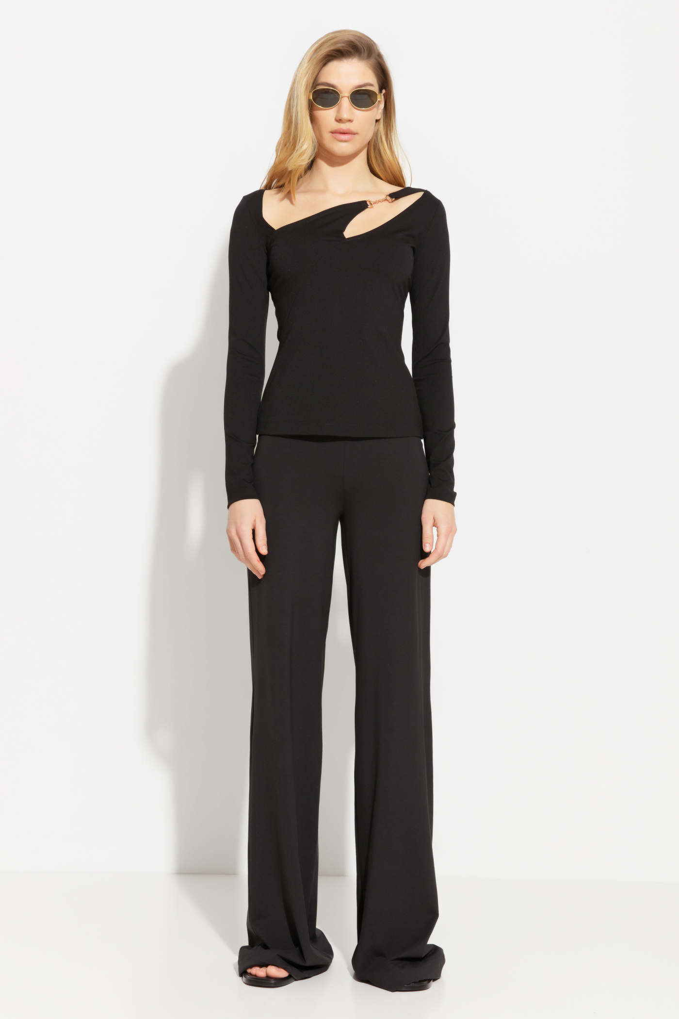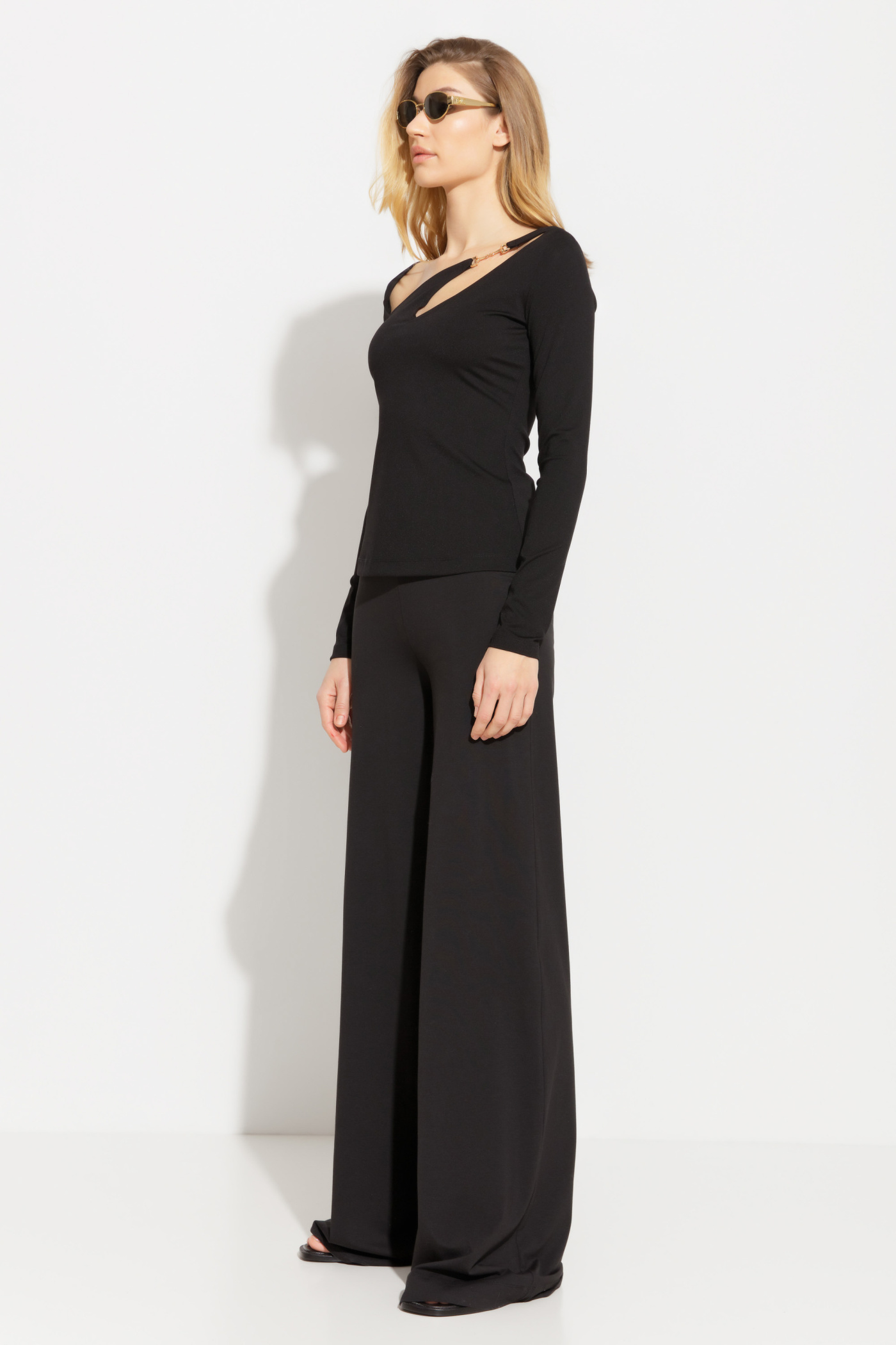 Джемпер прилегающего силуэта, длиной выше линии бедер. Фигурный вырез горловины с металлическим декором делает образ эффектным и незаурядным. Комфортная телу ткань не сковывает движений и дает чувство комфорта на весь день. Идеальный вариант для создания смелых и стильных аутфитов.