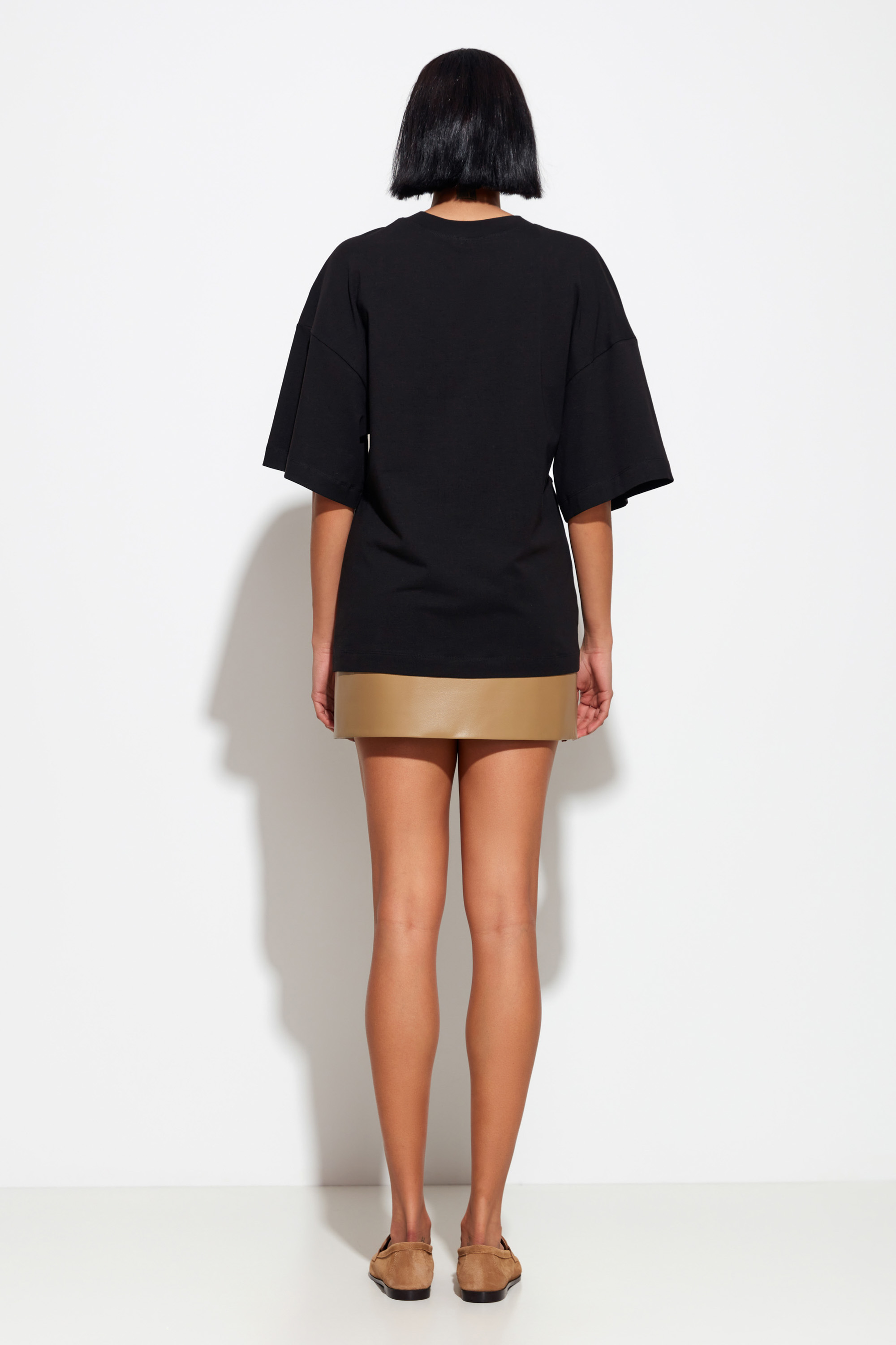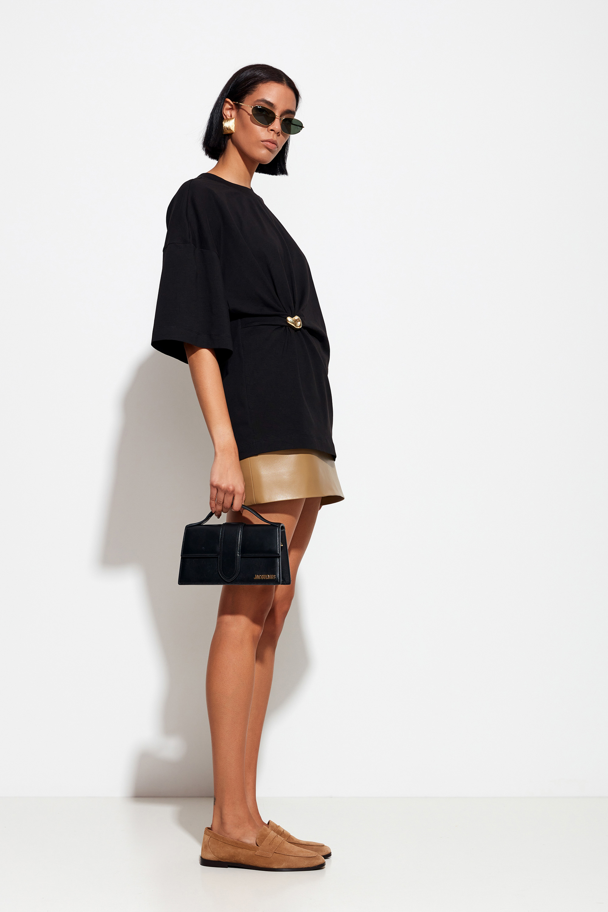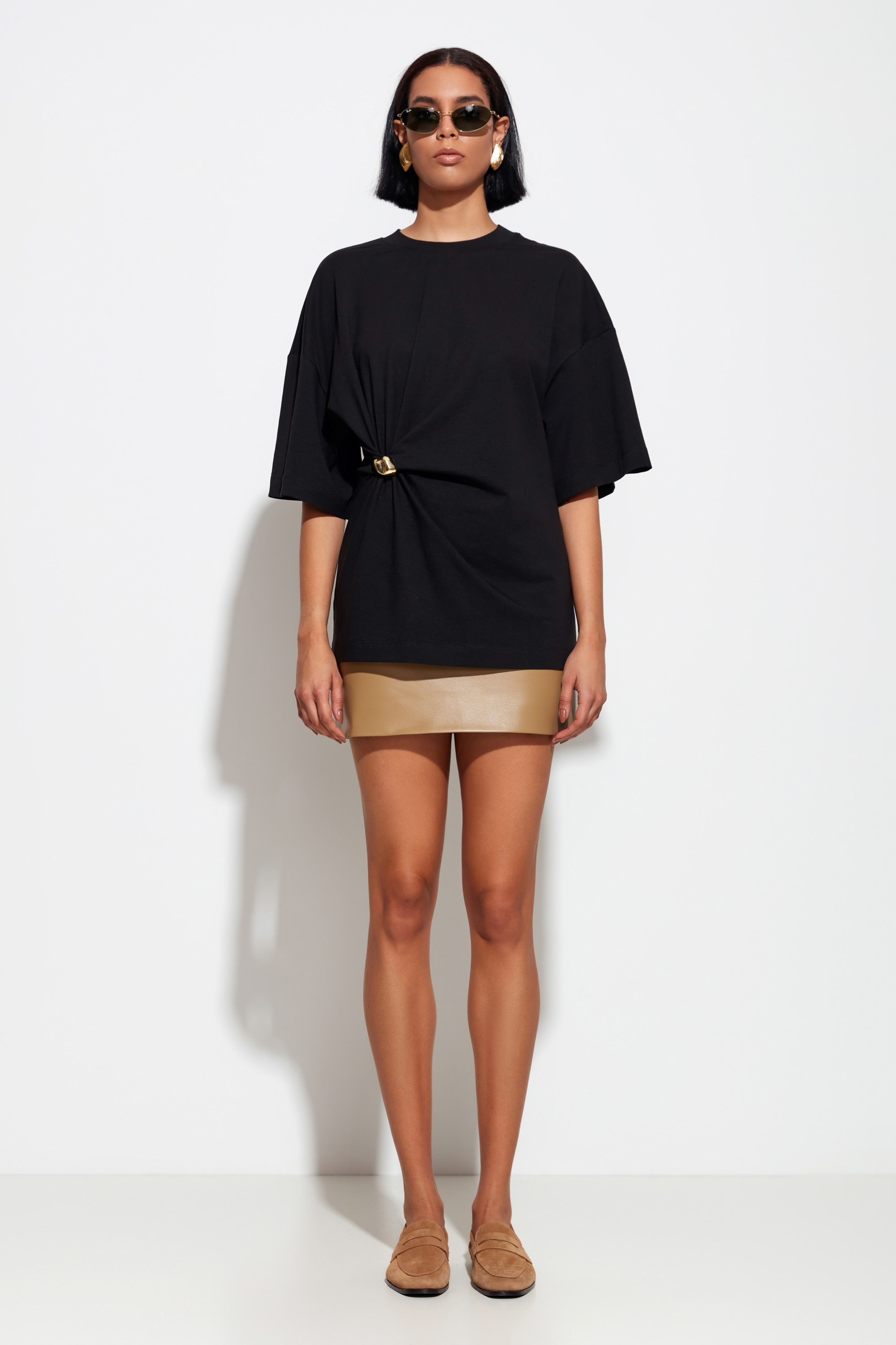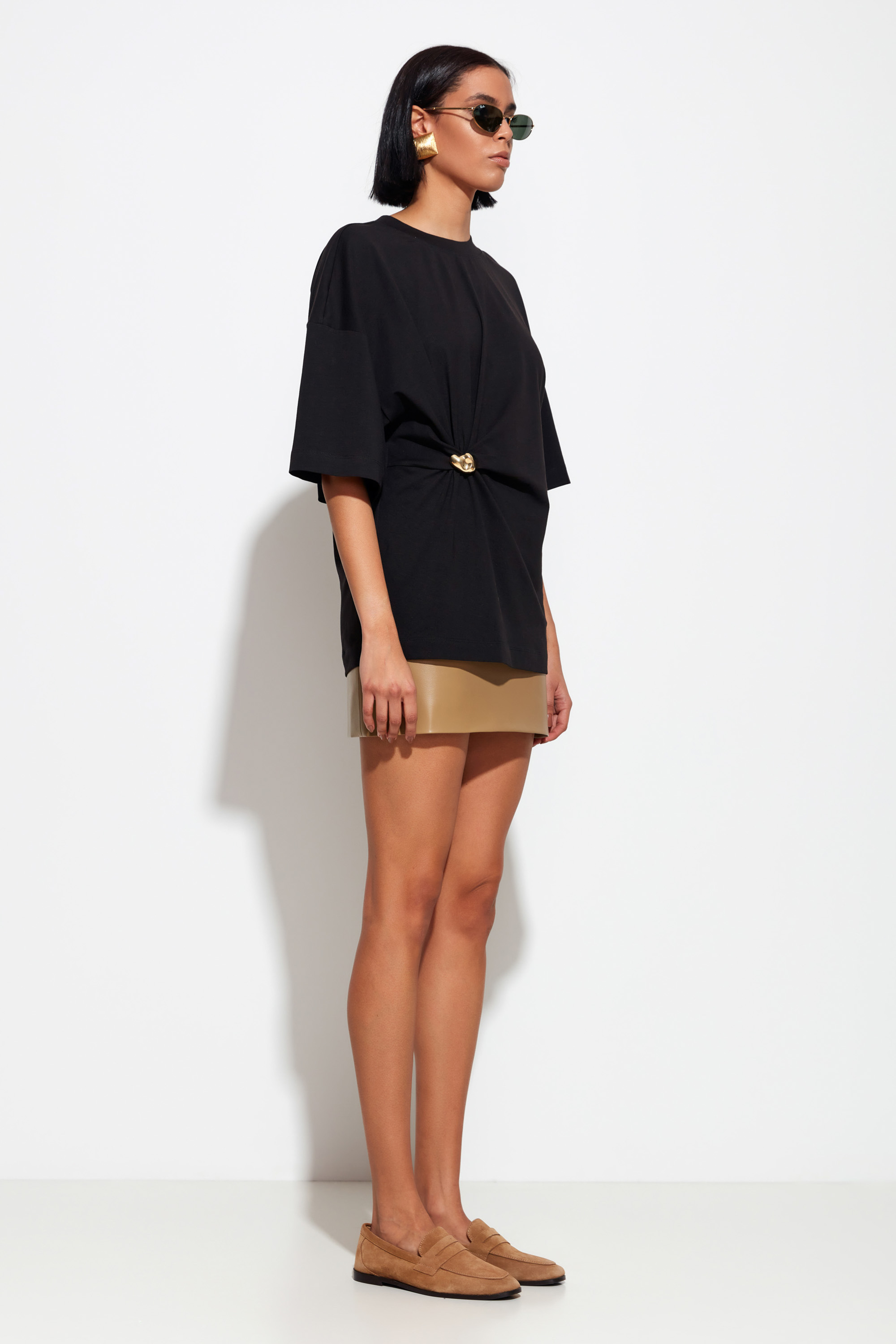 Удлинённая черная футболка Lakbi из коллекции осень-зима 2025/26 — элегантная и комфортная модель с оригинальным декором в виде золотой броши. Мягкий и приятный к телу материал создаёт удобство на весь день, а удлинённый крой придаёт образу современность и лёгкую неформальность.
