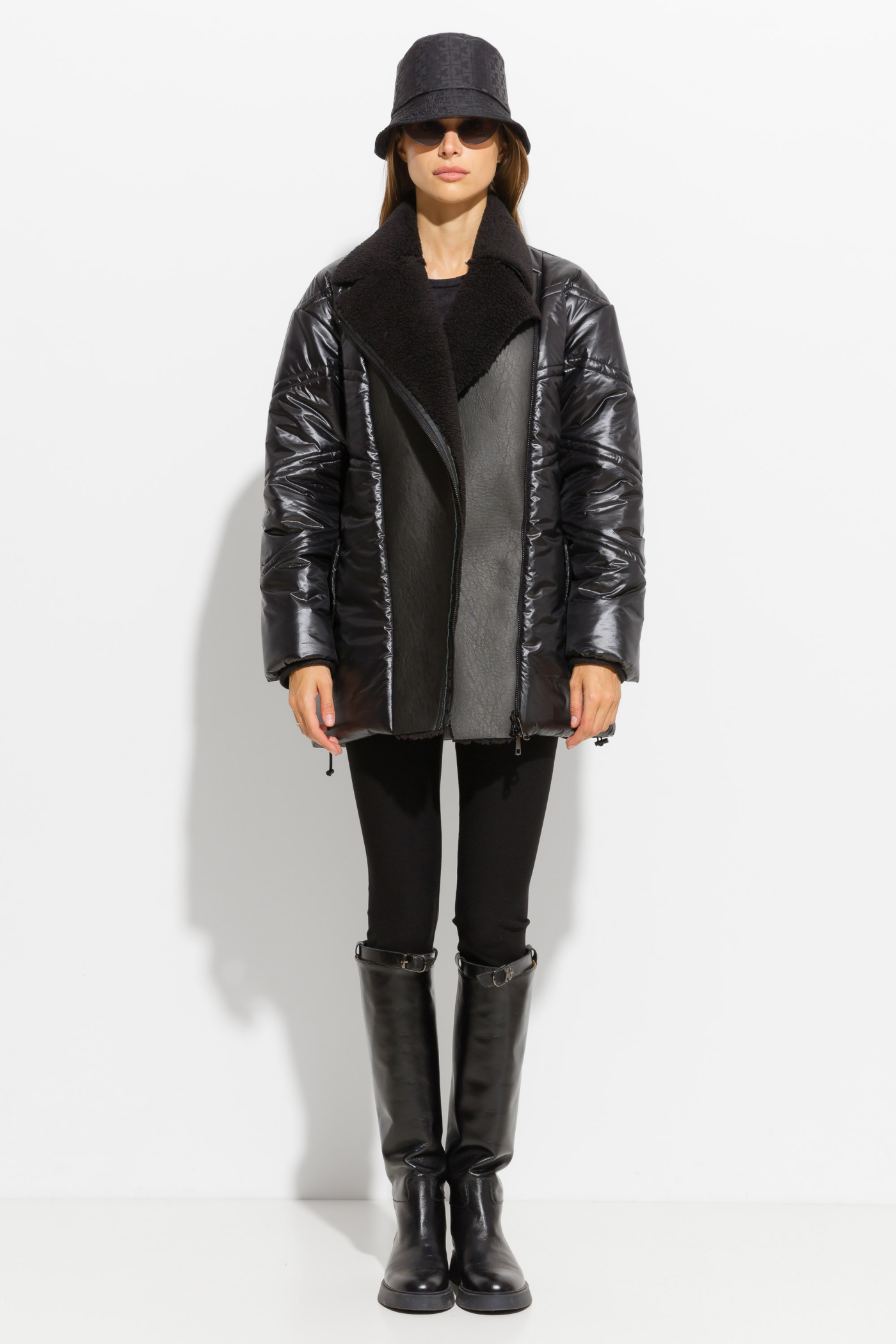 Куртка прямого кроя, длиной ниже линии бедер. Передняя часть выполнена из дублированной ткани. Воротник стояче-отложной. Линия плеча спущена. Комфортная, теплая модель, которая согреет в холодную зимнюю погоду.