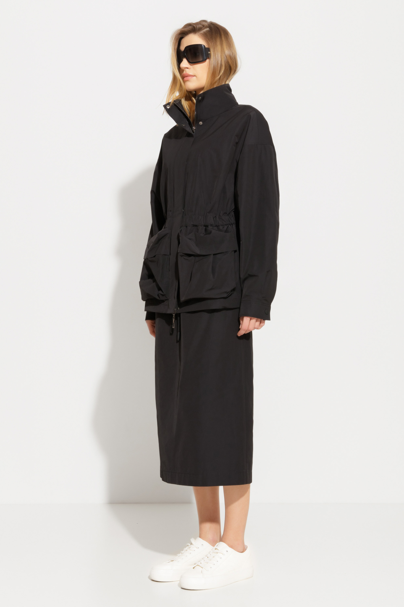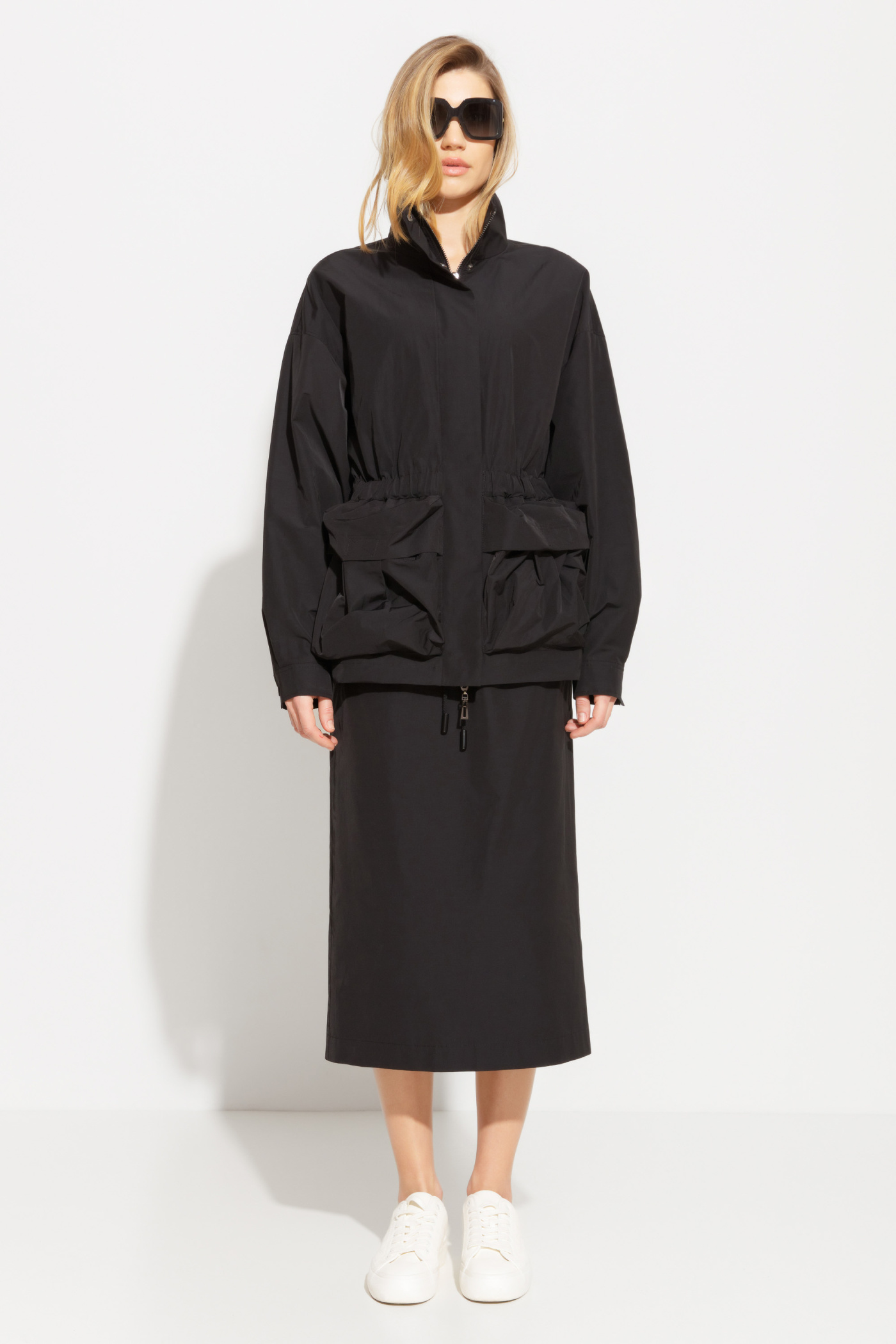 Куртка свободного кроя, длиной ниже линии бедер. Воротник стояче-отложной. Линия плеч спущена. Объем талии регулируется при помощи тесьмы. Спереди два накладных кармана с клапанами. Комфортная модель, которая защитит в ветренную погоду прохладными весенними днями.