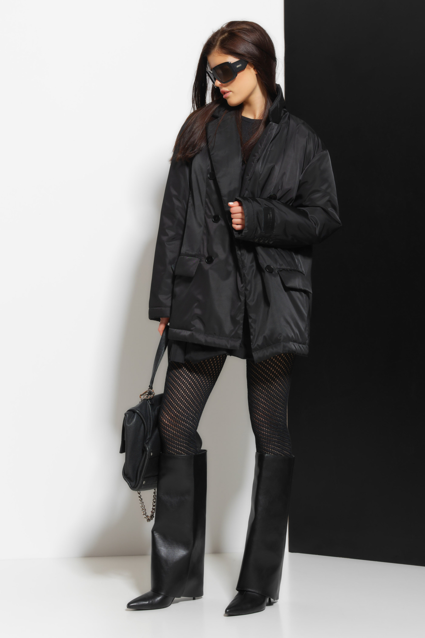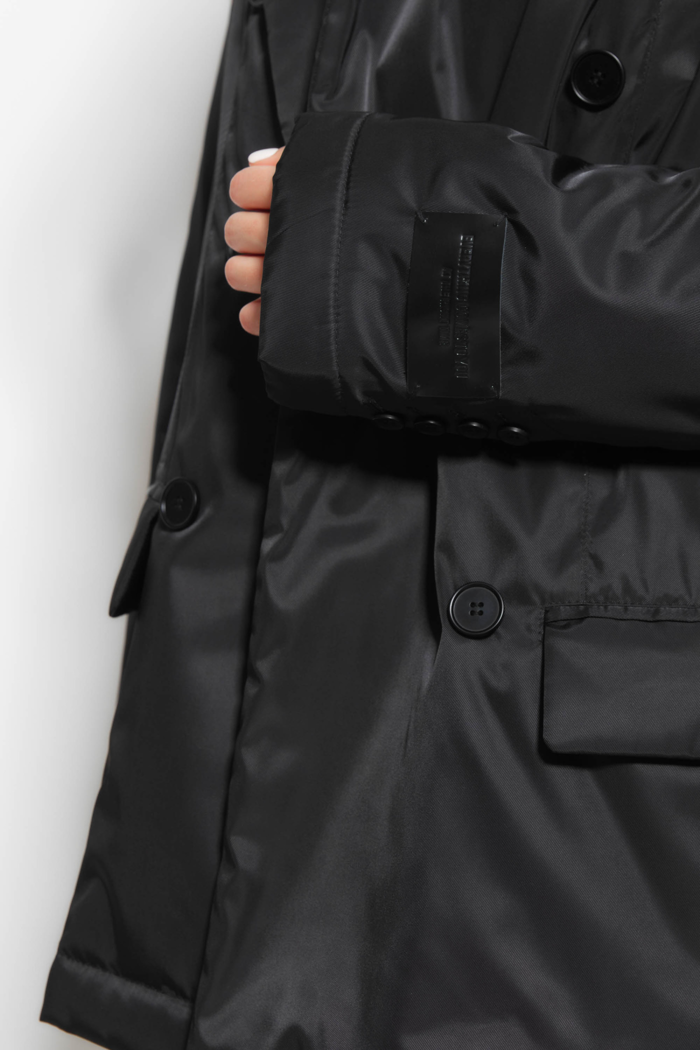 Куртка женская полуприлегающего силуэта из плащевой ткани длиной ниже линии бедер, со смещенным бортовым заходом, с воротником, с рукавами с застежкой на две петли и две пуговицы, параллельно петлям на правой части переда пришито две отделочных пуговицы. На правой и левой частях переда пришито по одной отделочной пуговице. Куртка, с подкладкой на утепляющей прокладке isosoft 150 г/м^2 со стёжкой.