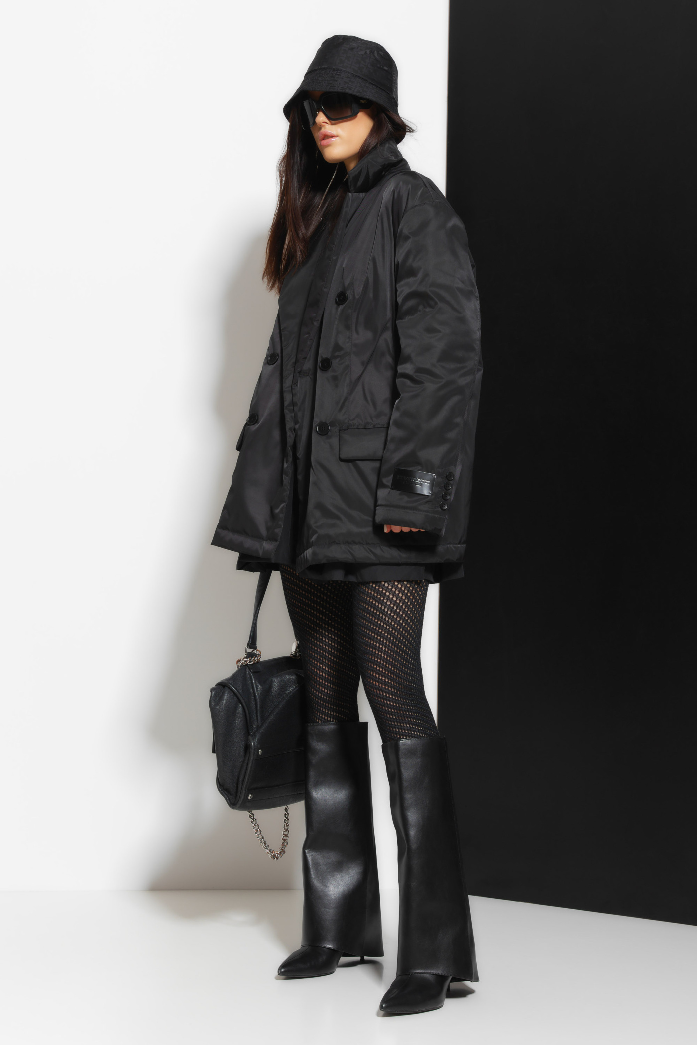 Передние части куртки с рельефными швами от проймы до низа, с талиевыми выточками, с прорезными карманами в рамку с клапанами.