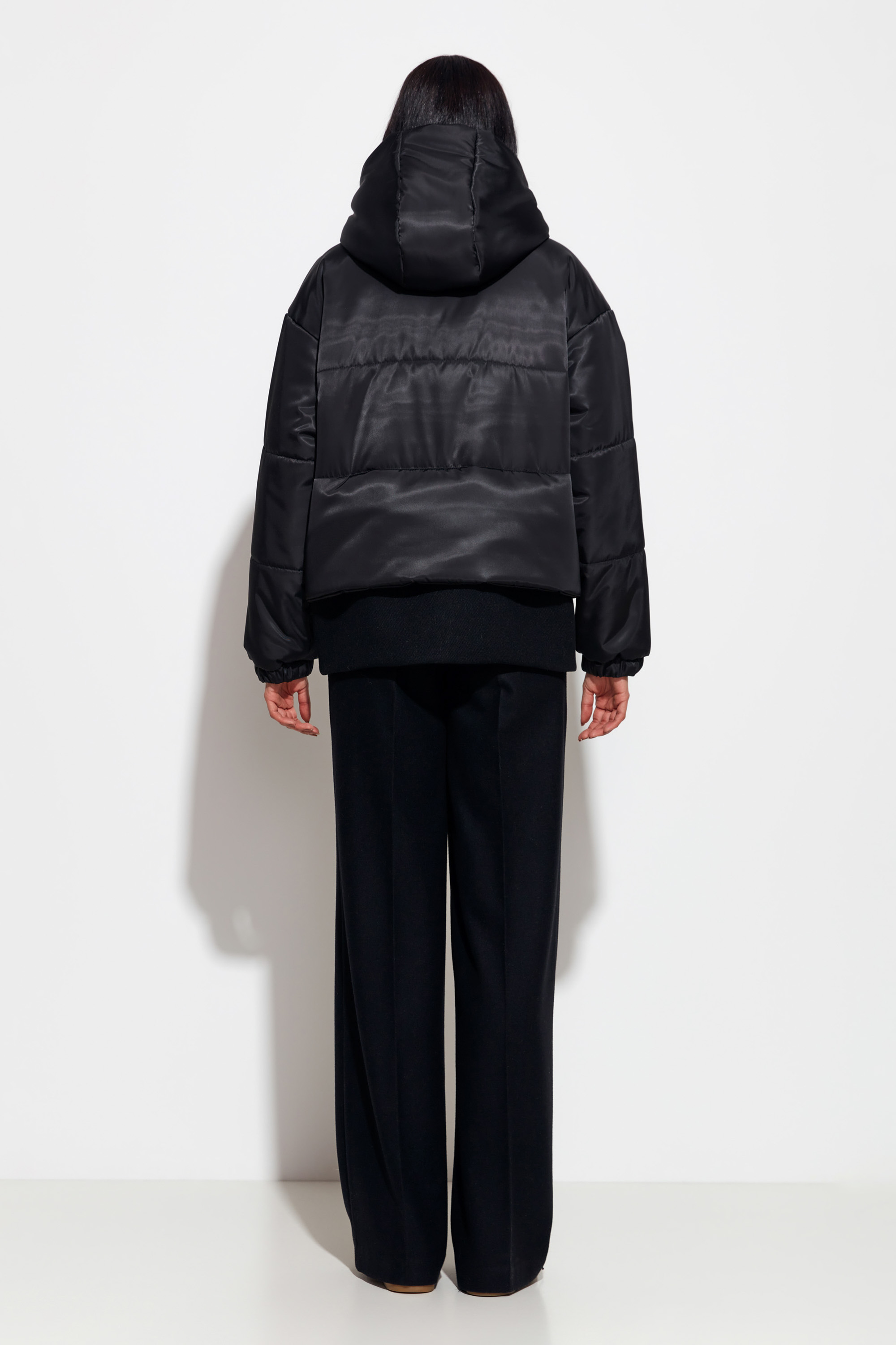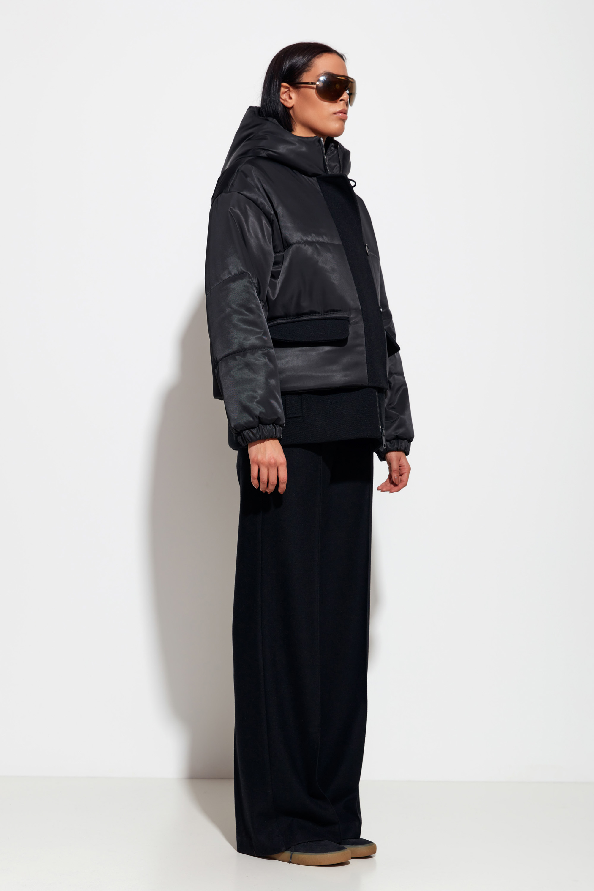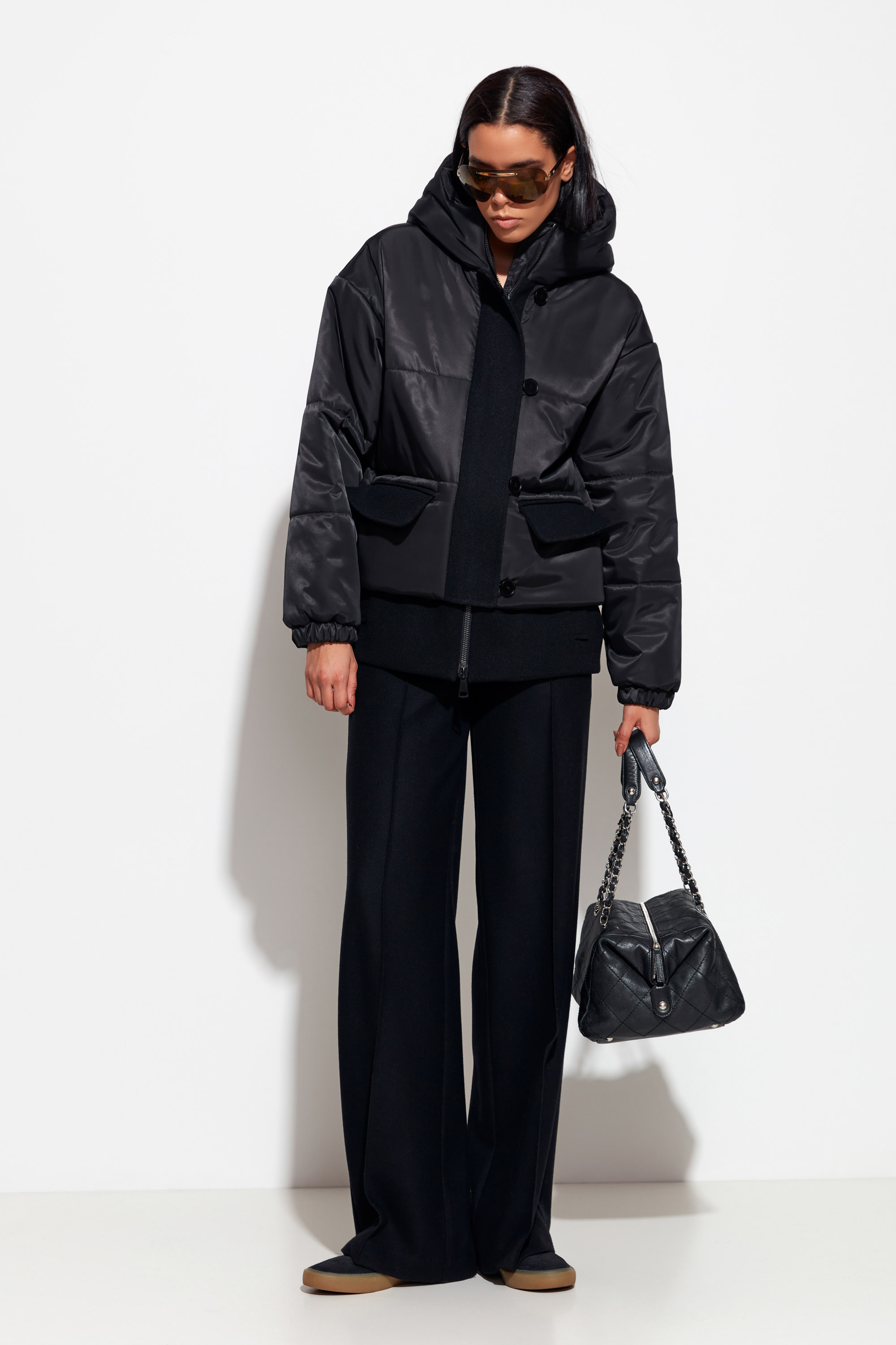 Черная куртка Lakbi из коллекции осень-зима 2025/26 — современная модель с капюшоном и оригинальными шерстяными вставками по низу изделия.