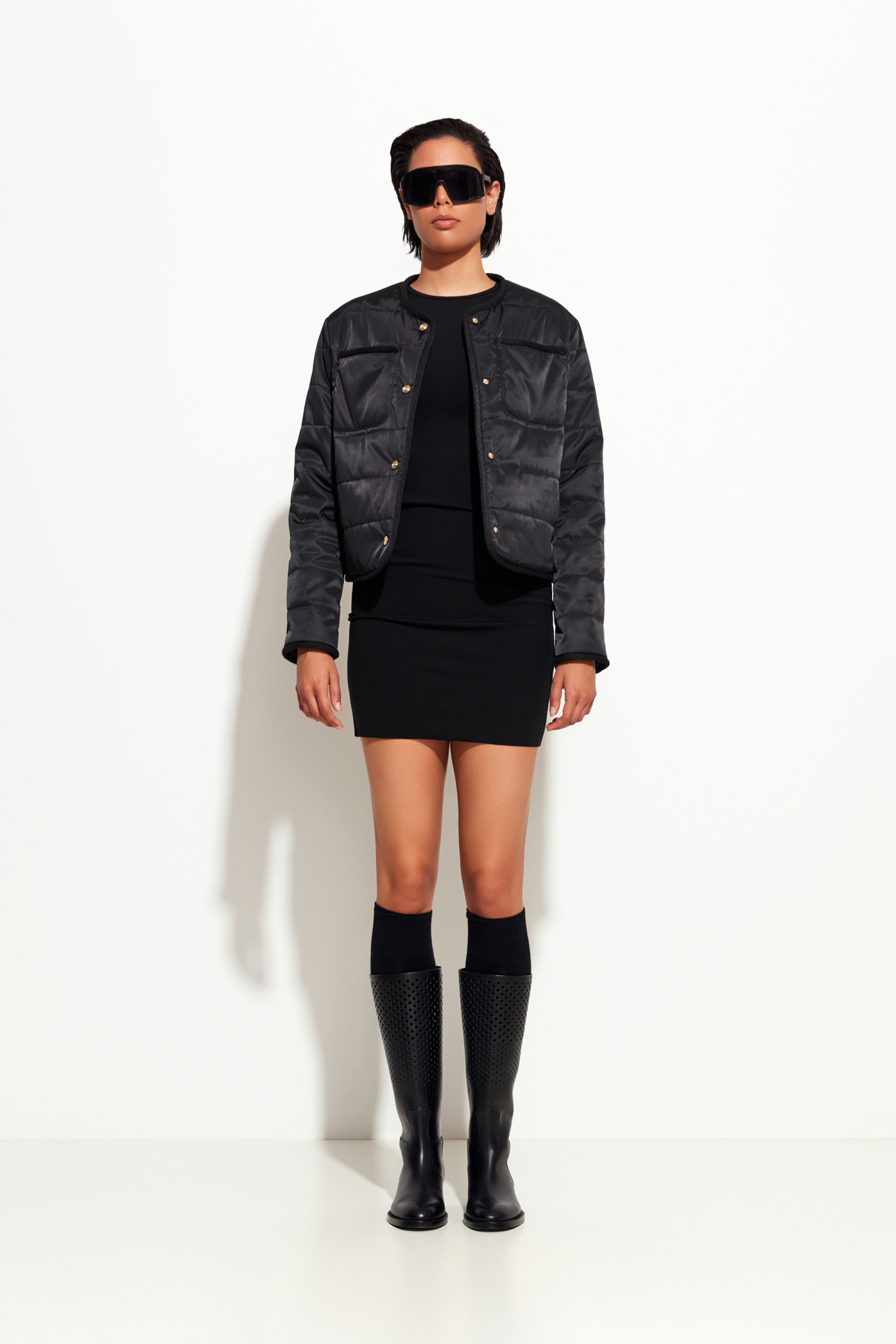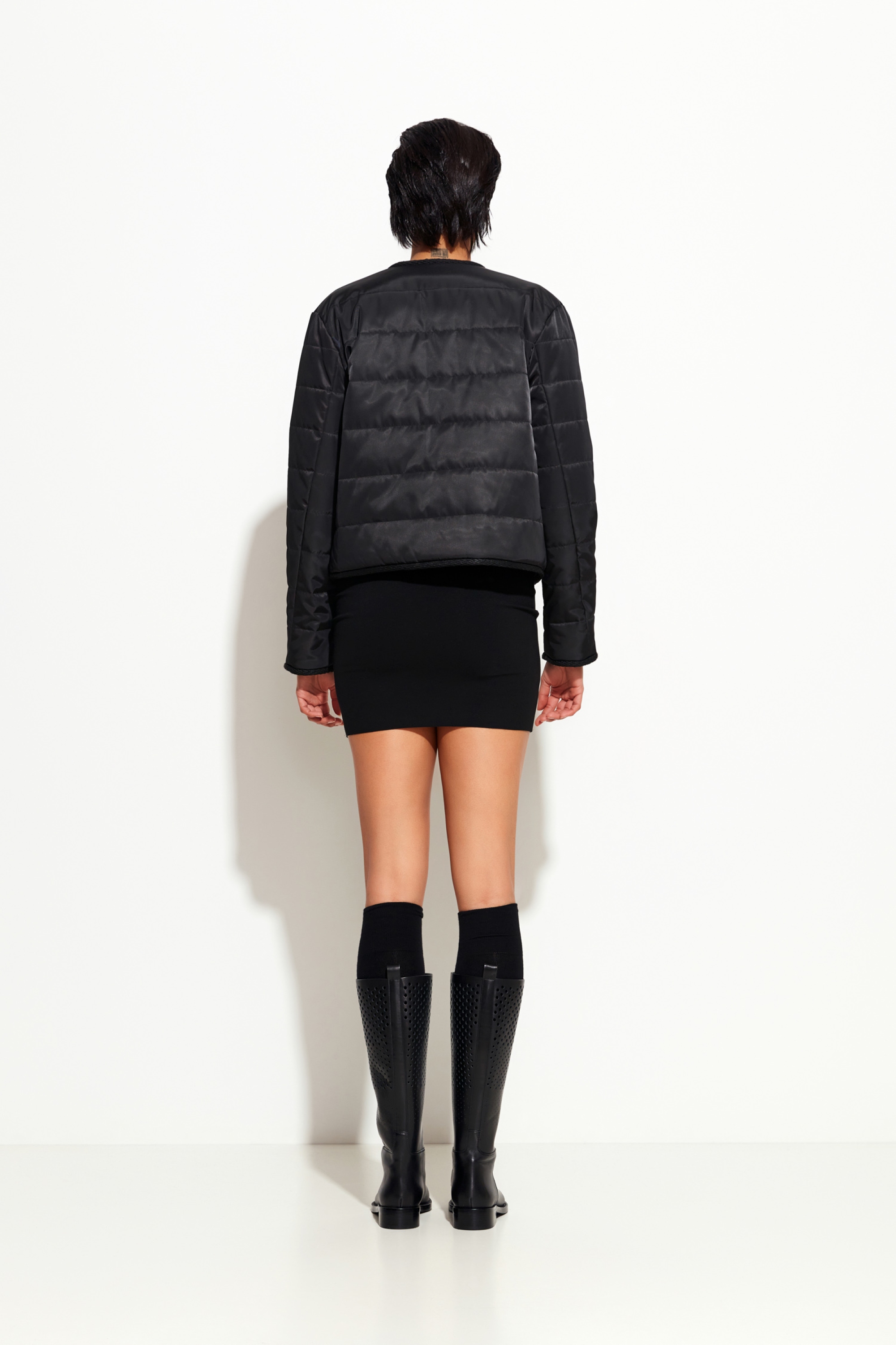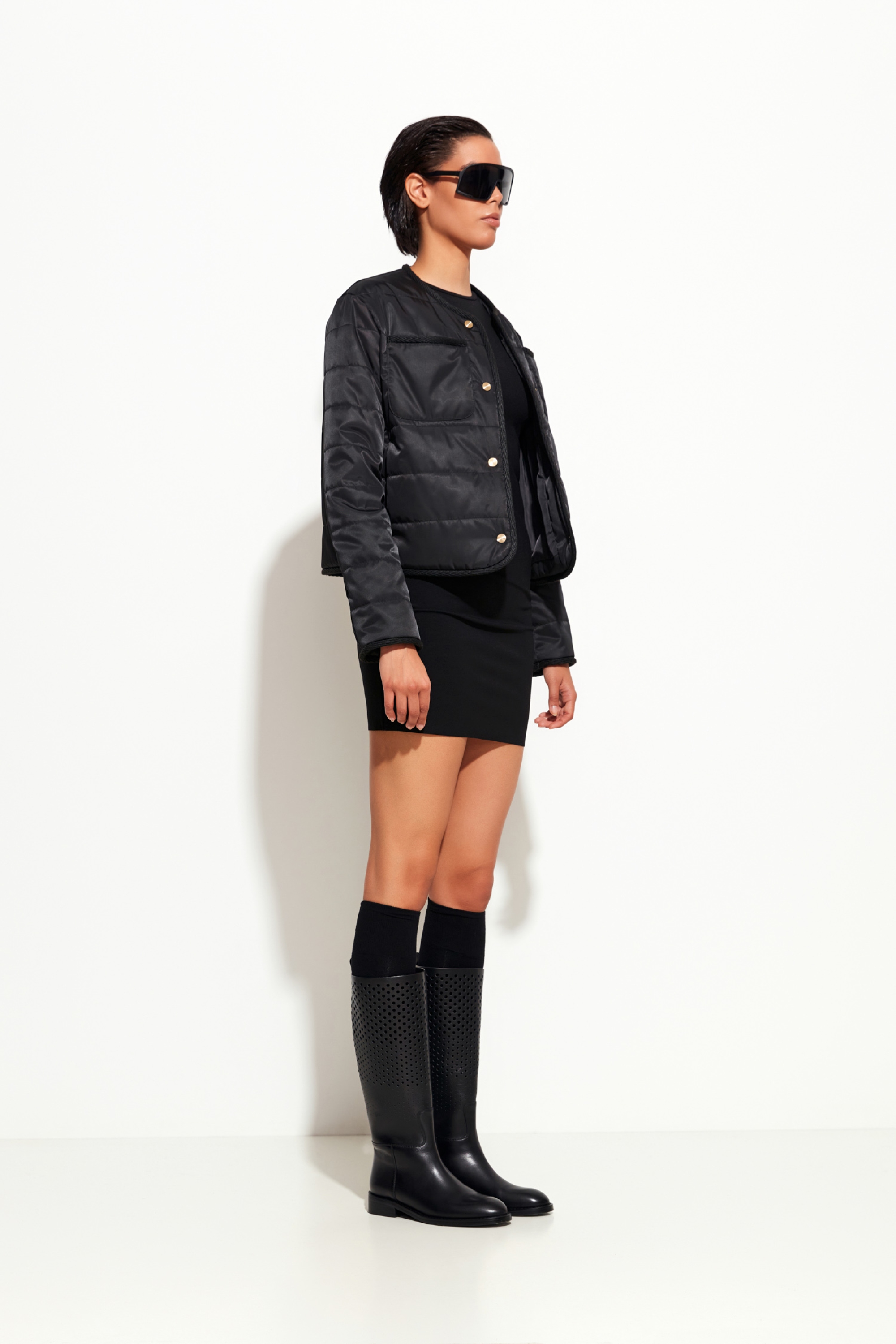 Наполнитель: Isosoft — лёгкий, тёплый и дышащий материал.Крой: укороченный — современный и практичный для многослойных образов.Вырез горловины: округлый — элегантный и универсальный.Цвет: чёрный — базовый оттенок, сочетается с любым стилем.Сезонность: подходит для осенних температур.