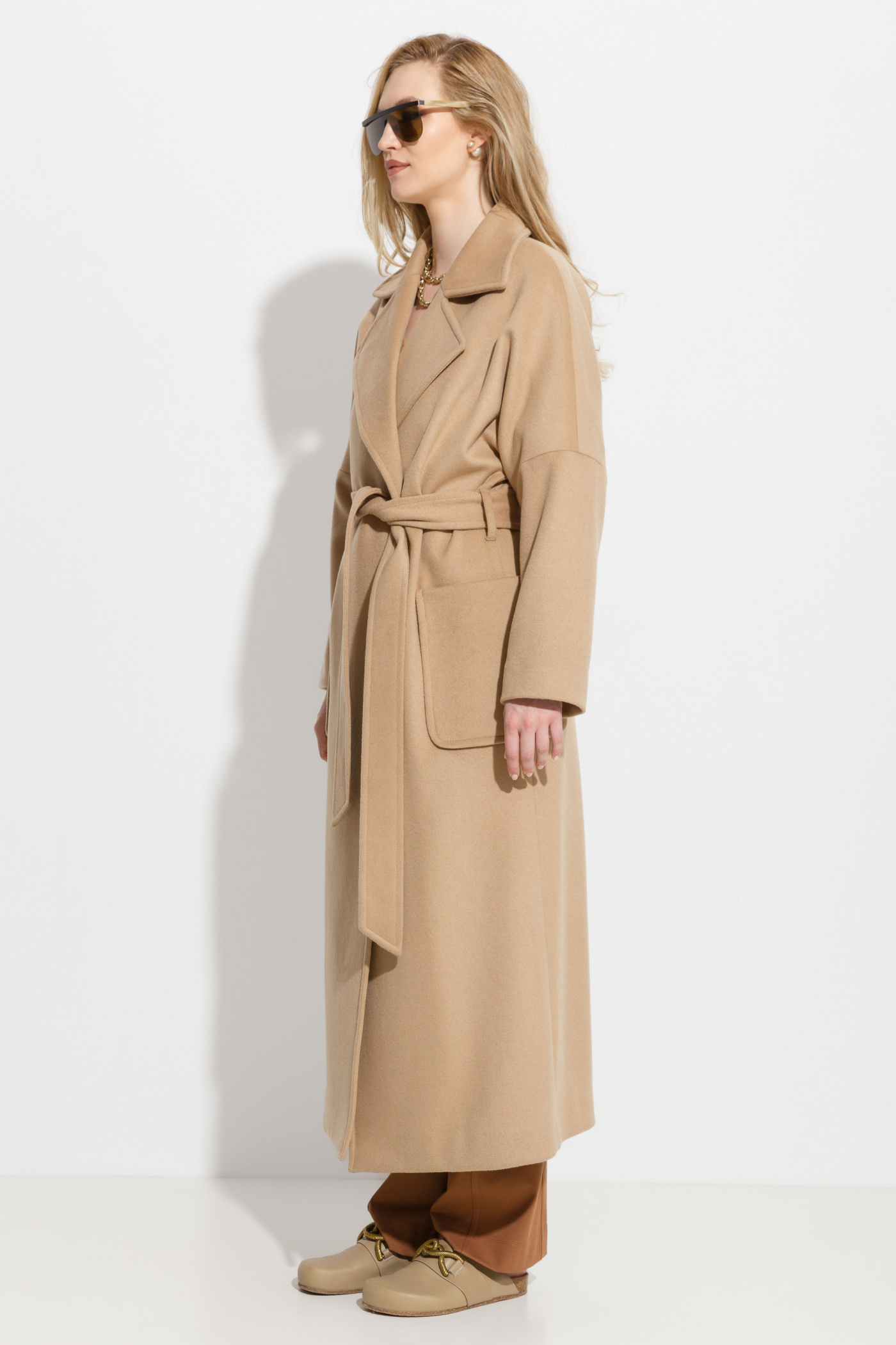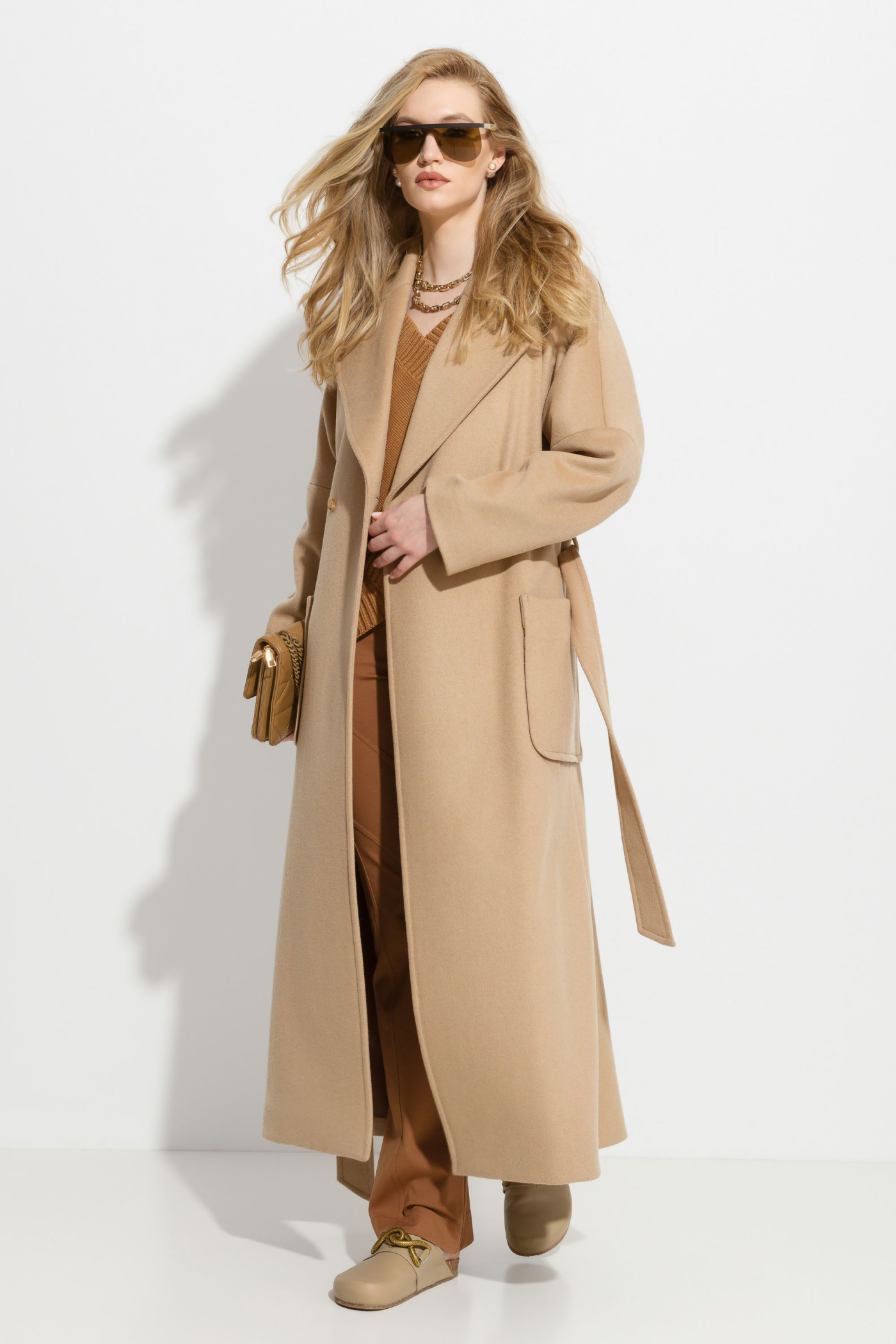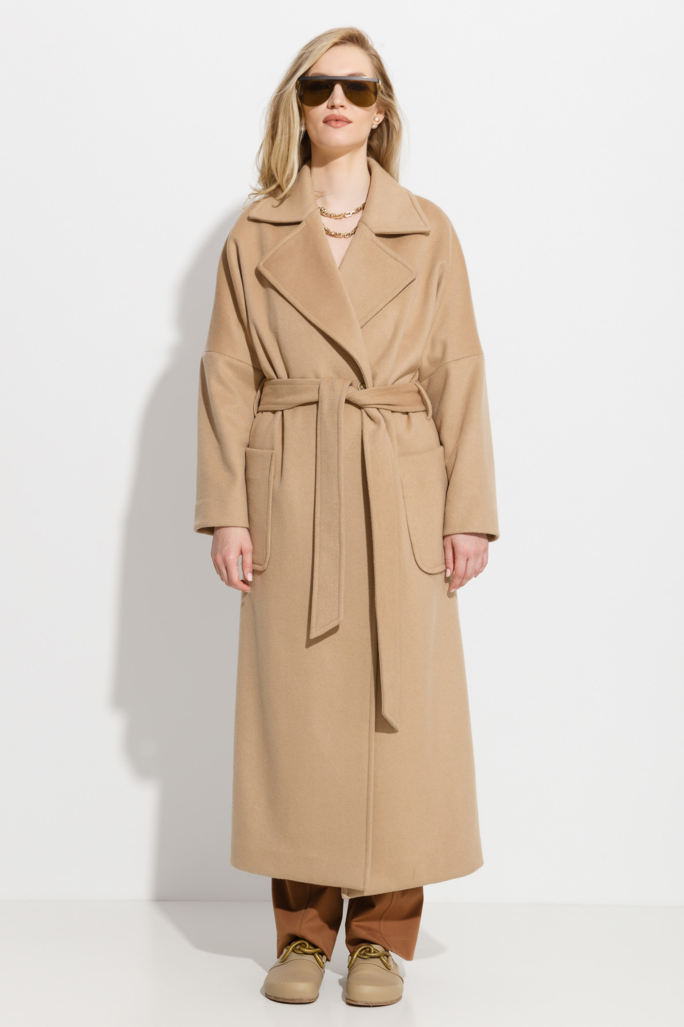 Пальто-халат свободного кроя, длиной ниже линии колен. Широкий отложной воротник. По бокам два накладных кармана. На талии пояс из аналогичной ткани. Универсальная базовая модель и цвета позволяют создавать образы в различных стилях.