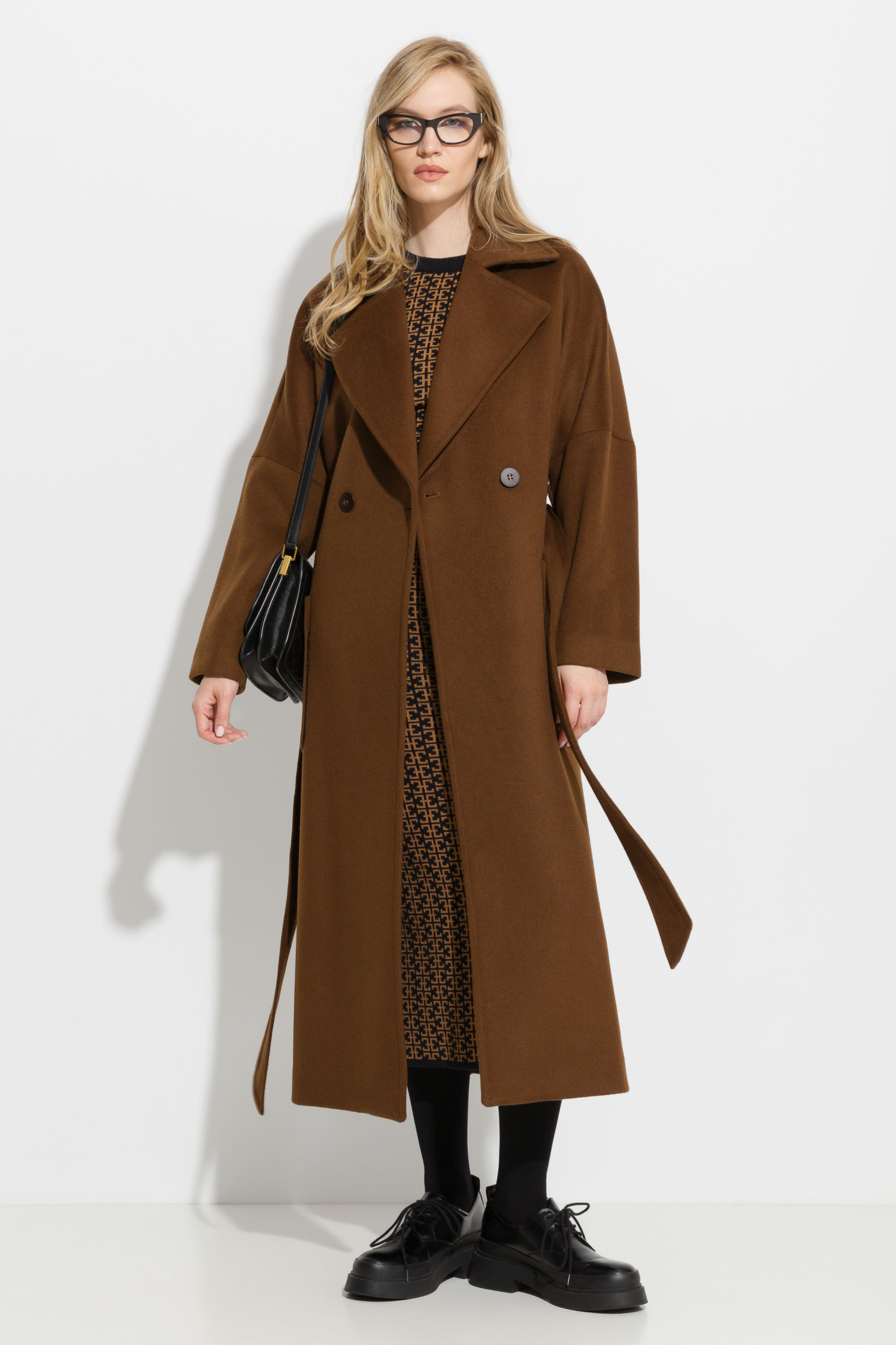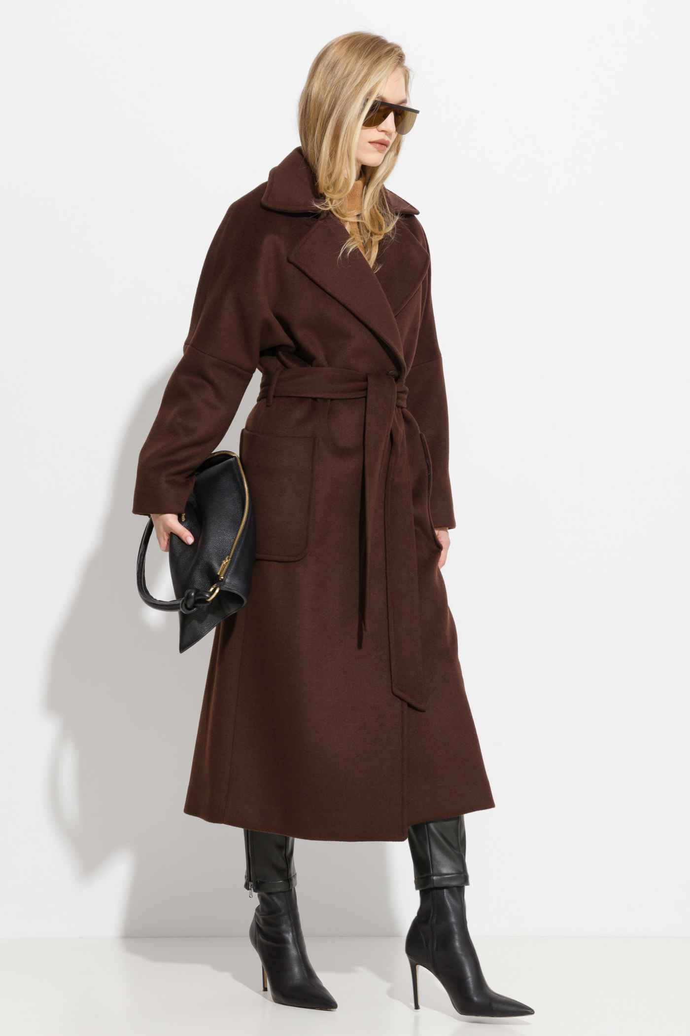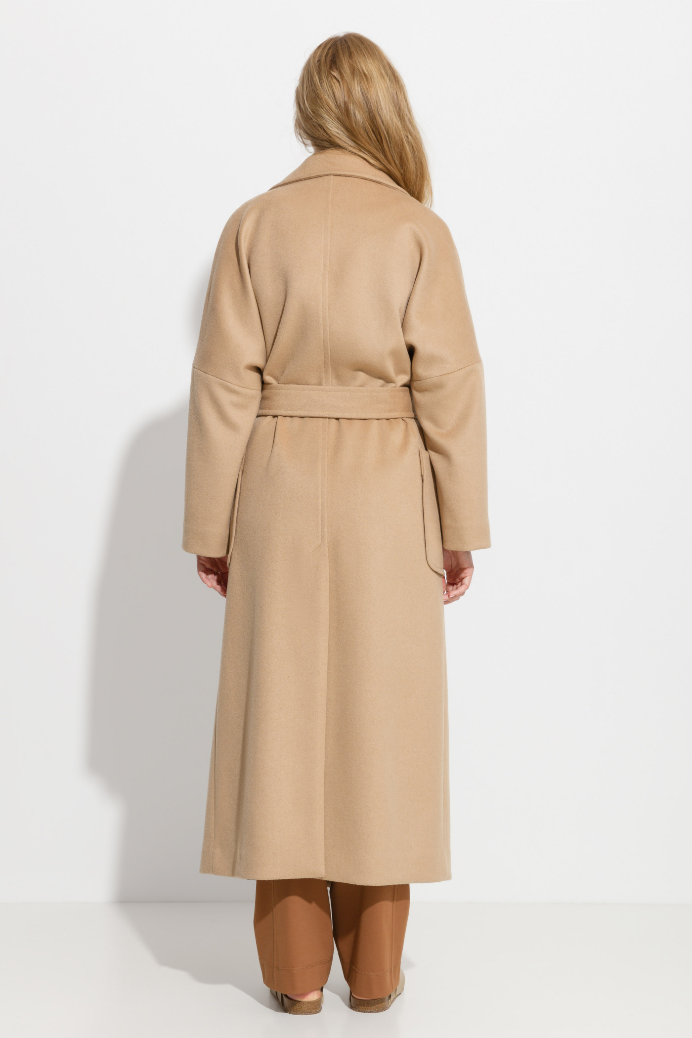 Пальто-халат свободного кроя, длиной ниже линии колен. Широкий отложной воротник. По бокам два накладных кармана. На талии пояс из аналогичной ткани. Универсальная базовая модель и цвета позволяют создавать образы в различных стилях.