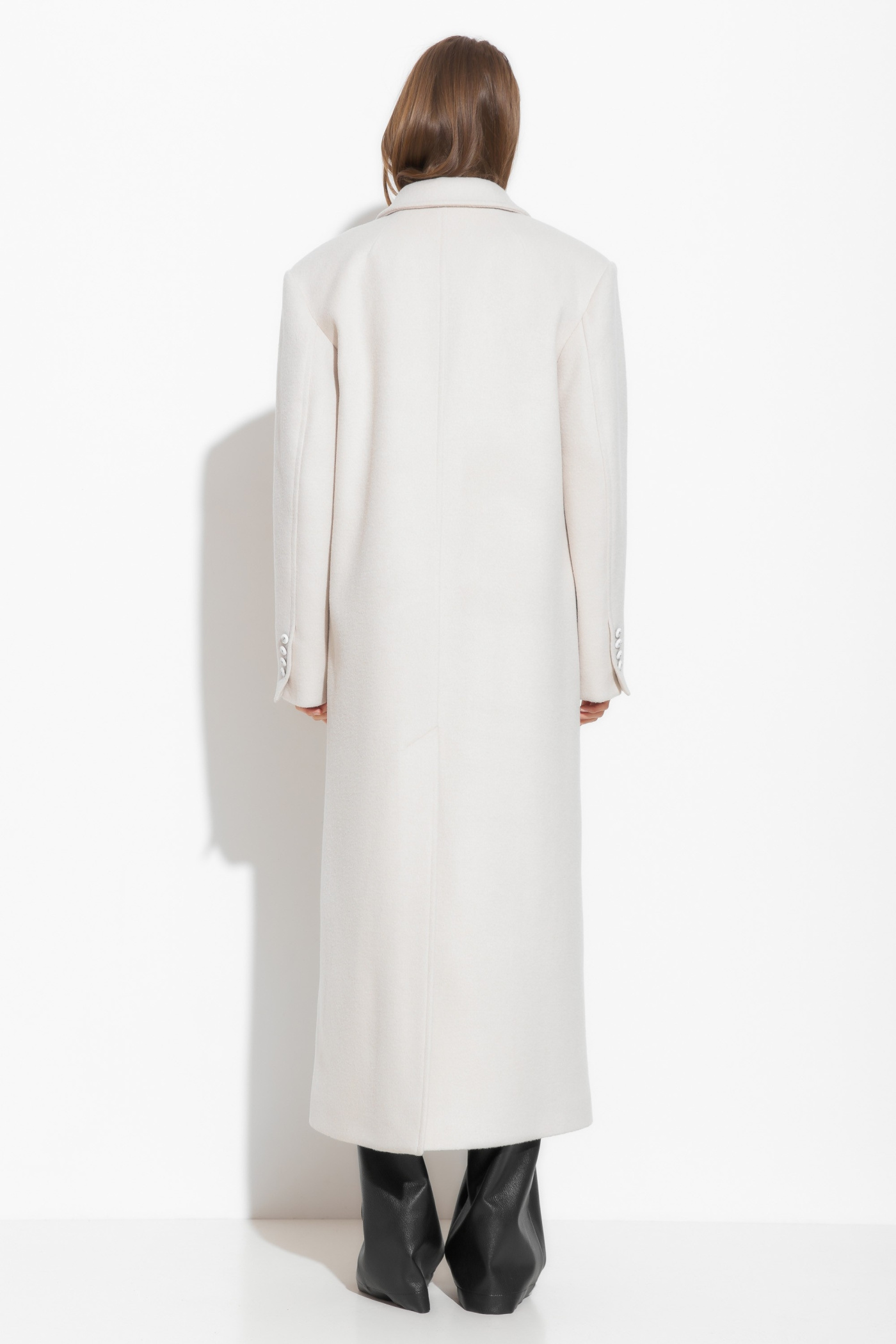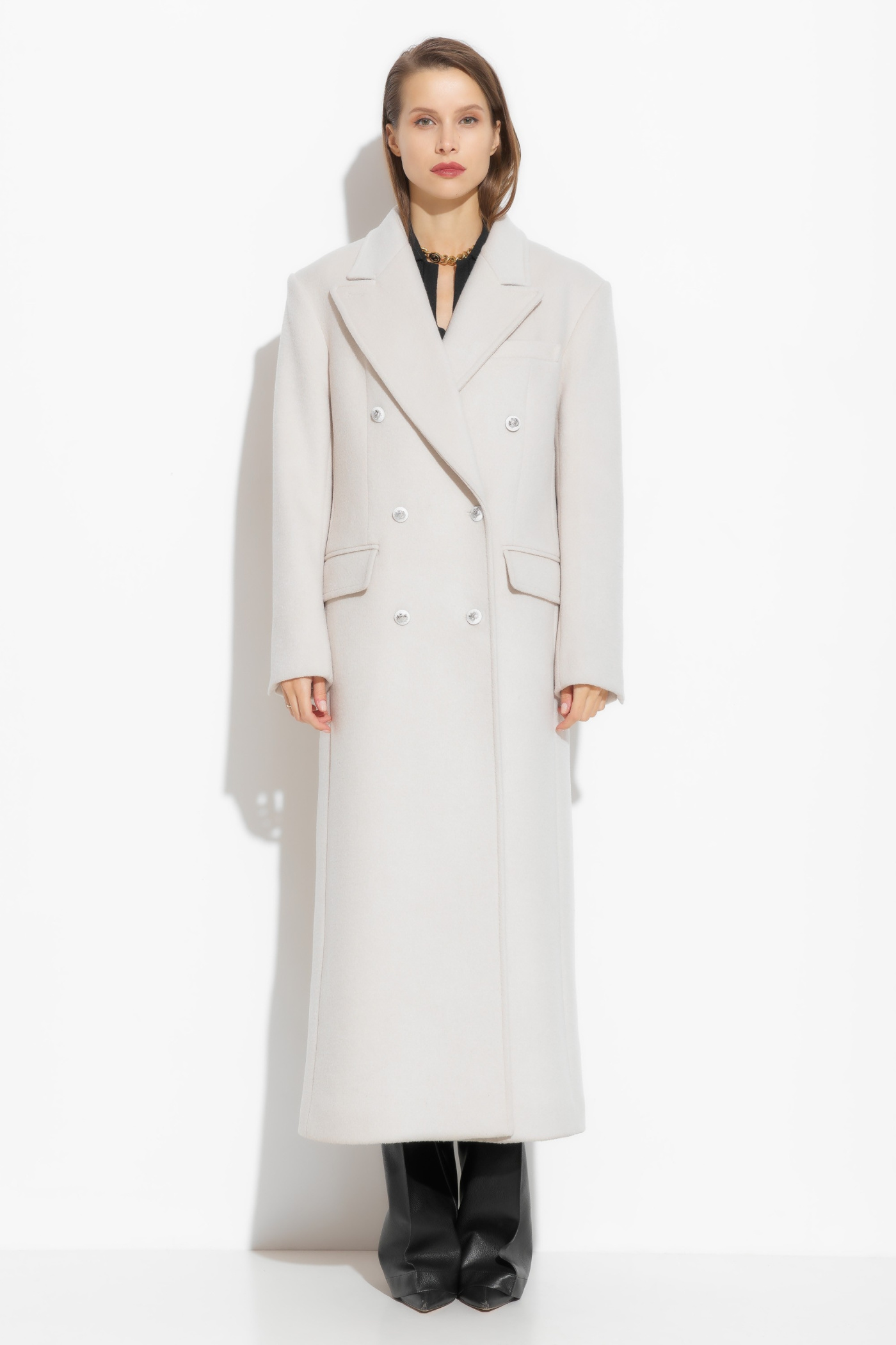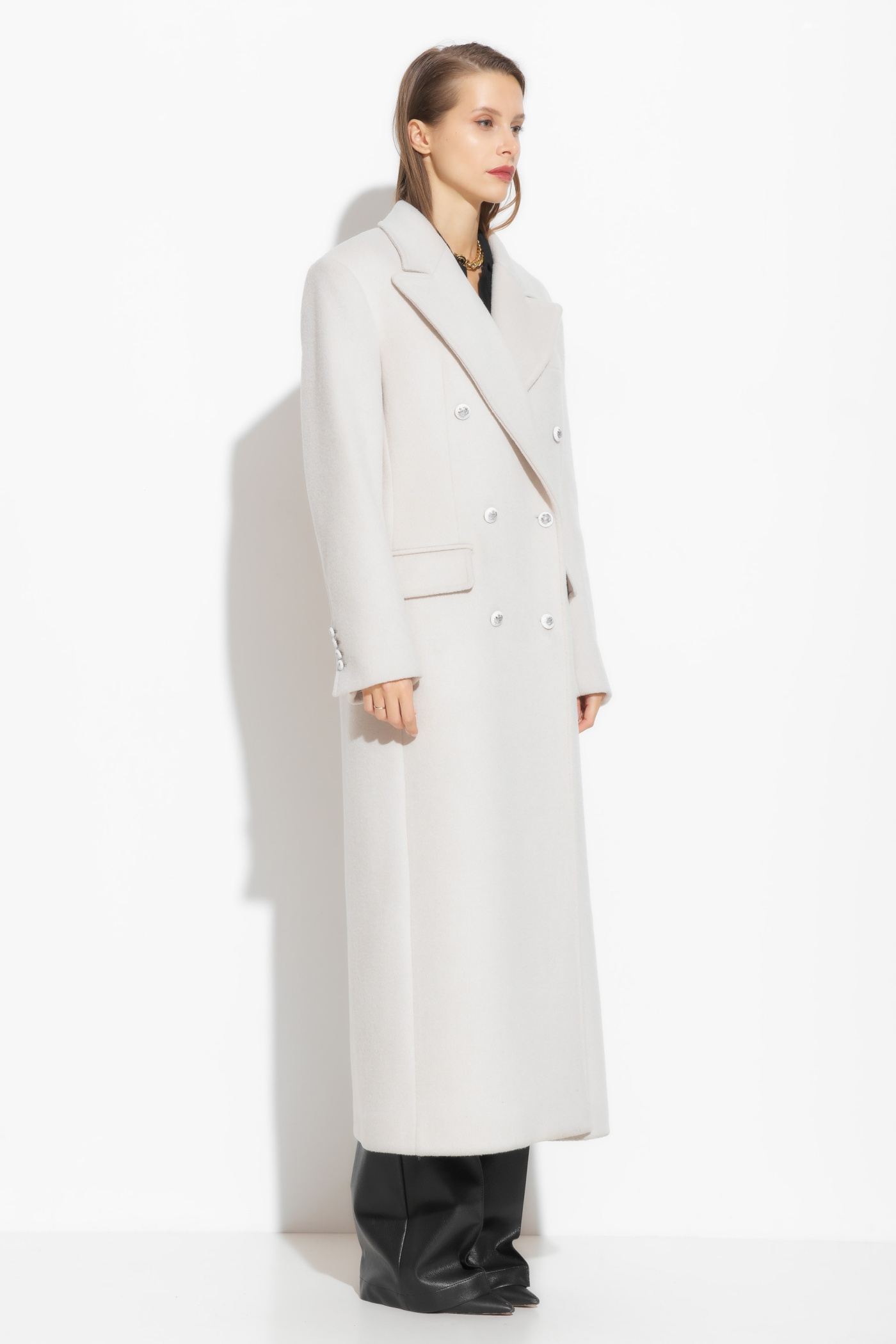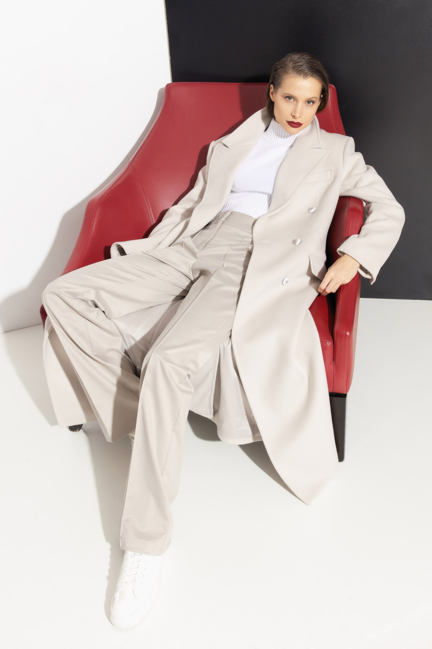 Пальто шерстяное прямого кроя, длины миди. Воротник стояче-отложной. Застегивается на пуговицы нейтрального оттенка. Спереди прорезные карманы с клапанами. Классическая модель и расцветка позволяют сочетать пальто с различными образами и стилями. Идеально подходит для холодных осенних и зимних дней.
