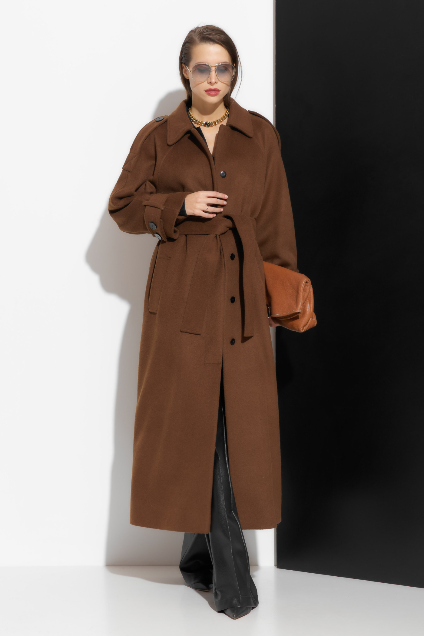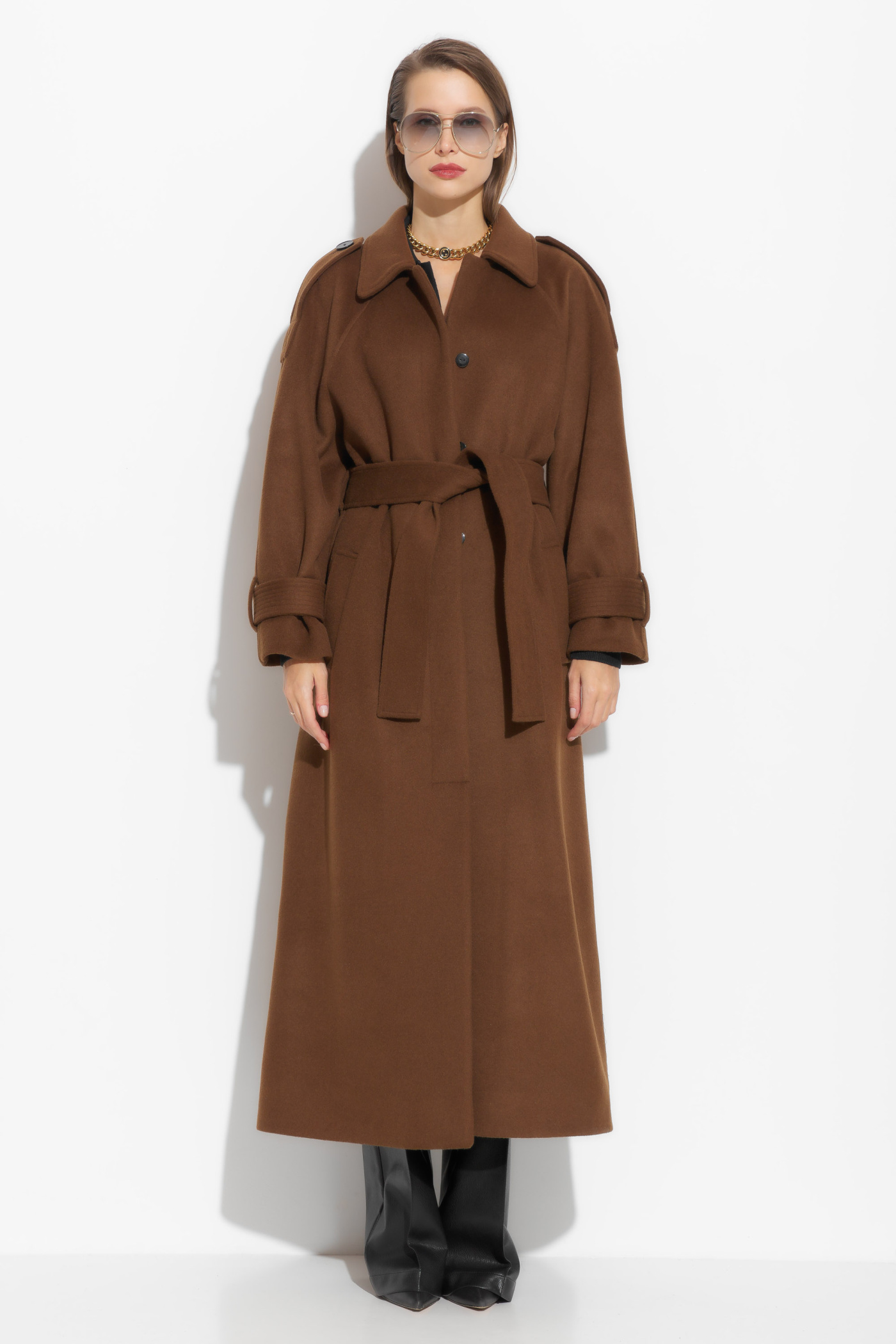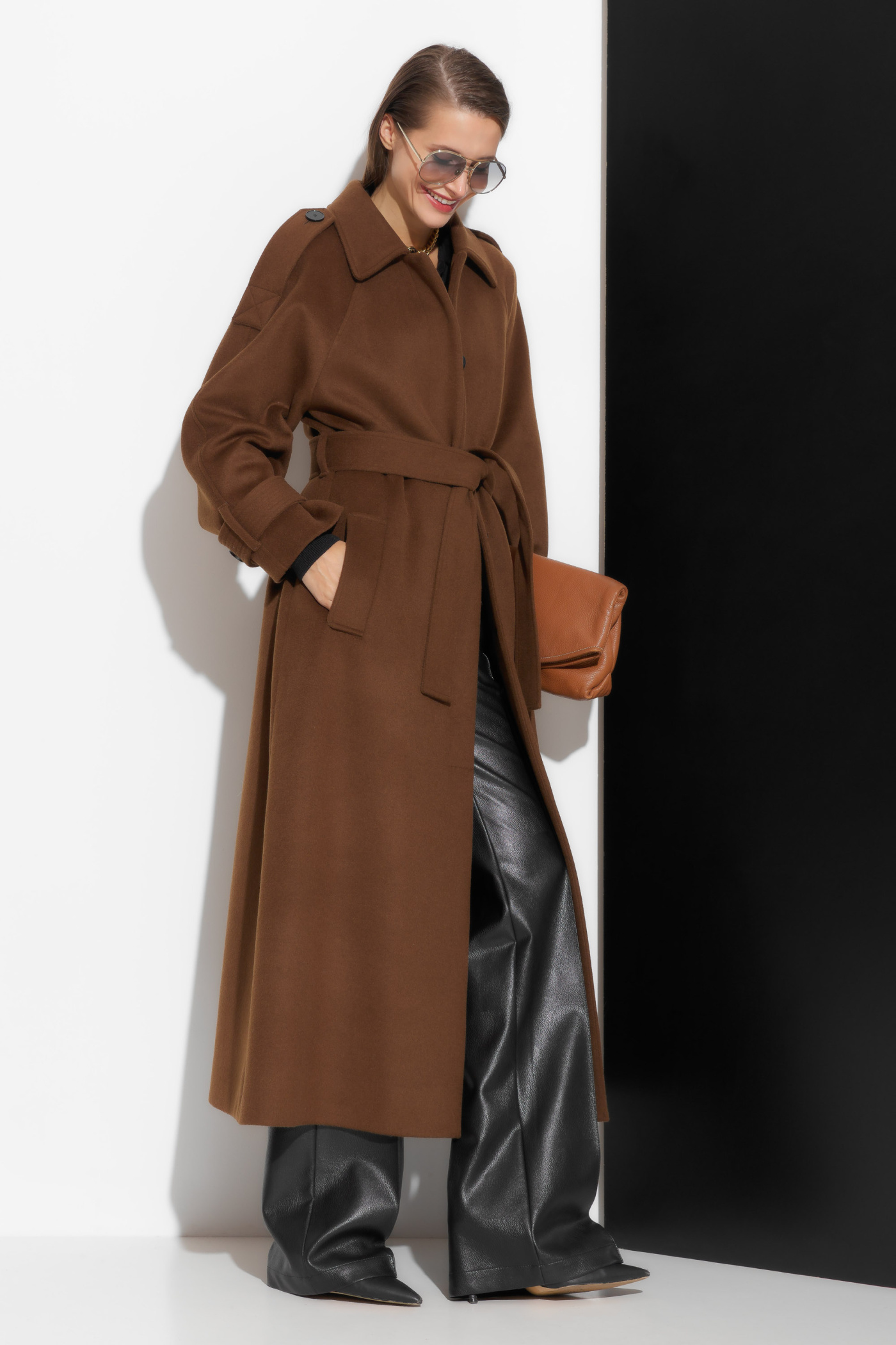 Пальто шерстяное в длине миди. Свободный, расслабленный крой обеспечивает комфортную посадку изделия. Воротник отложной. Объем талии регулируется при помощи пояса из аналогичной ткани. Классический и универсальный крой позволяют создавать с пальто образы в разных стилях.
