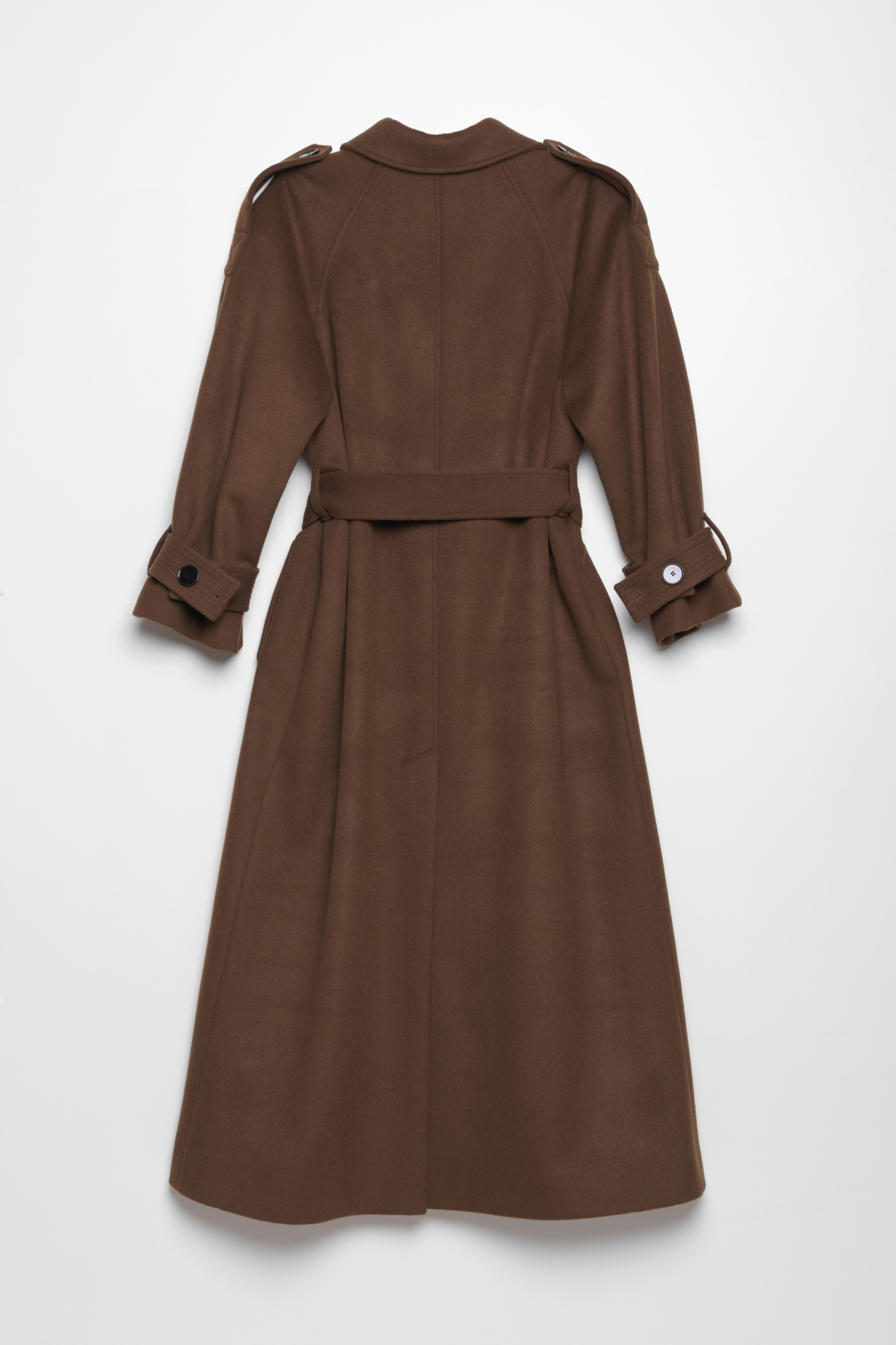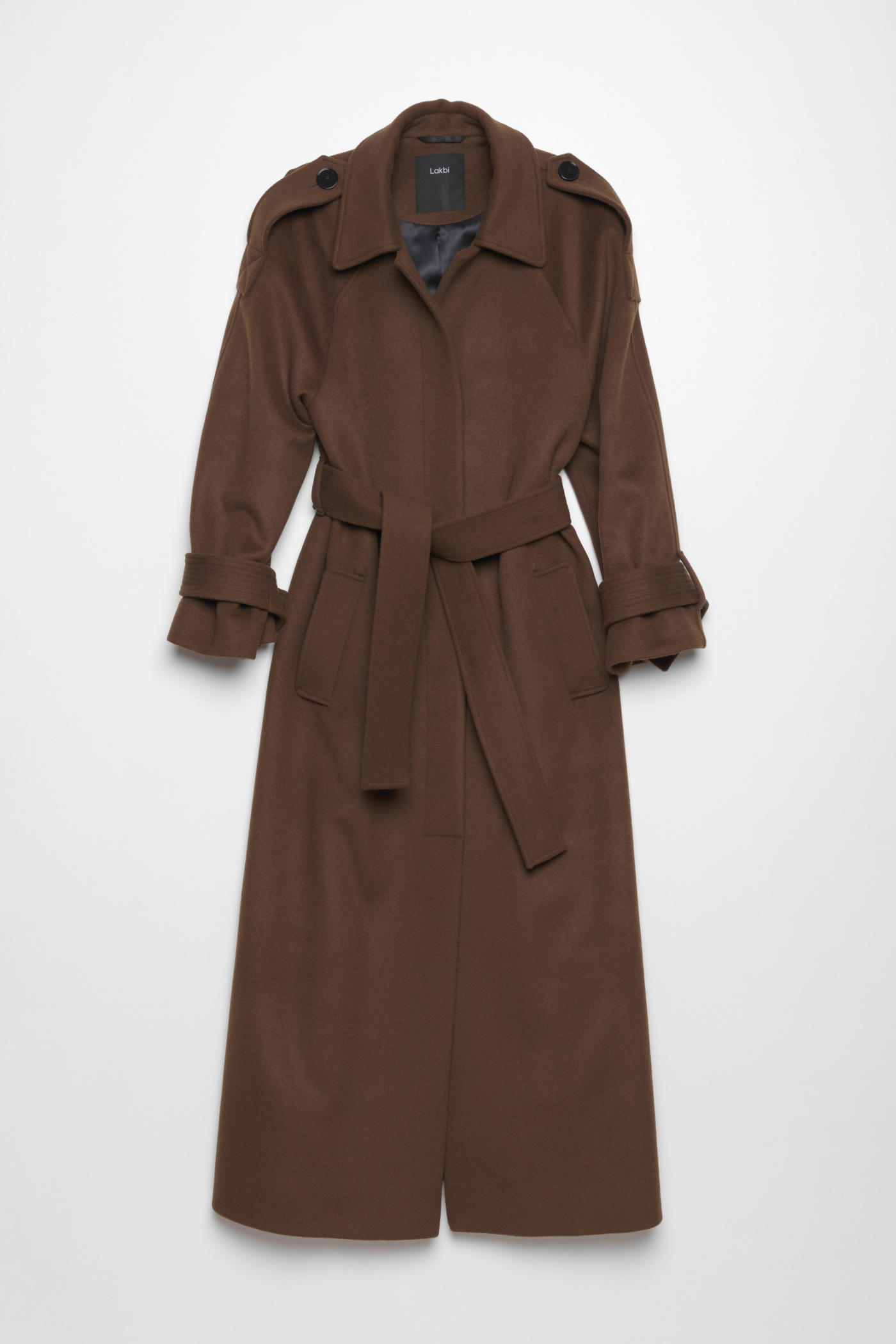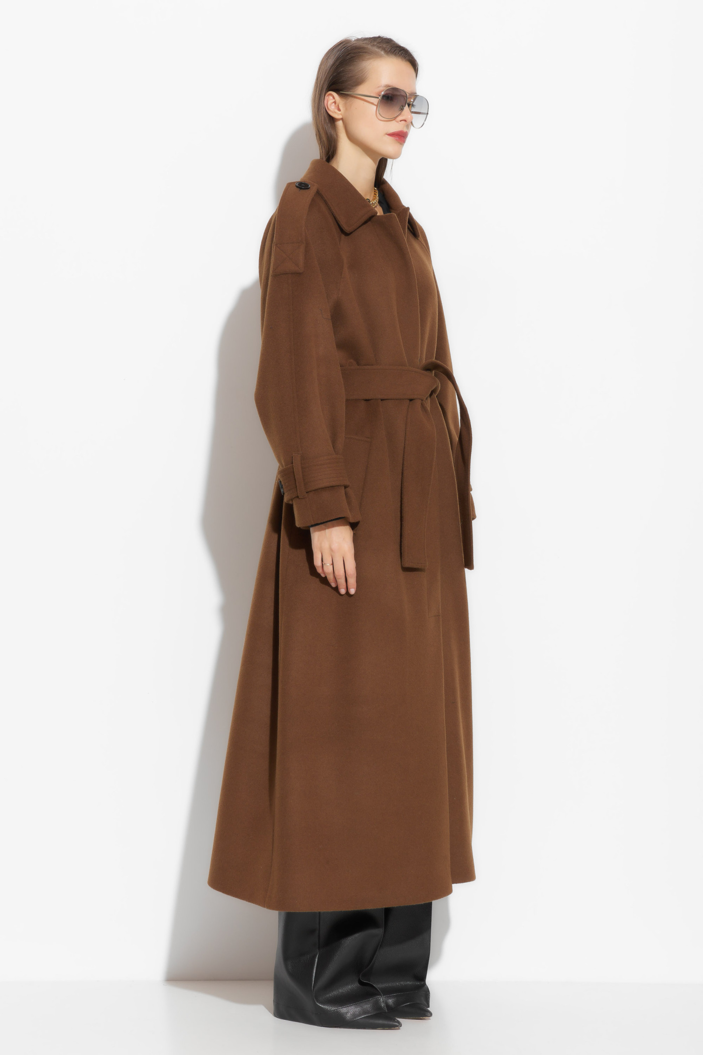 Пальто шерстяное в длине миди. Свободный, расслабленный крой обеспечивает комфортную посадку изделия. Воротник отложной. Объем талии регулируется при помощи пояса из аналогичной ткани. Классический и универсальный крой позволяют создавать с пальто образы в разных стилях.