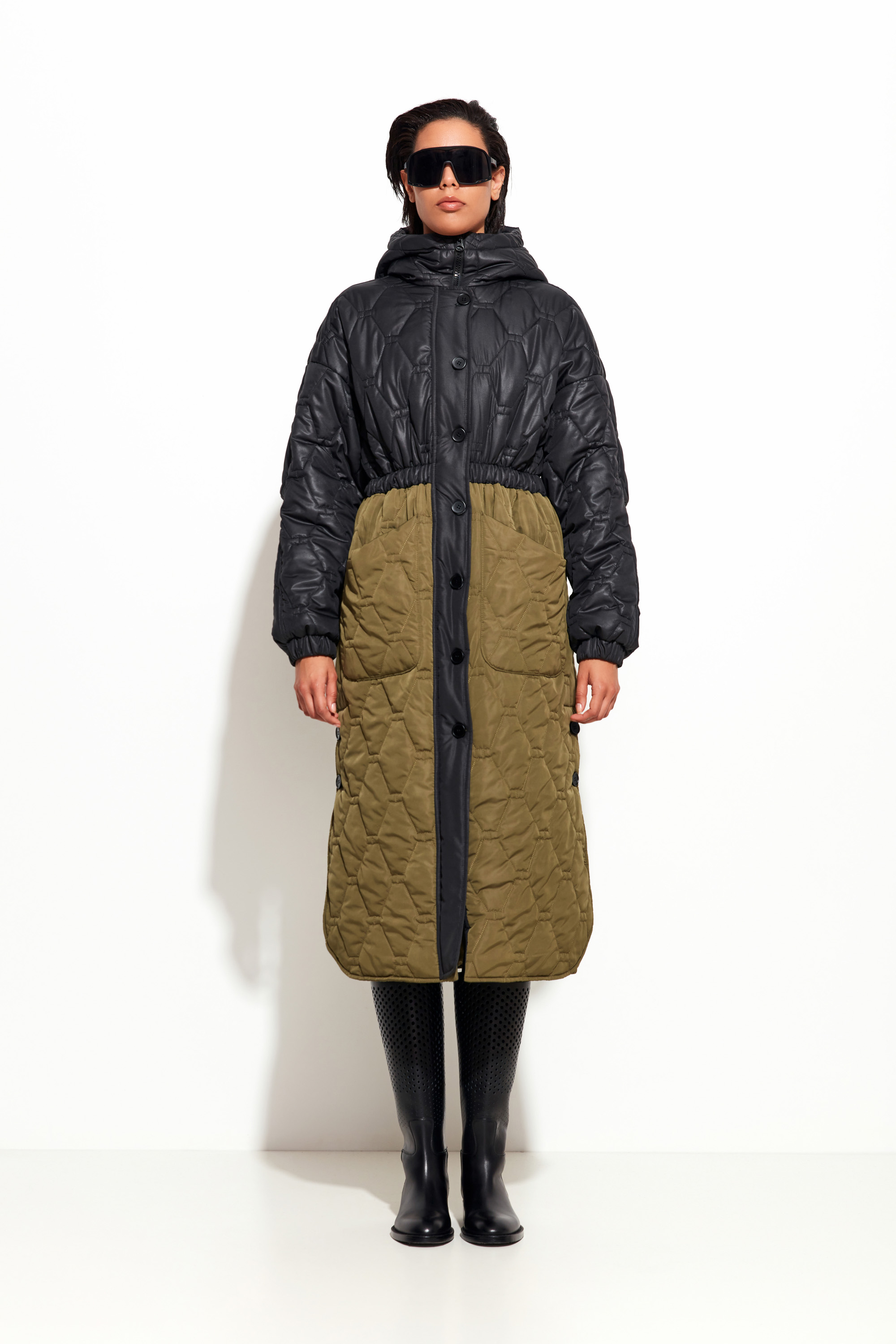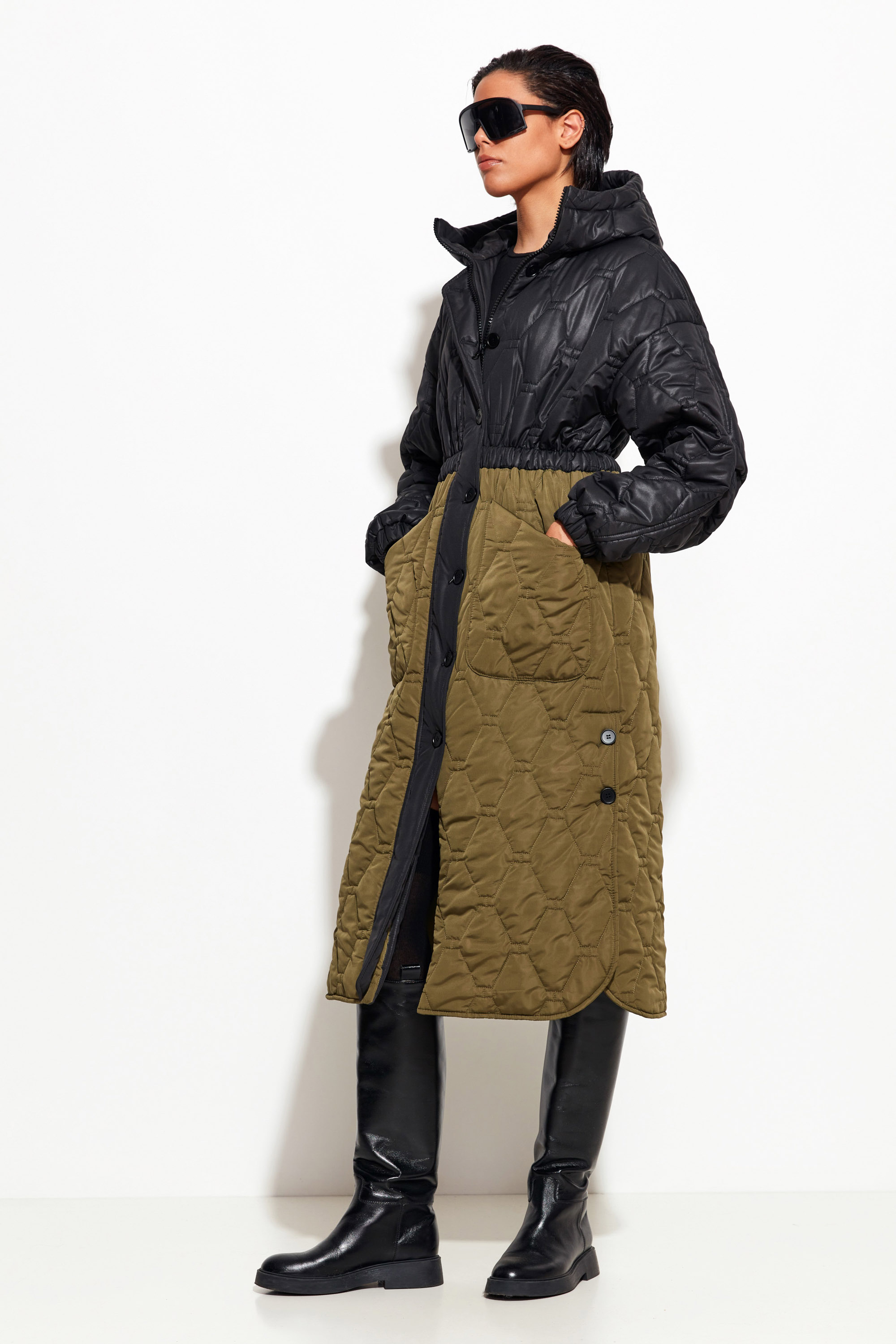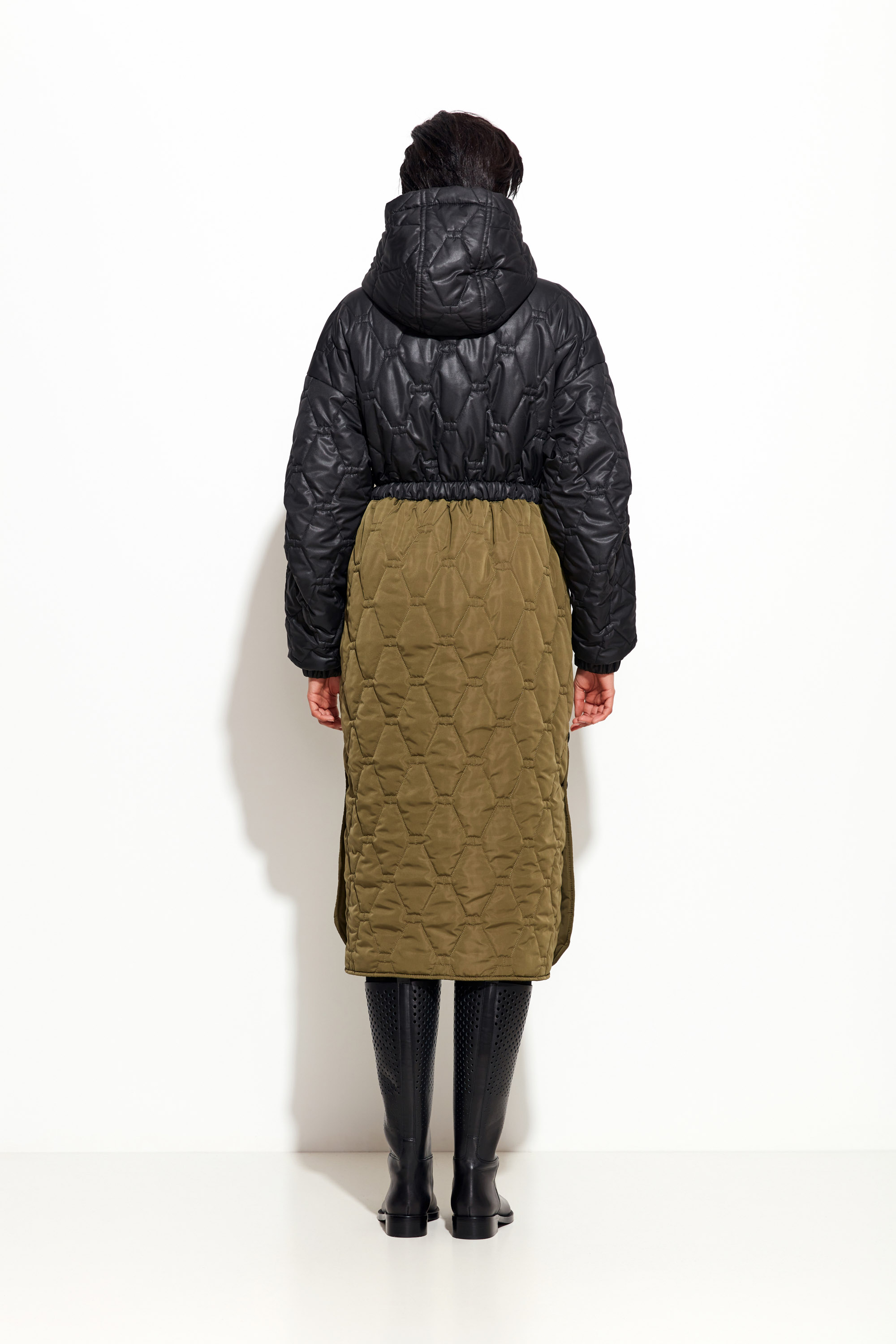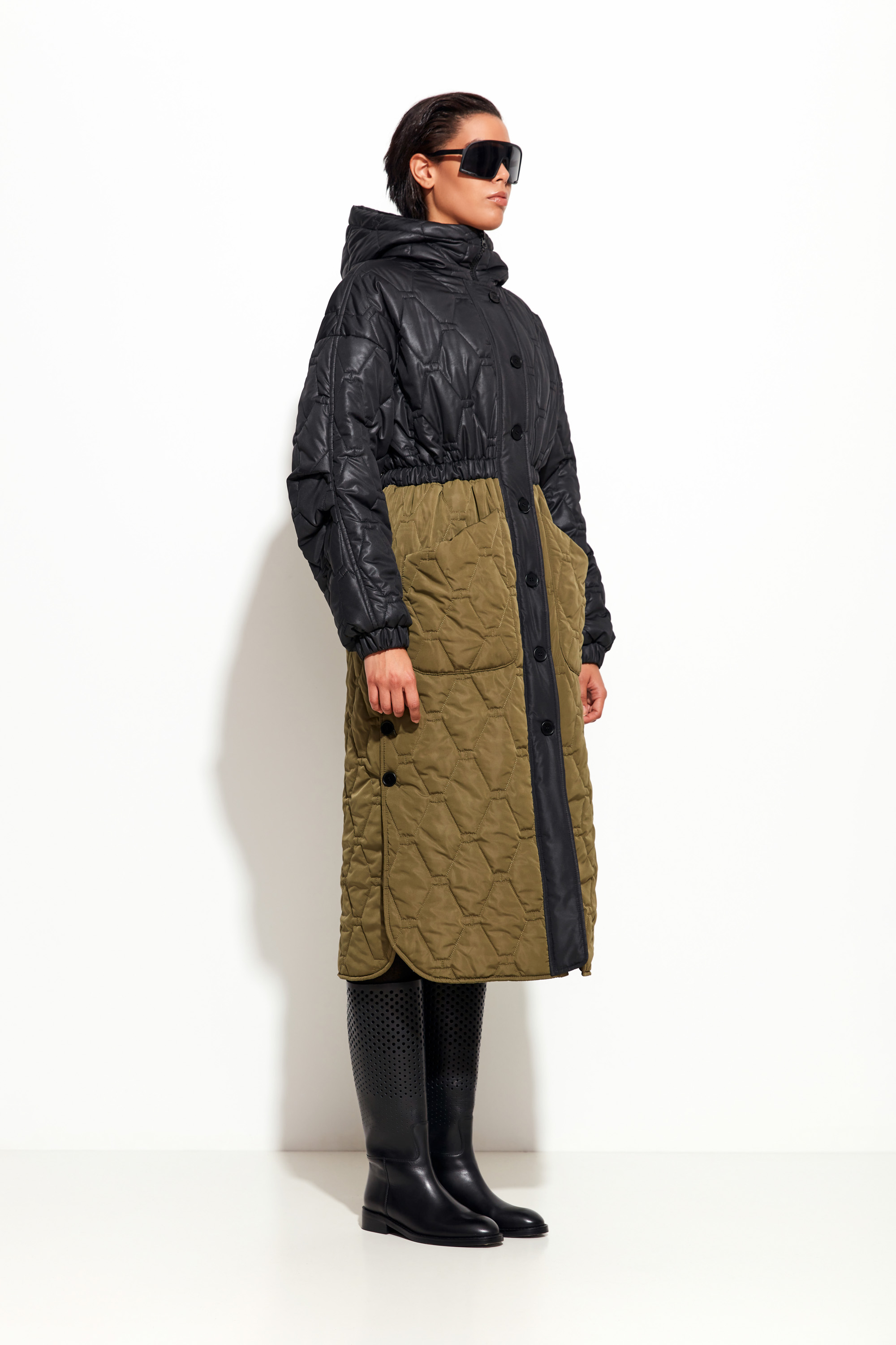 Зимнее пальто Lakbi 55147 из коллекции осень-зима 2025/26 — эффектная модель с капюшоном и оригинальной комбинированной расцветкой: верх выполнен в классическом черном цвете, низ — в модном оливковом оттенке. Такая цветовая гамма придаёт пальто современный и выразительный вид, подчёркивая индивидуальность и стиль. Надёжное утепление и практичный крой обеспечивают комфорт и защиту от холода в зимние дни.