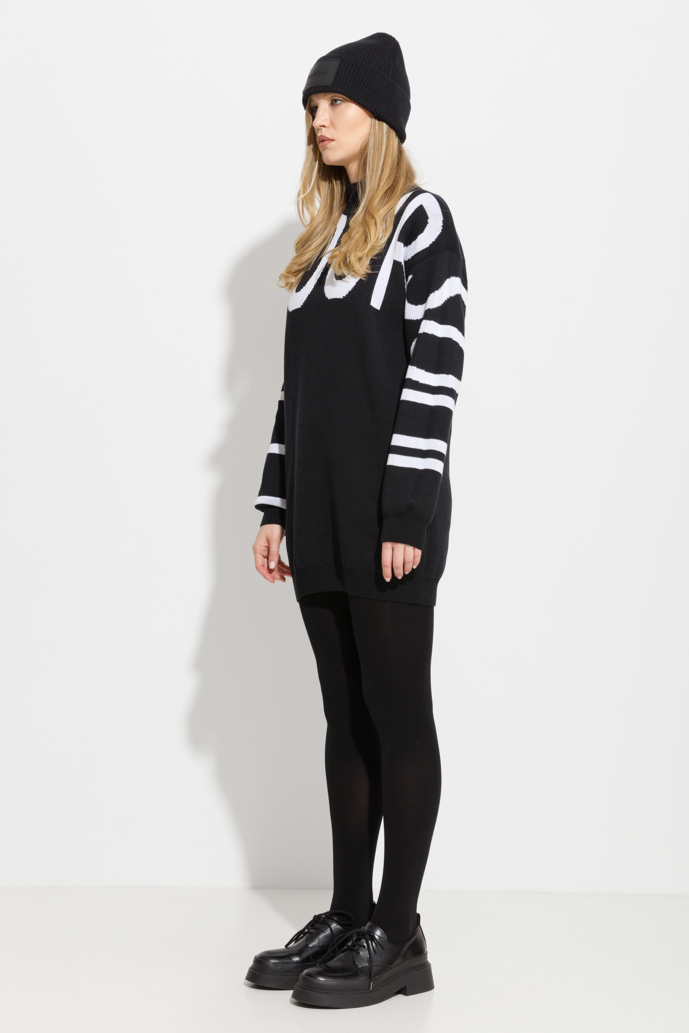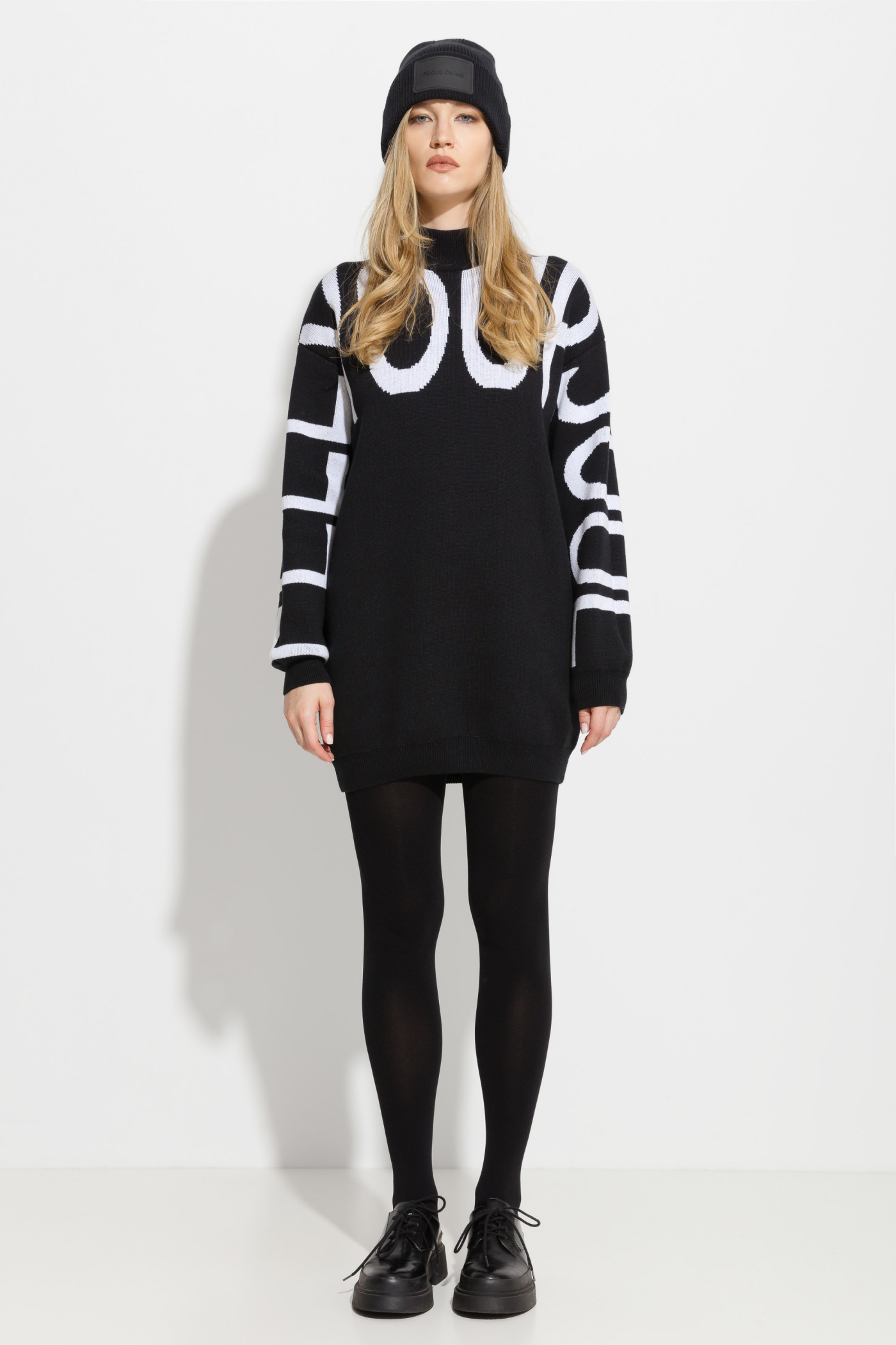 Платье вязаное свободного кроя, длиной до середины линии бедер. Высокая горловина. Перед изделия и рукава декорированы вышивкой. Низ изделия и рукава на эластичных вязаных манжетах.
