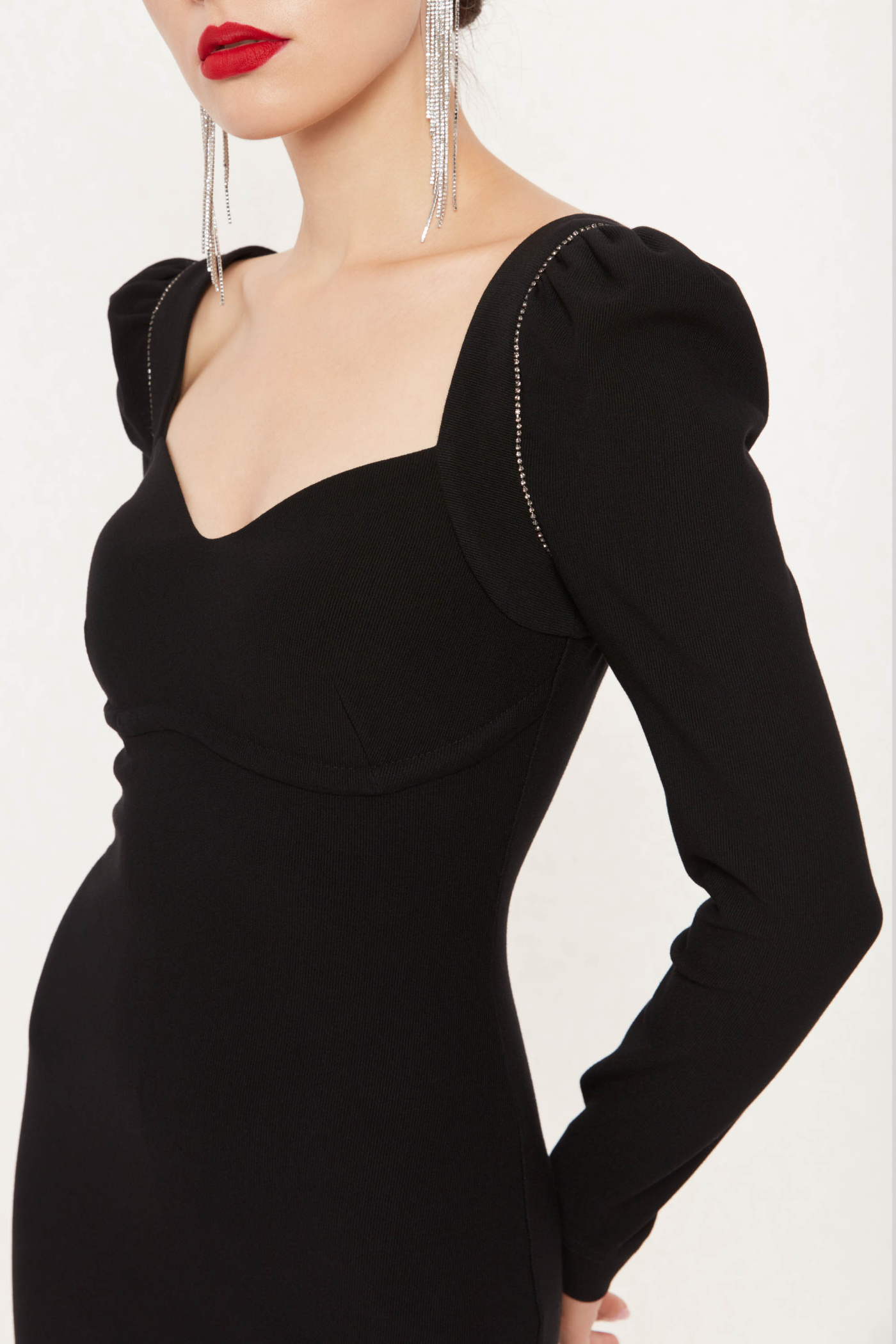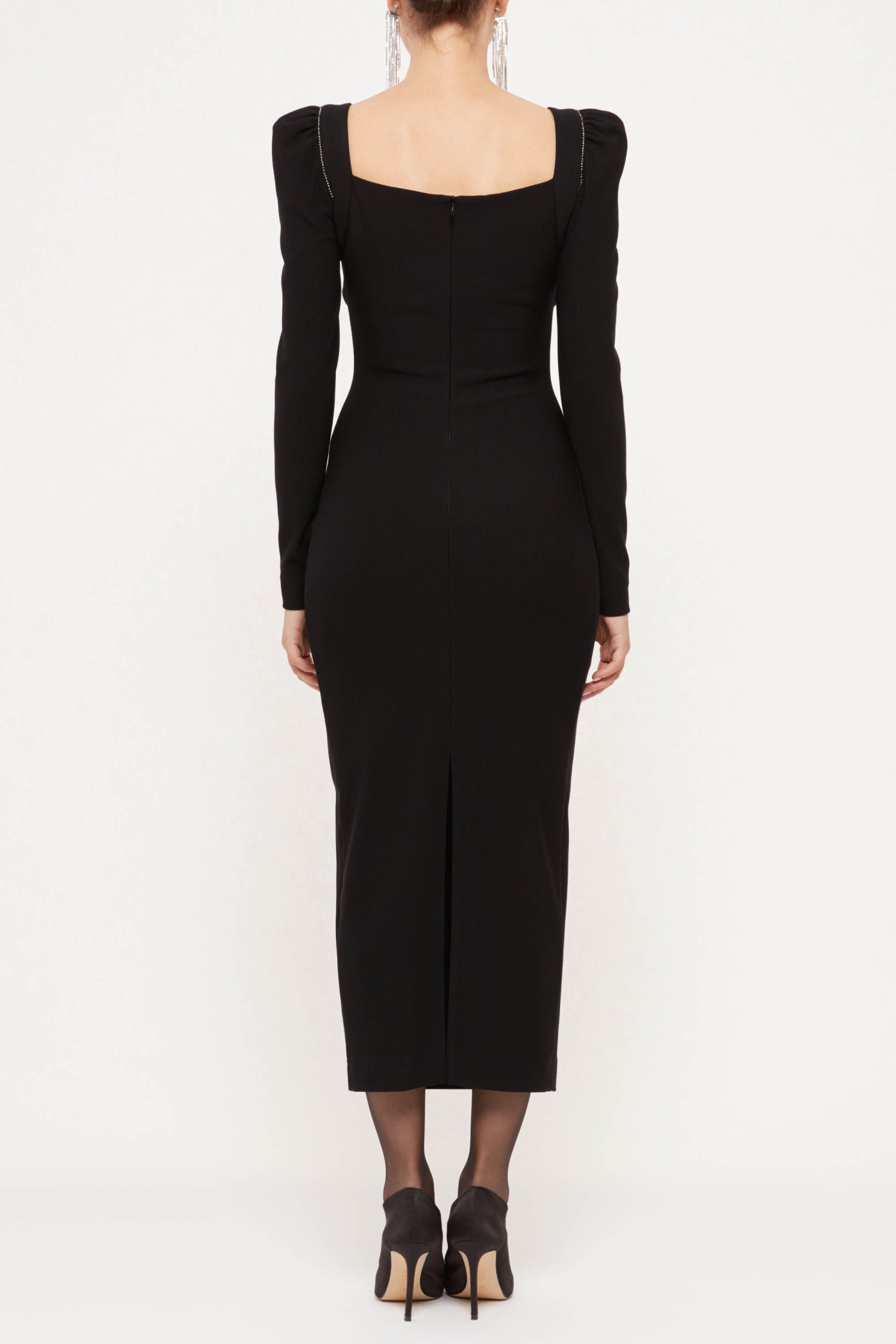 Застежка в среднем шве спинки на потайную молнию, с фигурным вырезом горловины, разрез в нижней части сзади, срезы низа и рукавов не обработаны.