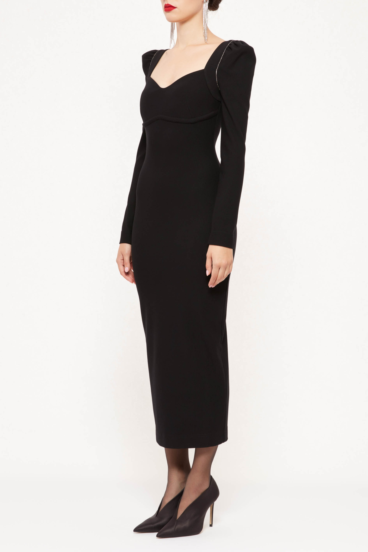 Трикотажное платье макси прилегающего силуэта с длинными рукавами.