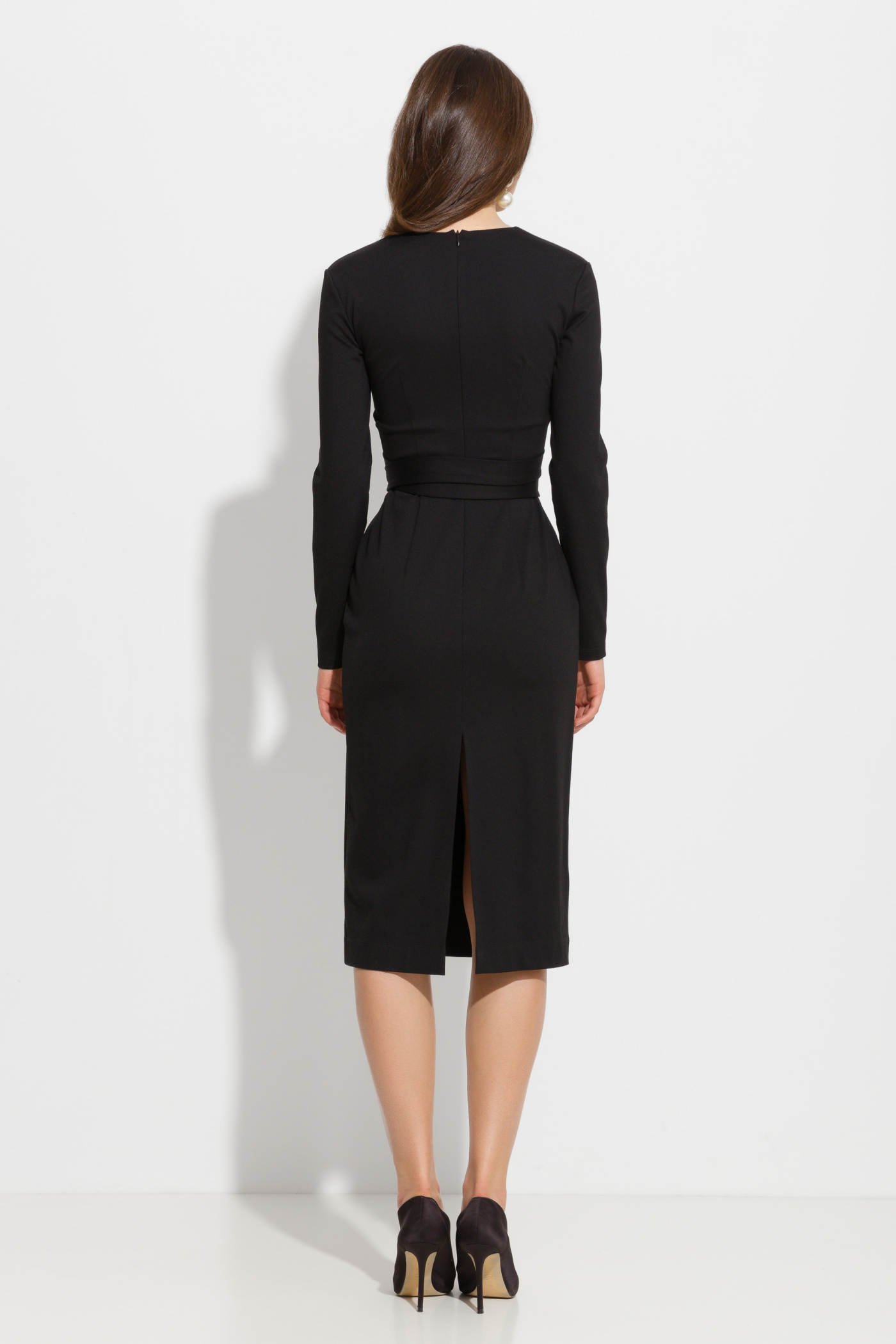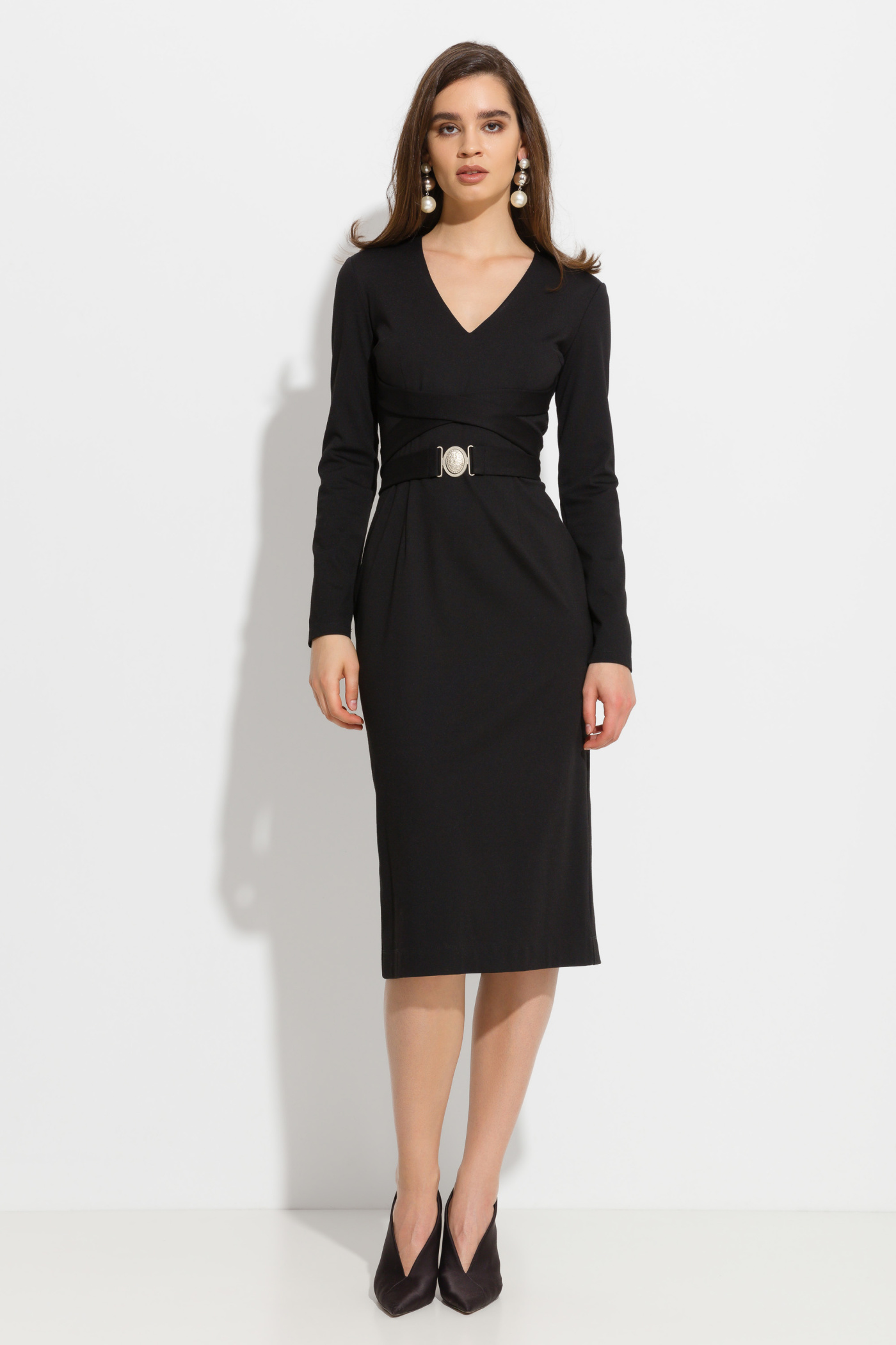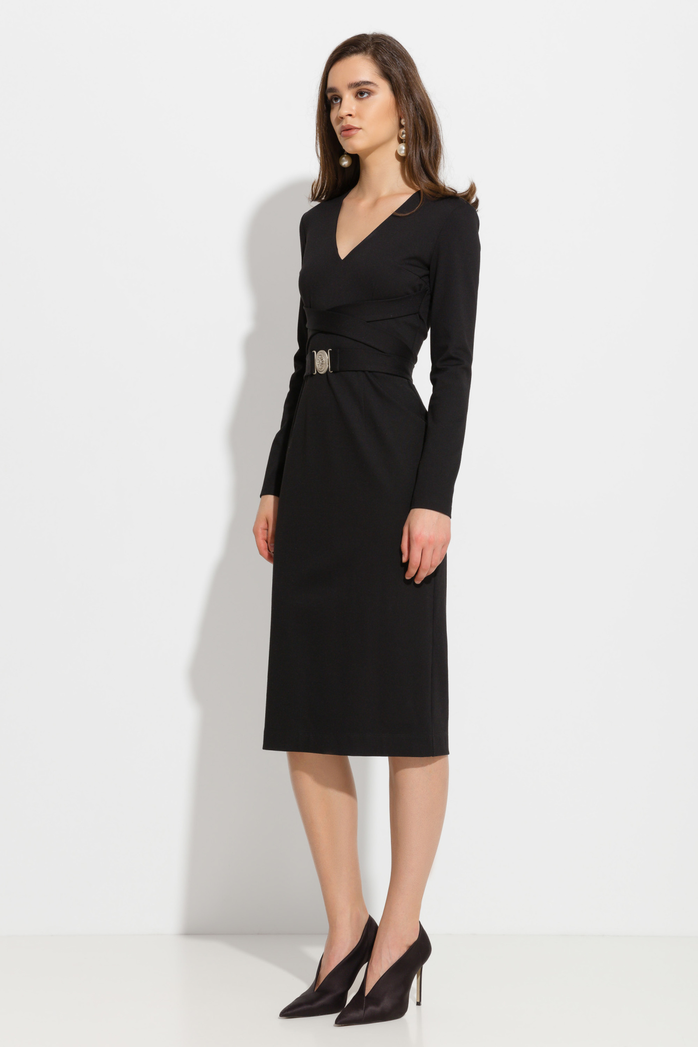 Платье миди полуприлегающего силуэта. V-образный вырез горловины. На талии пояс из аналогичной ткани с металлической застежкой. Длинные рукава. Классическая модель для создания эффектных образов.