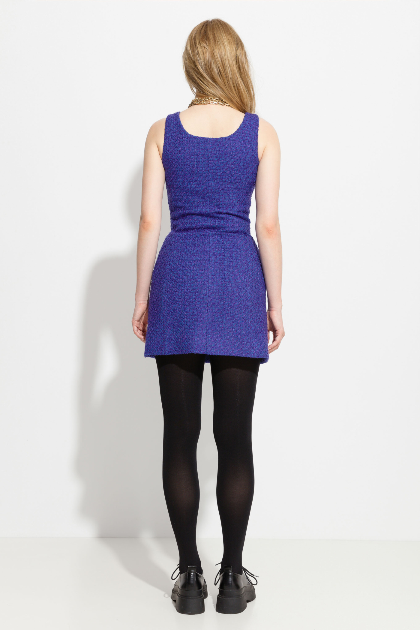 Платье мини твидовое полуприлегающего силуэта. Изделие на широких бретелях. На груди декор в виде вышивки. Юбка А-образного силуэта с разрезами в передней части. Комфортная модель, которая выигрышно подчеркивает силуэт.