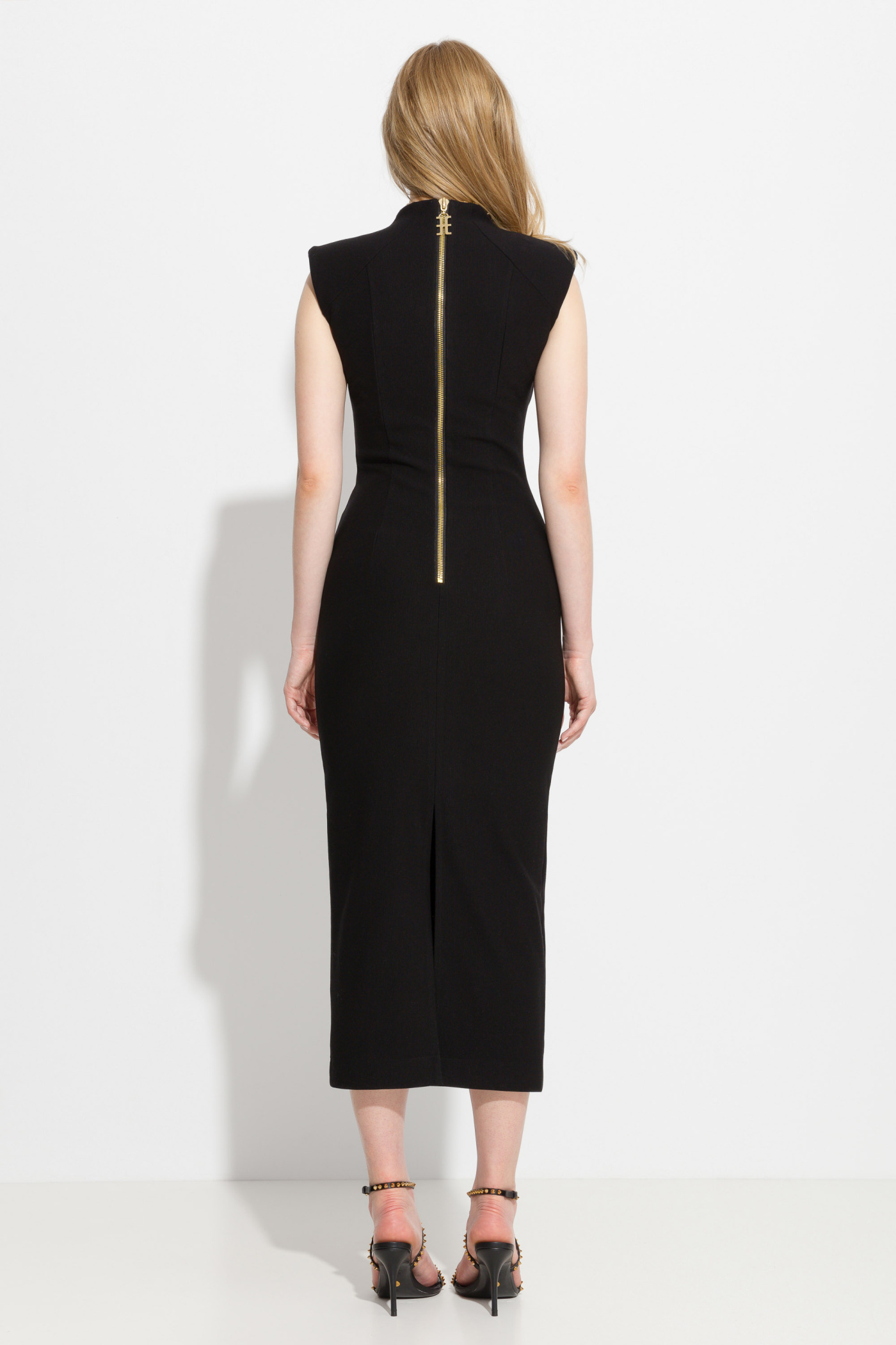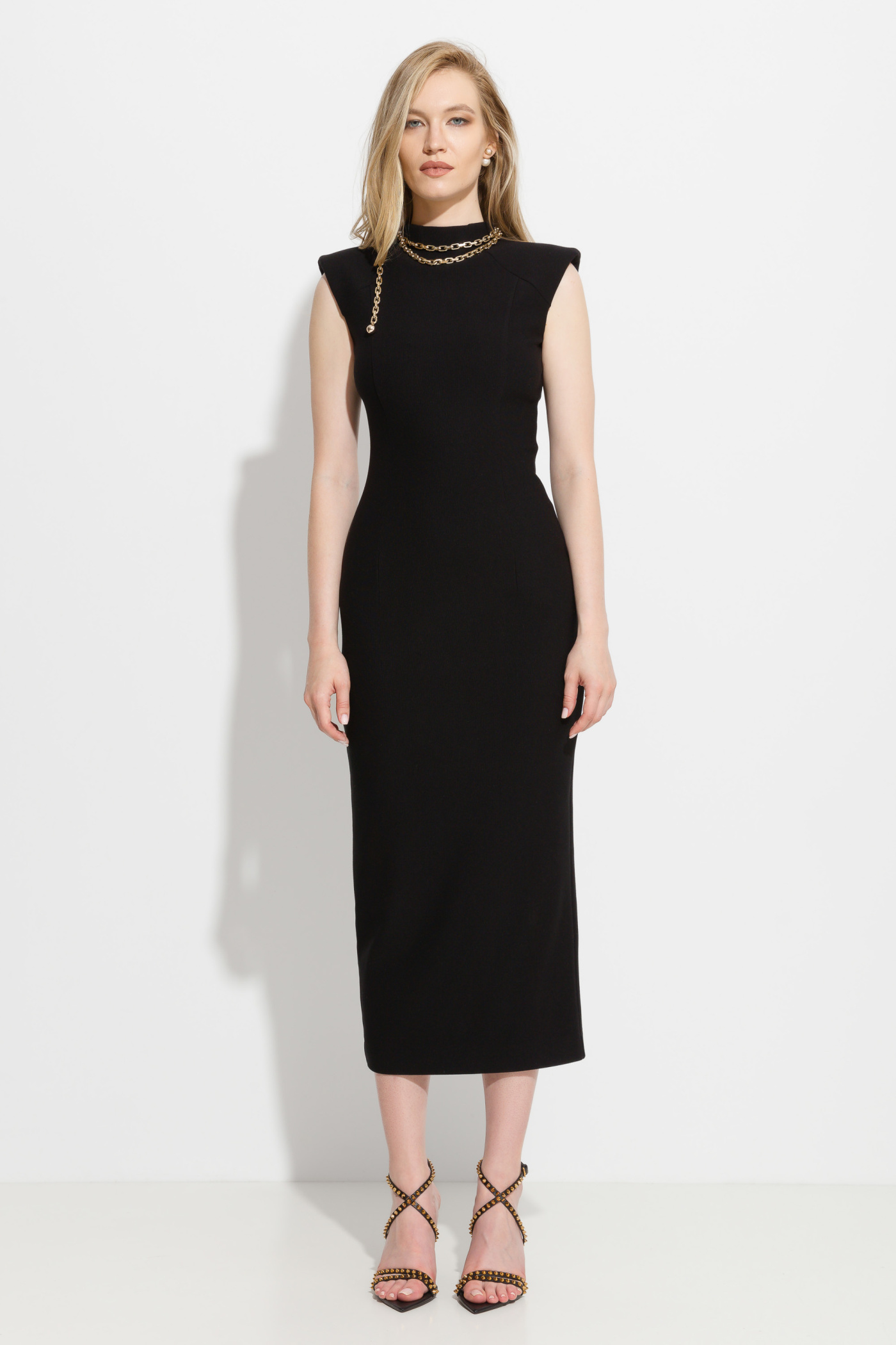 Платье миди прилегающего силуэта. Высокая горловина. Линия плеч расширена, с плечевыми накладками. Застегивается сзади на молнию контрастного цвета. Классическая модель, которая идеально подойдет не только для особых случаев, но и для деловых встреч и ежедневных образов.